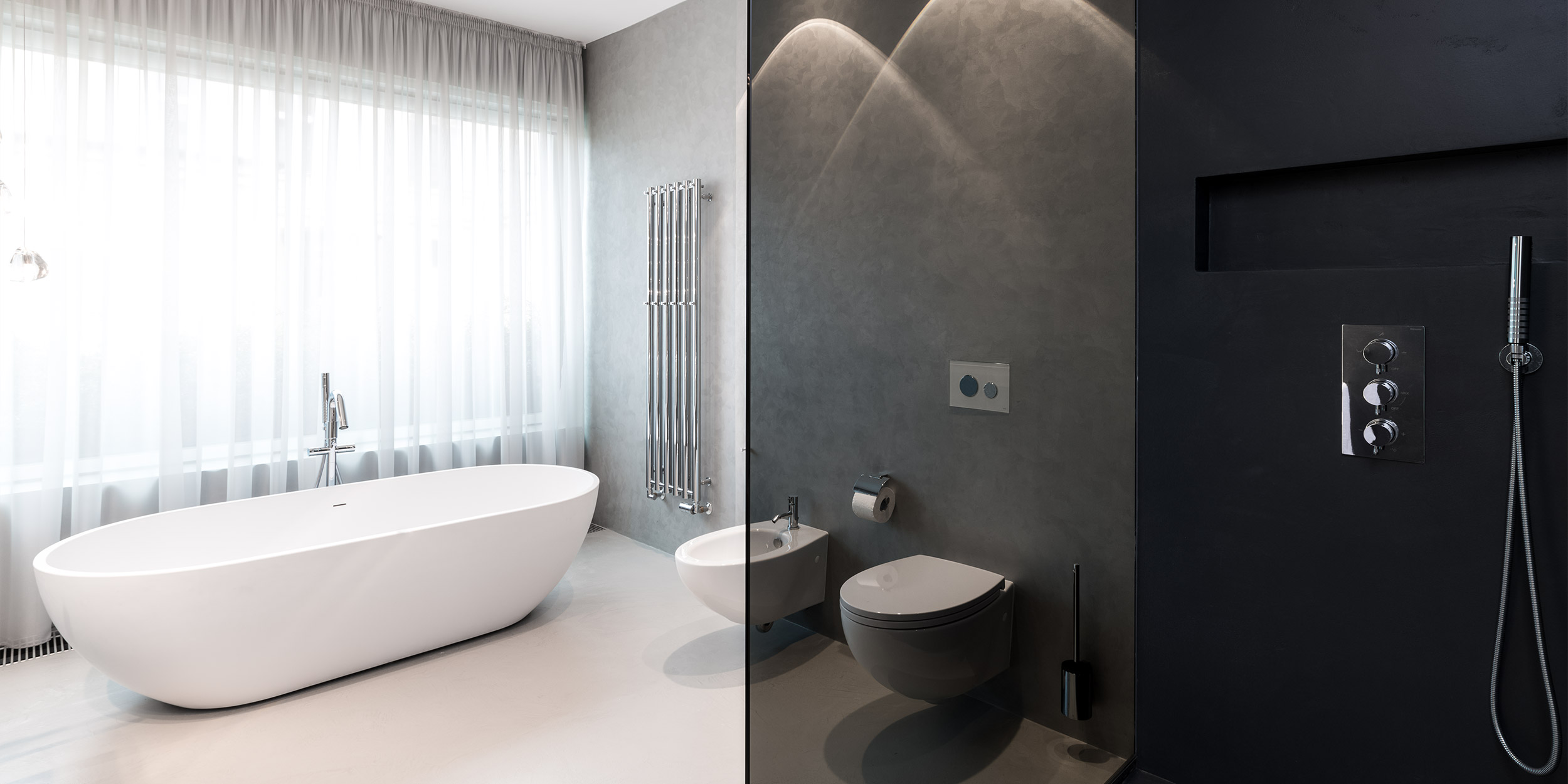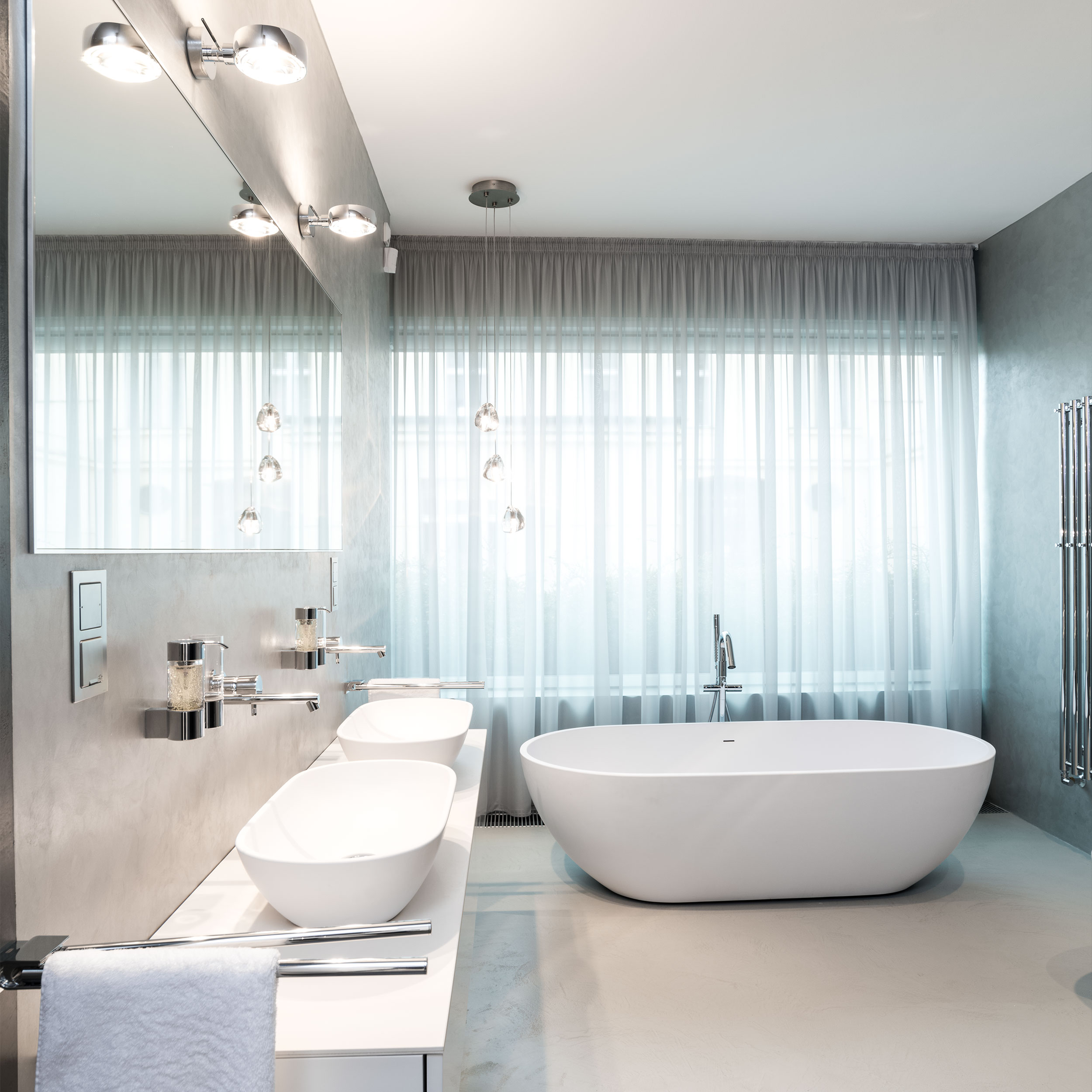 Hlavní koupelna dostala prostor, jaký si zaslouží. Pod oknem stojí volně umístěná vana z litého mramoru, se kterou ladí i umyvadla posazená na desce. Sprcha hned u vstupu je oddělená tmavě šedou stěrkou a kouřovým sklem, což se promítá i do barevnosti podlahy. Nad vanou jsou zavěšená svítidla z masivního skla v organickém tvaru kapek a lehký šedý závěs dodává koupelně měkkost, soukromí i velkorysý dojem.