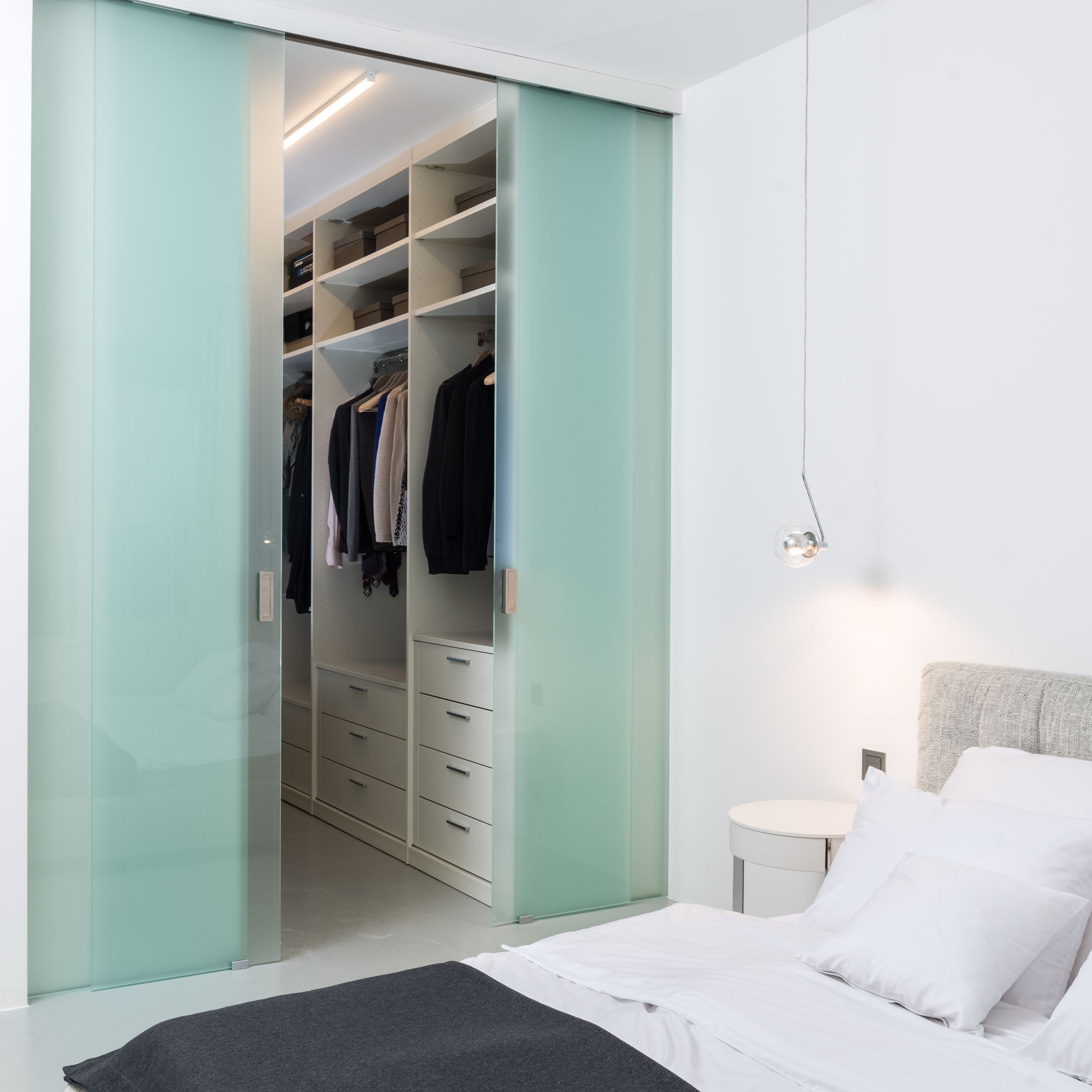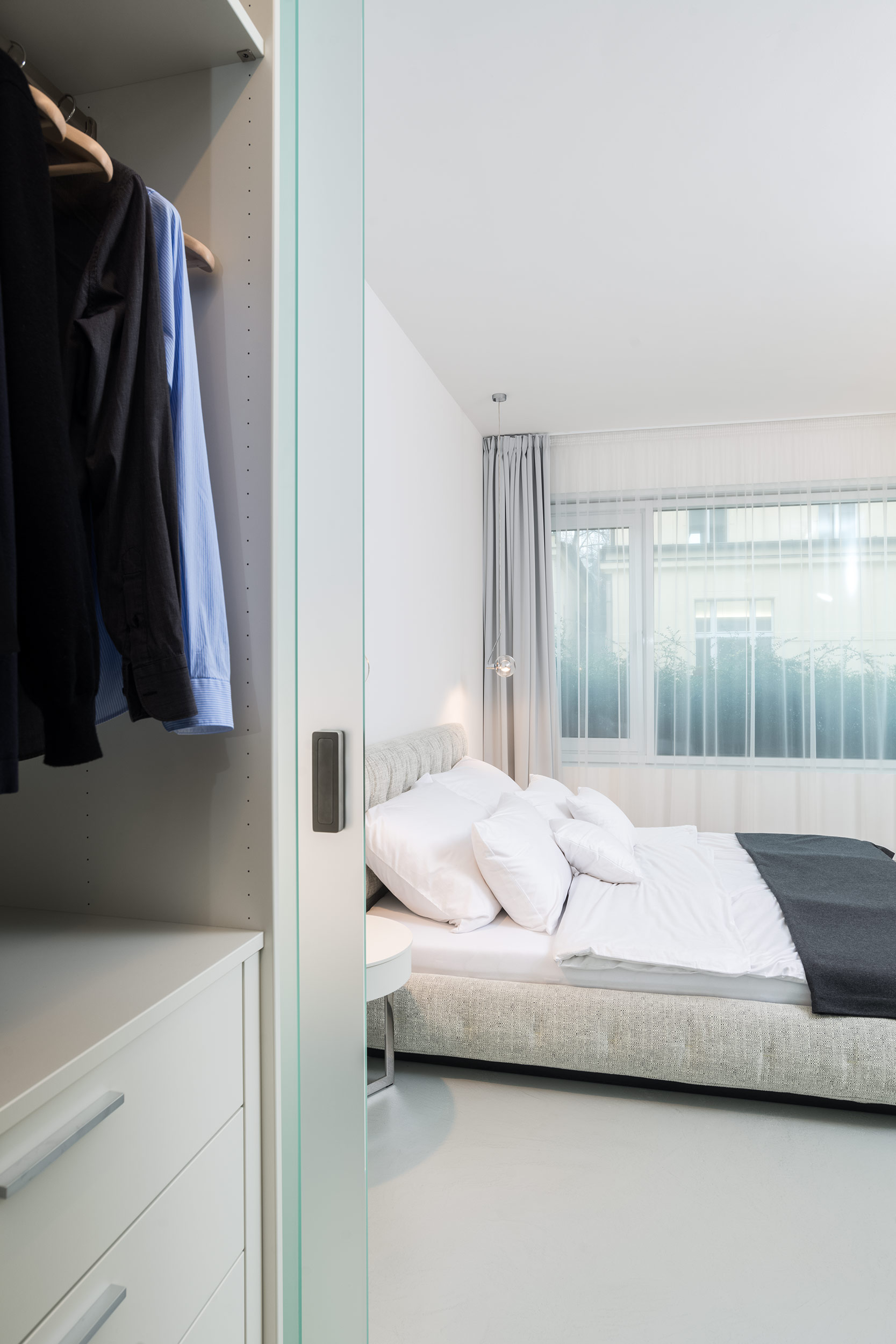 Na hlavní obytný prostor navazují dvě klidové části s ložnicemi. Rodičovská ložnice je světlá, vzdušná a přímo u ní se nachází uzavřená šatna. Postel čalouněná ve světle šedé látce doplňují kulaté noční stolky a zavěšená světla na tenkých tyčkách. Na obývací pokoj navazuje menší TV kout, který snadno poslouží i dětským návštěvám, a malá domácí pracovna s uklidňujícím výhledem do zeleně.