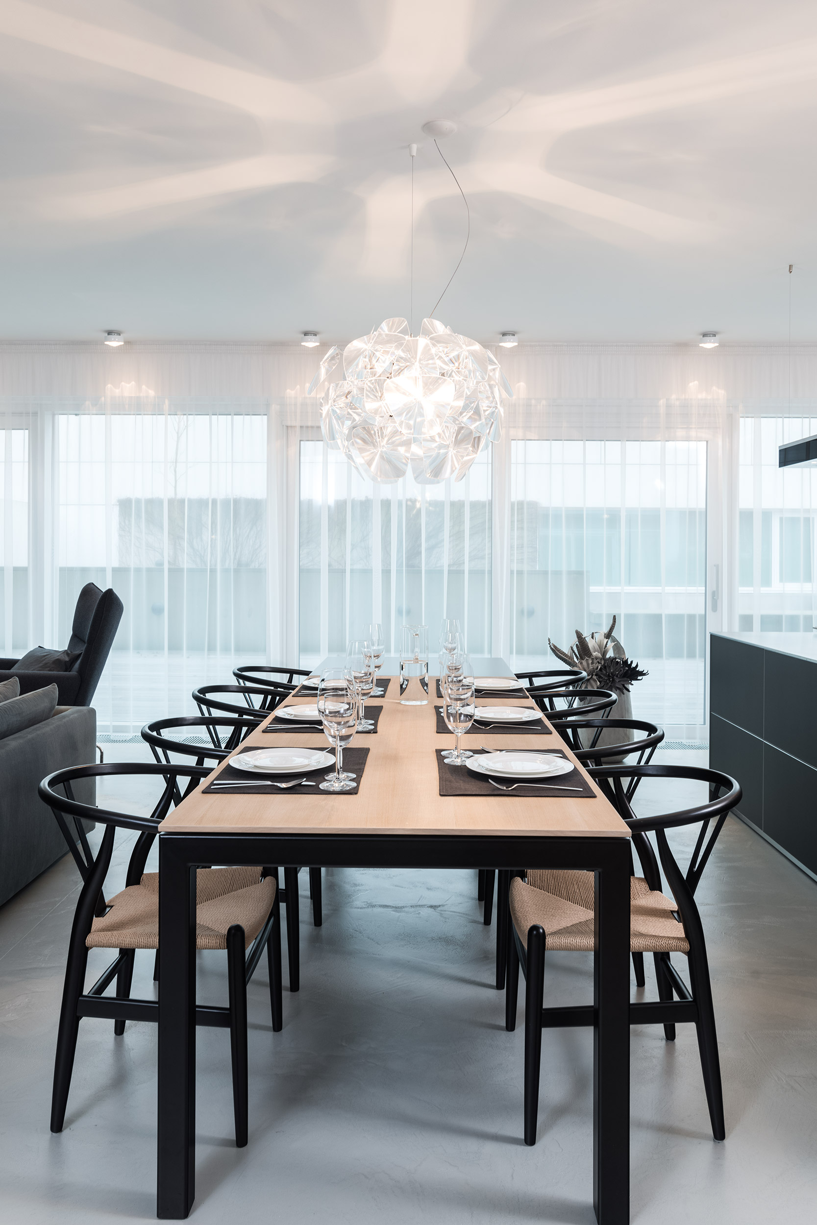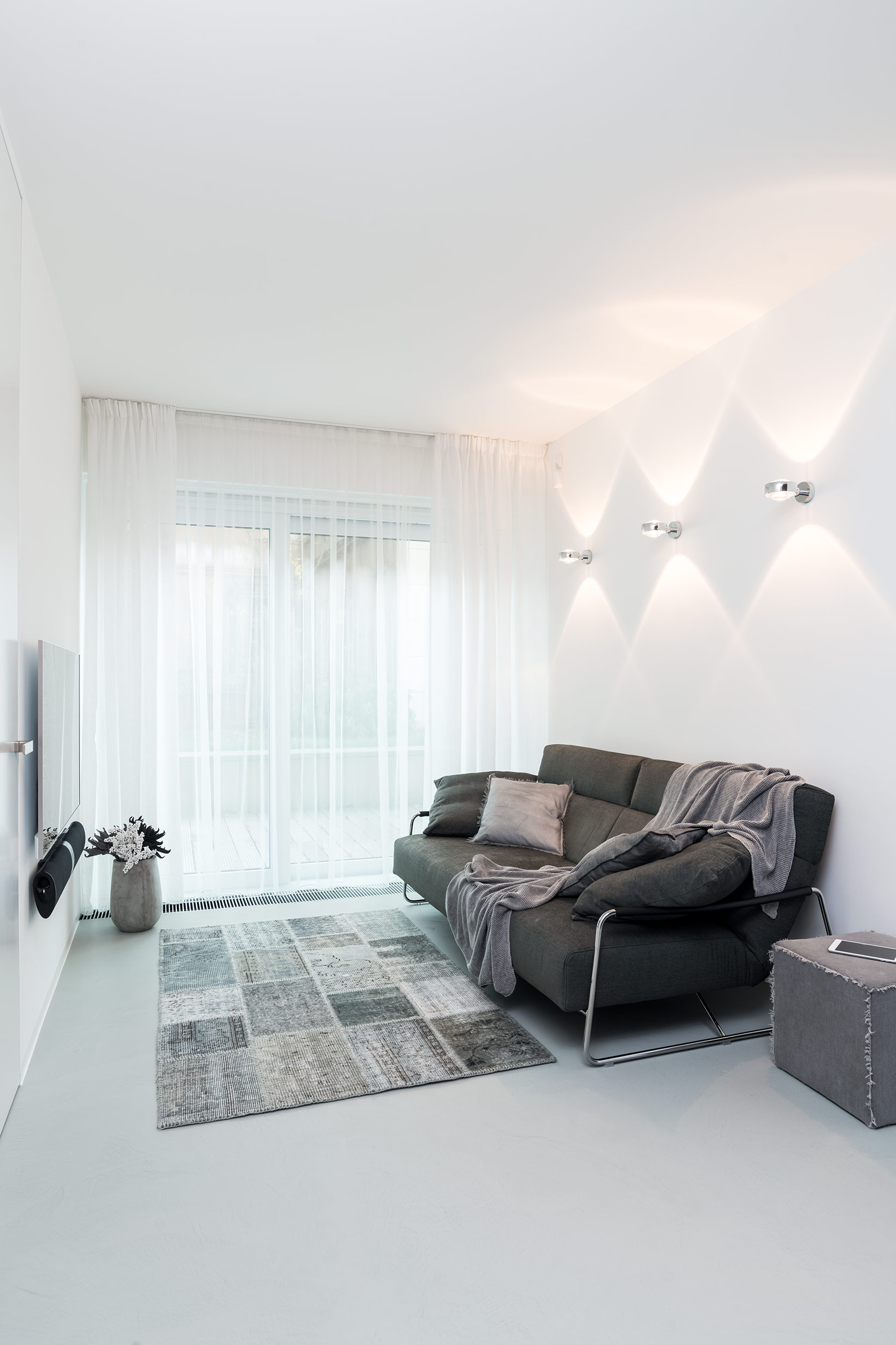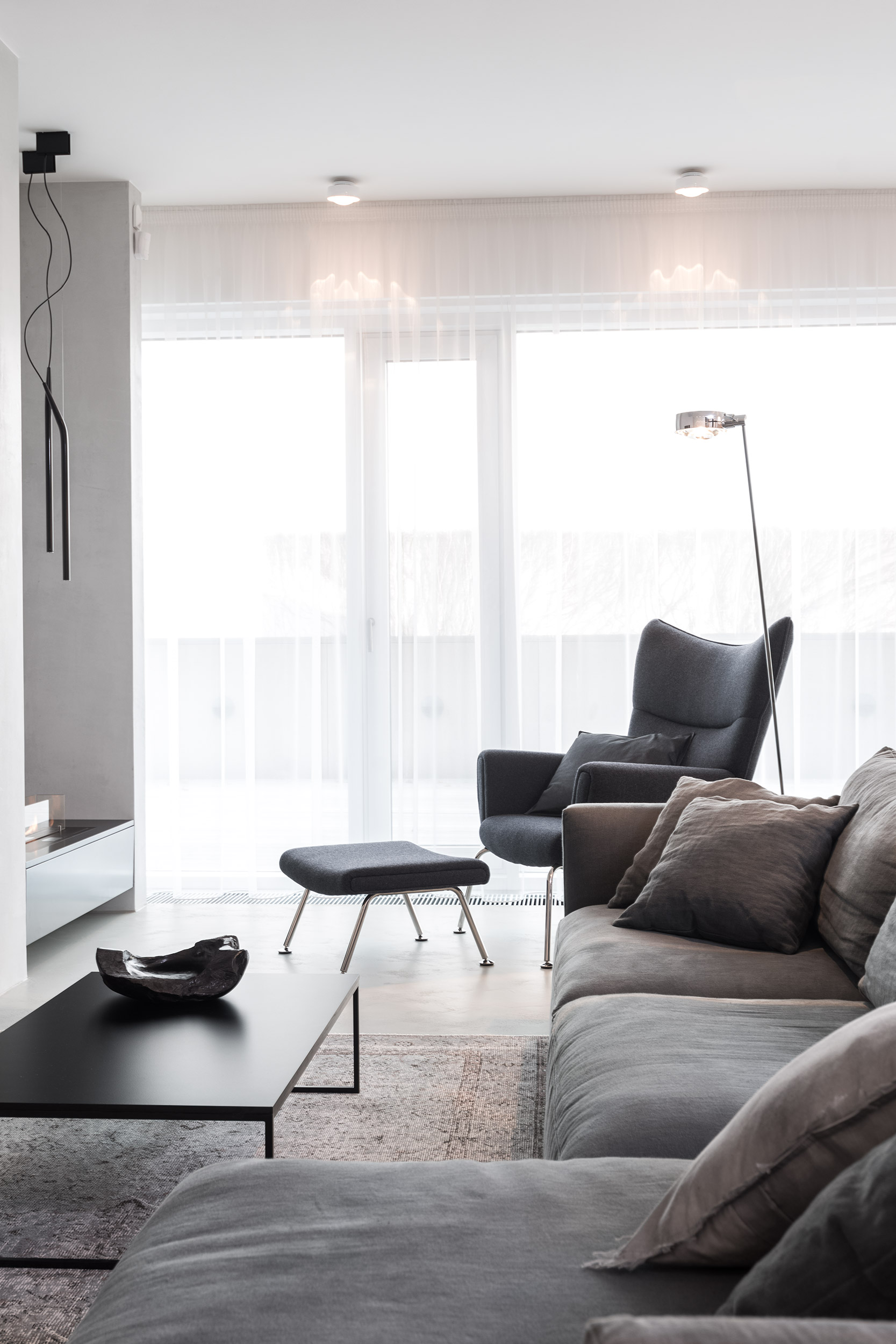 Interiér doplňují jen pečlivě vybrané prvky - polštáře, pletené plédy a vysoké betonové vázy s umělými květy v odstínech šedé, bílé a černé. Nástěnné lampy s tlustou čočkou vytvářejí na stěnách měkkou kresbu světla. Velká okna jsme zjemnili lehkými šedými závěsy, které prostor opticky změkčují, ale nepřidávají mu nic navíc - jen rovnováhu, kterou potřebuje.