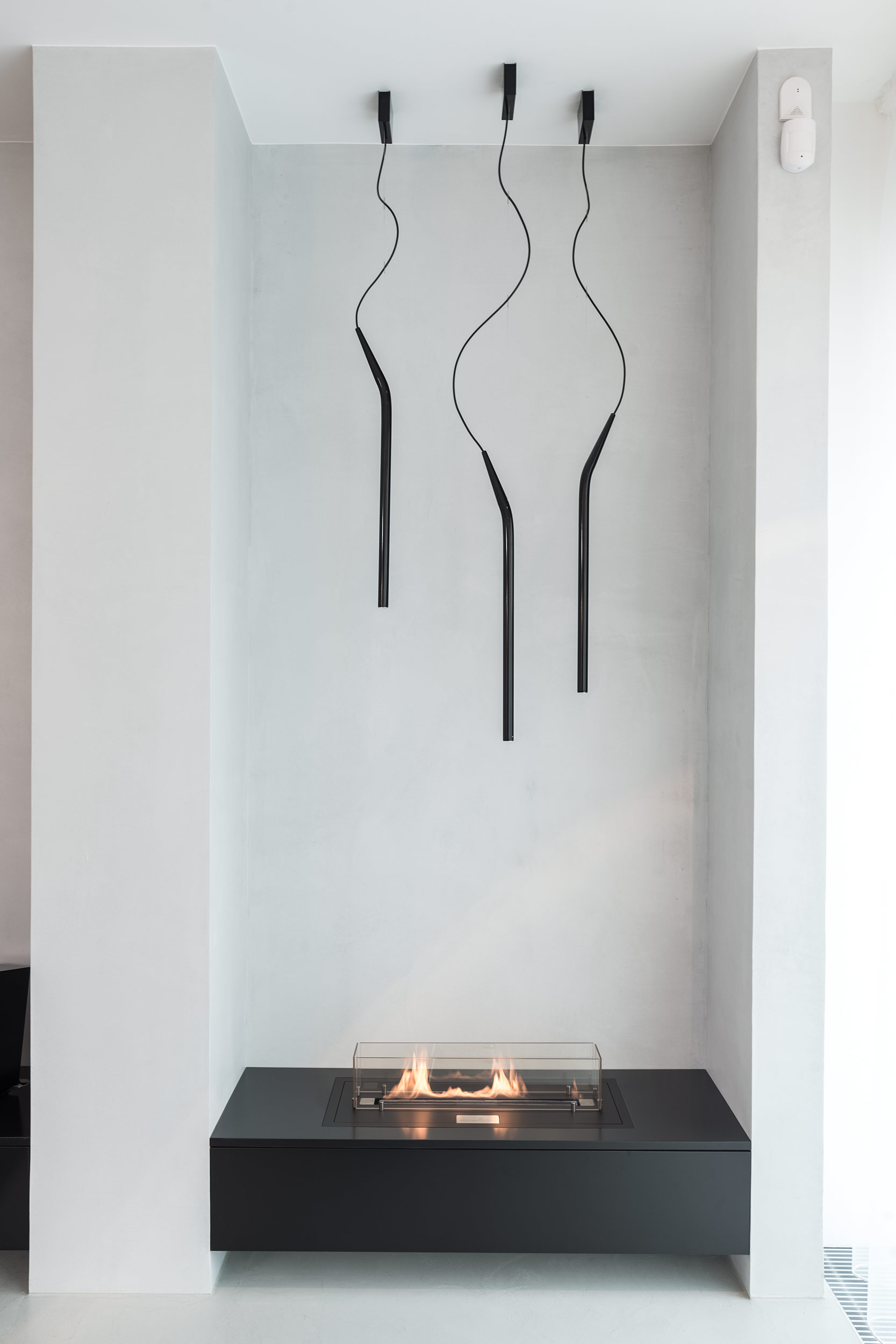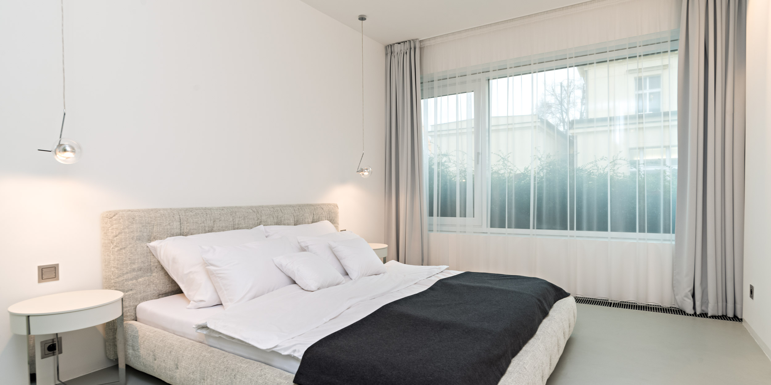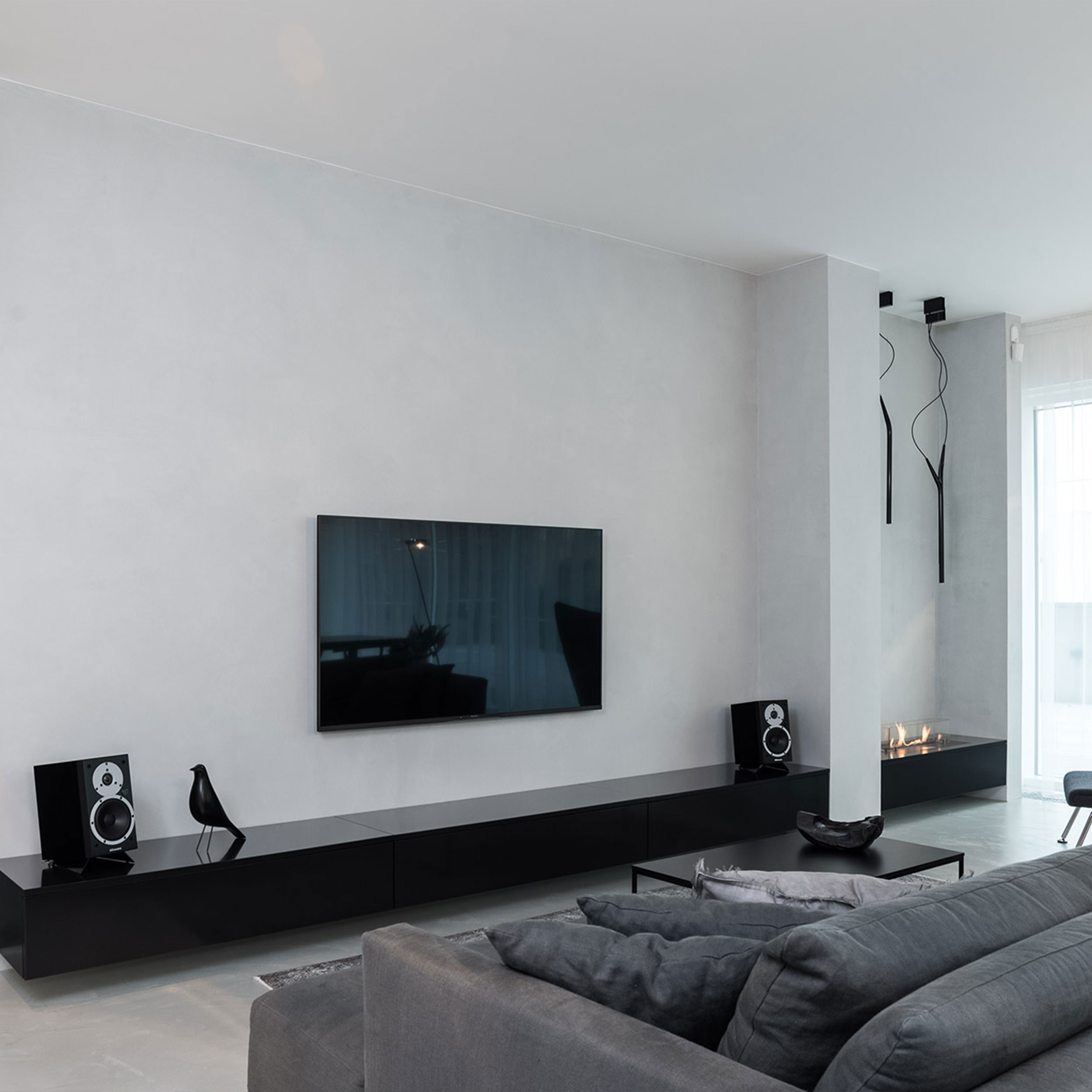 Interiér doplňují jen pečlivě vybrané prvky - polštáře, pletené plédy a vysoké betonové vázy s umělými květy v odstínech šedé, bílé a černé. Nástěnné lampy s tlustou čočkou vytvářejí na stěnách měkkou kresbu světla. Velká okna jsme zjemnili lehkými šedými závěsy, které prostor opticky změkčují, ale nepřidávají mu nic navíc - jen rovnováhu, kterou potřebuje.