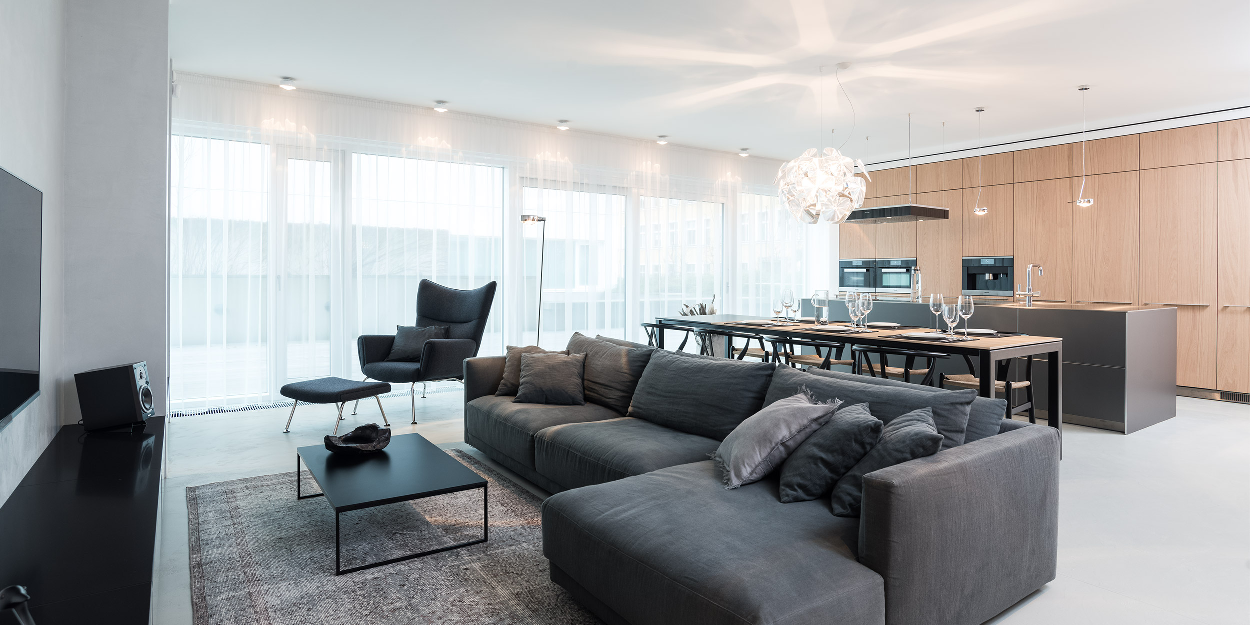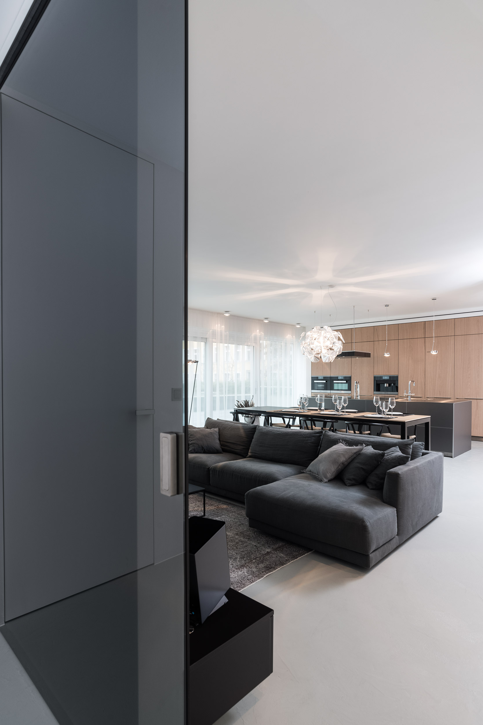 Byt v novostavbě jsme převzali jako prázdnou skořápku – bez příček, bez podlah, bez rozvodů. Mohli jsme tedy vytvořit dispozici přesně podle představ klientů. Vznikl otevřený minimalistický prostor, kde hlavní roli hrají betonové stěrky, přírodní dub a precizně zpracované detaily. Celý interiér je laděný v tónech šedé s jediným kontrastem – teplým tónem dřeva.