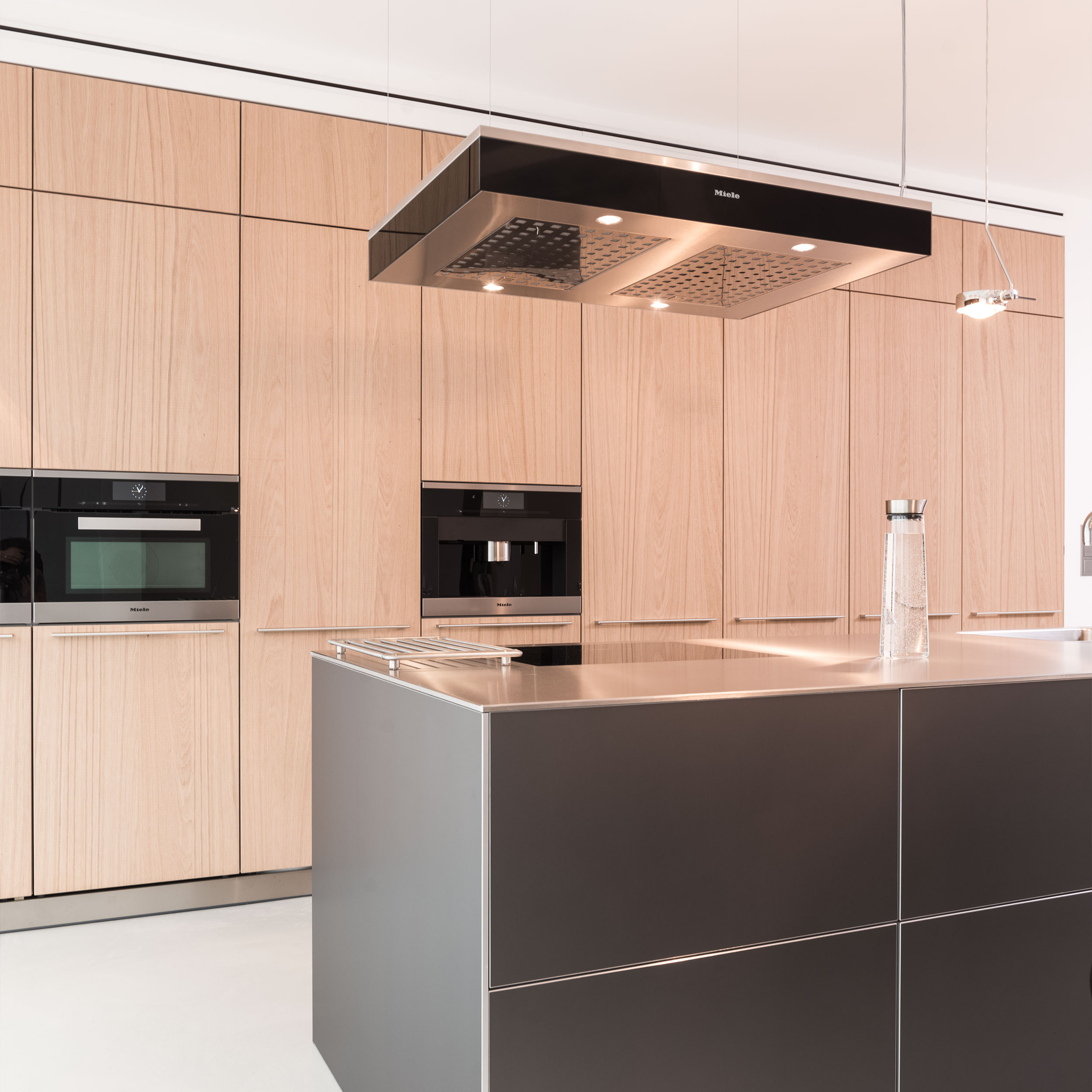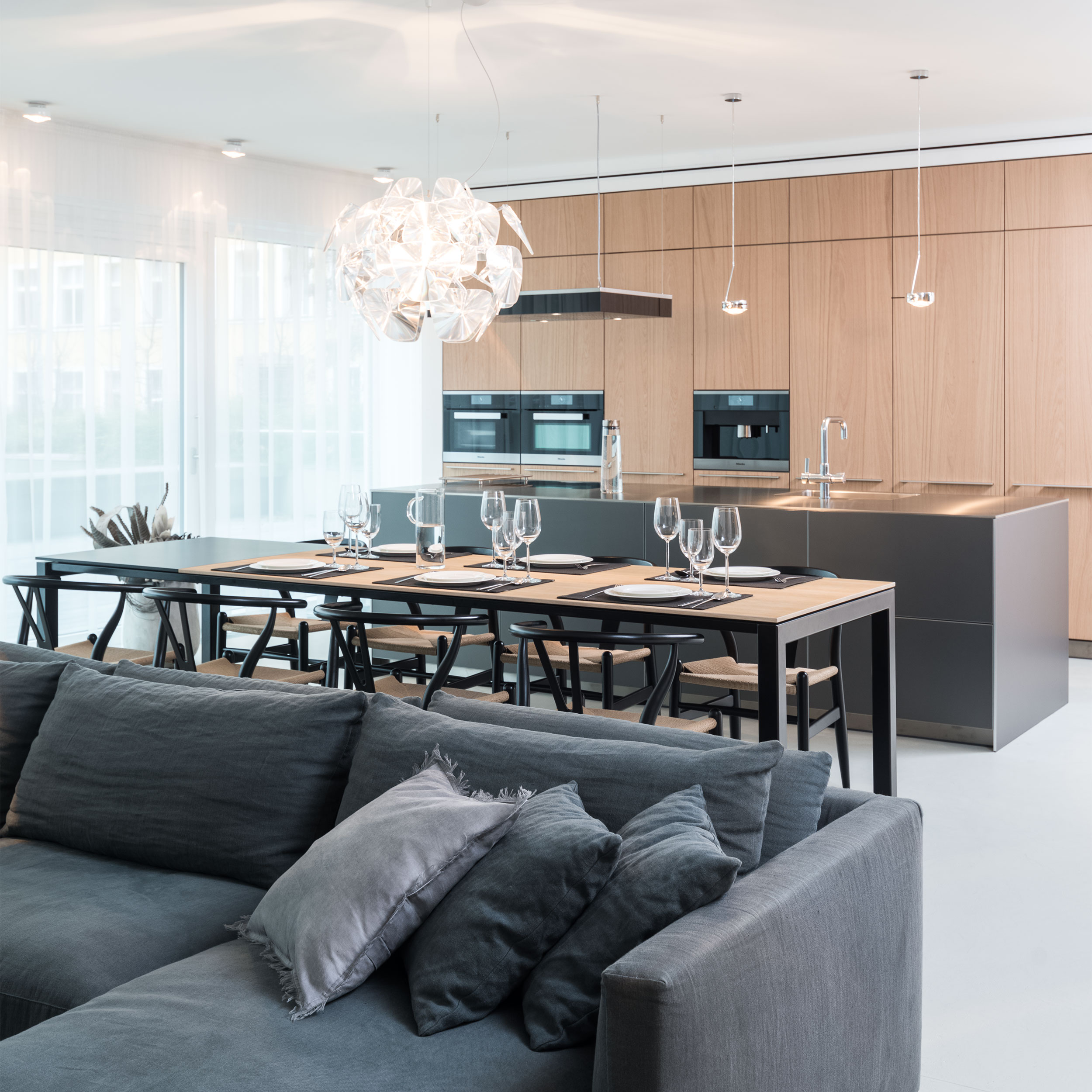 Srdcem bytu je kuchyně. Šedý ostrůvek s broušenou hliníkovou deskou staženou i po bocích působí jako jeden kompaktní objekt. Vysoké skříně z drásané katrované dubové dýhy tvoří jeho přirozené pozadí a materiálově navazují na dlouhý jídelní stůl v kombinaci dubu a černého laku.