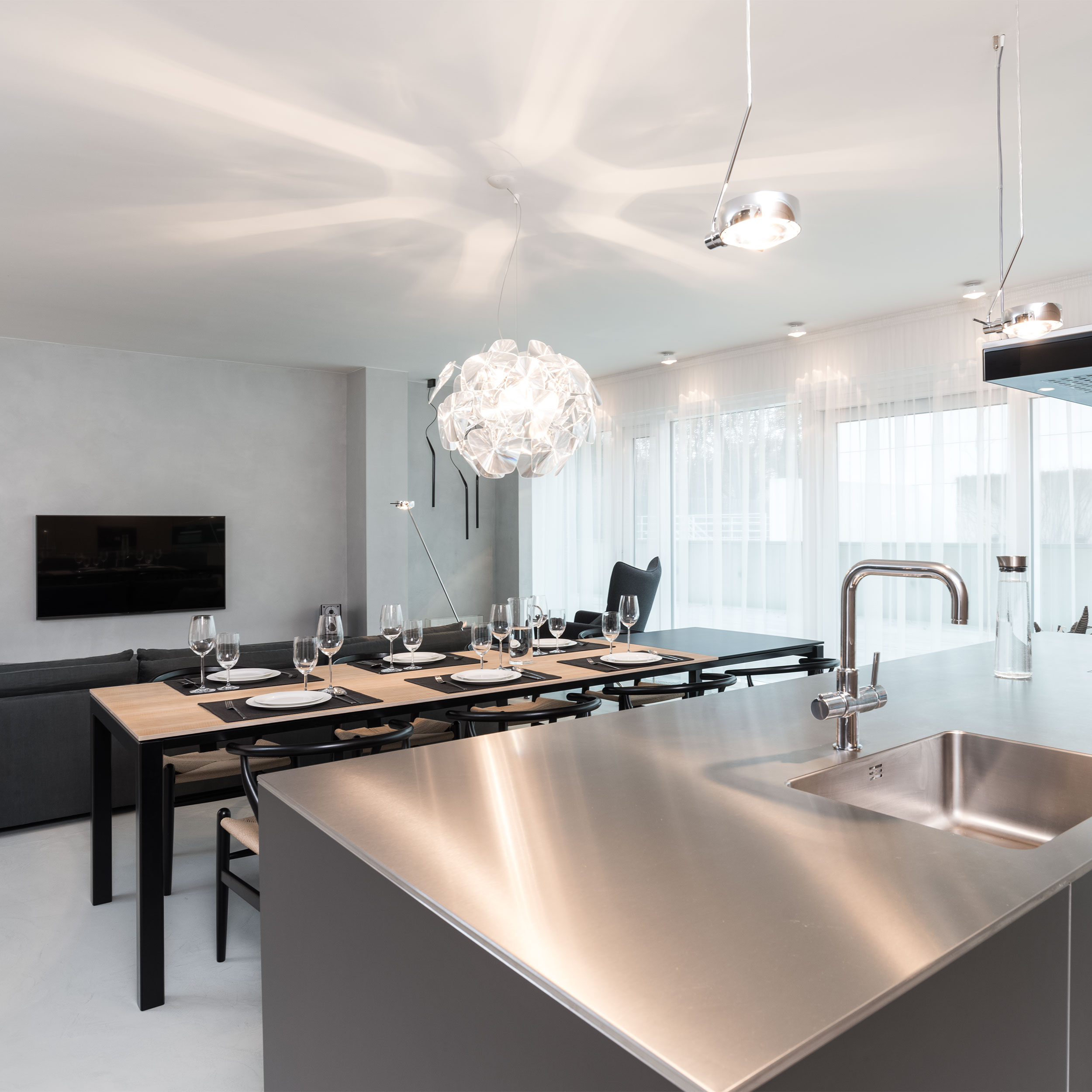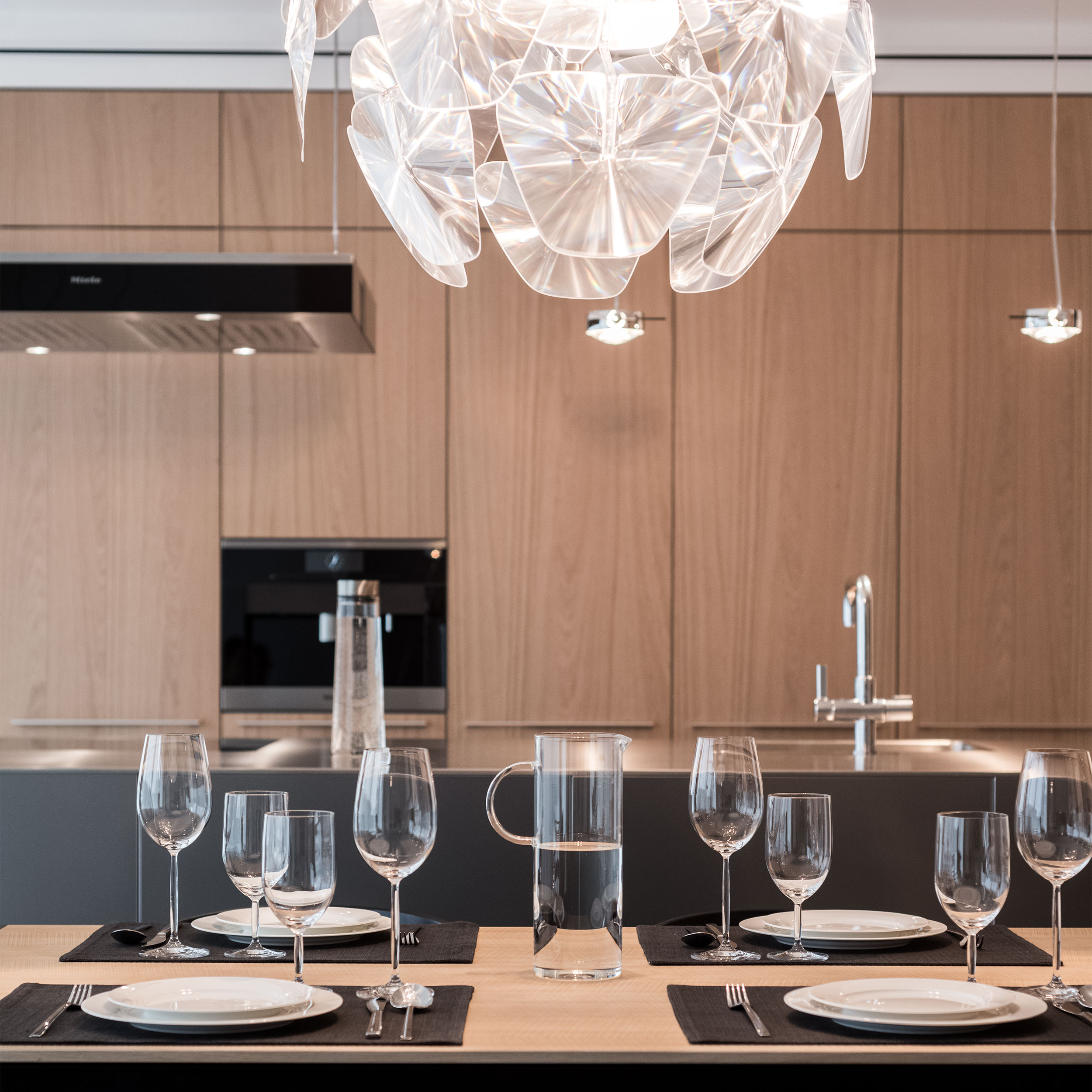 Minimalistickou linku záměrně narušuje jediné hravé gesto - svítidlo nad stolem, tvarované jako obrácený květ z polykarbonátu. Lom světla a měkké odlesky vytvářejí jemný kontrast ke zbytku přísně střízlivého prostoru.