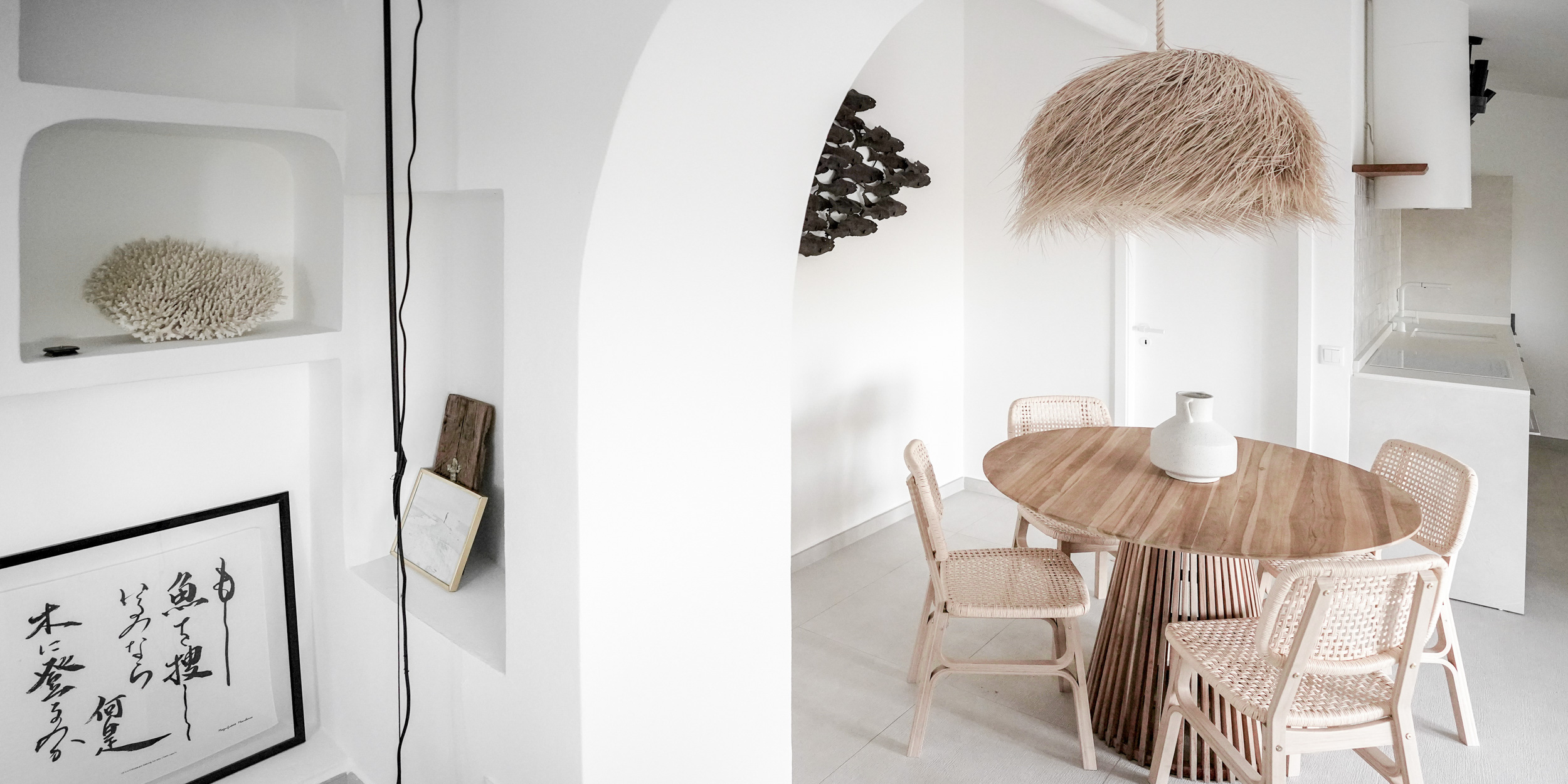 S ohledem na lokalitu jsme se rozhodli pro plážový styl interiéru domu, takže kombinace bílé a lehce světlého přírodního dřeva a trávy. Zkusíme si prostě něco jiného, než industriálně minimalistický interiér jako doma. Naladit se na takové materiály bylo vlastně strašně příjemné. Změna je zajímavá. Cílem bylo udělat jednoduchý přívětivý prostor v přírodních tónech s místními materiály. Asi největší plážovou dominantou prostoru je velký trávový lustr nad jídelním stolem. Abych klienta na tento styl přesvědčila, rezervovali jsme si Avenida Hotel v Lagos. Pak už to šlo jako po drátkách.