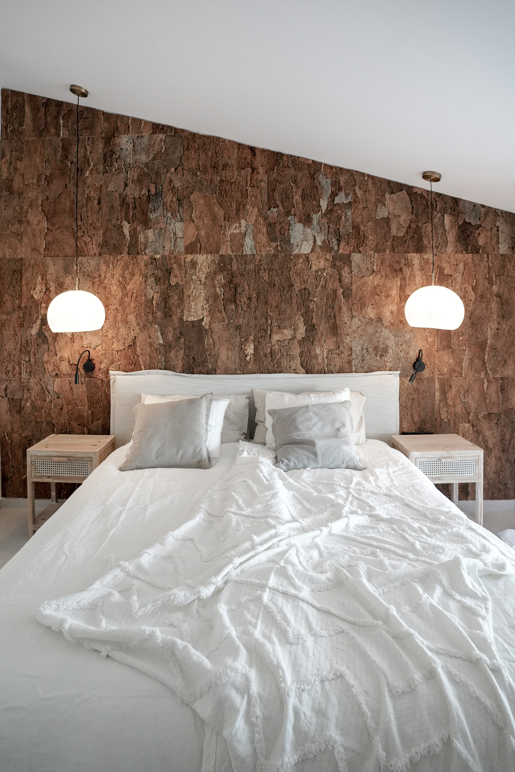 Jedním z nejzajímavějších materiálů použitých v interiéru se pak stal přírodní korek. Korkovníky rostou všude v okolí, proto se tento materiál nabízel. Většina nabídky korků jsou ovšem klasické desky, které ničím zajímavé nejsou. Opakem je pak surová korková kůra. Trochu zklamáním pak bylo, že ten „portugalský“ korek přijel z Polska.