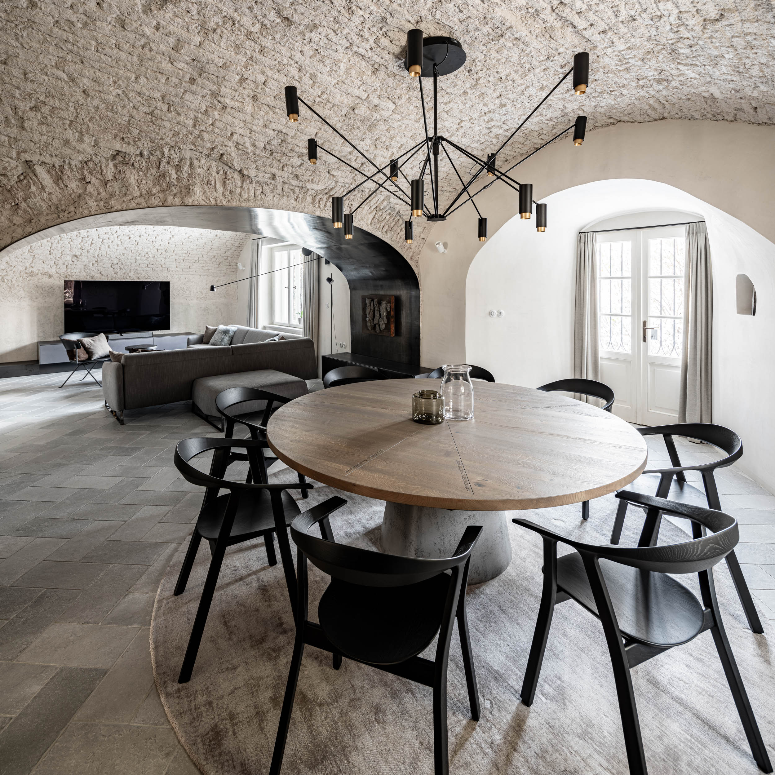 Klenby byl prvek, který nás zaujal hned při první návštěvě. Bylo to těsně před omítnutím a to by byla škoda. Ponechání kleneb dodalo prostoru na dramatičnosti a zvýraznilo historický odkaz. Klenby byly zpevněny pomocí helikálních výztuží a vývody pro světla jsou provedené z horního patra, abychom zachovali klenby vizuálně kompaktní.