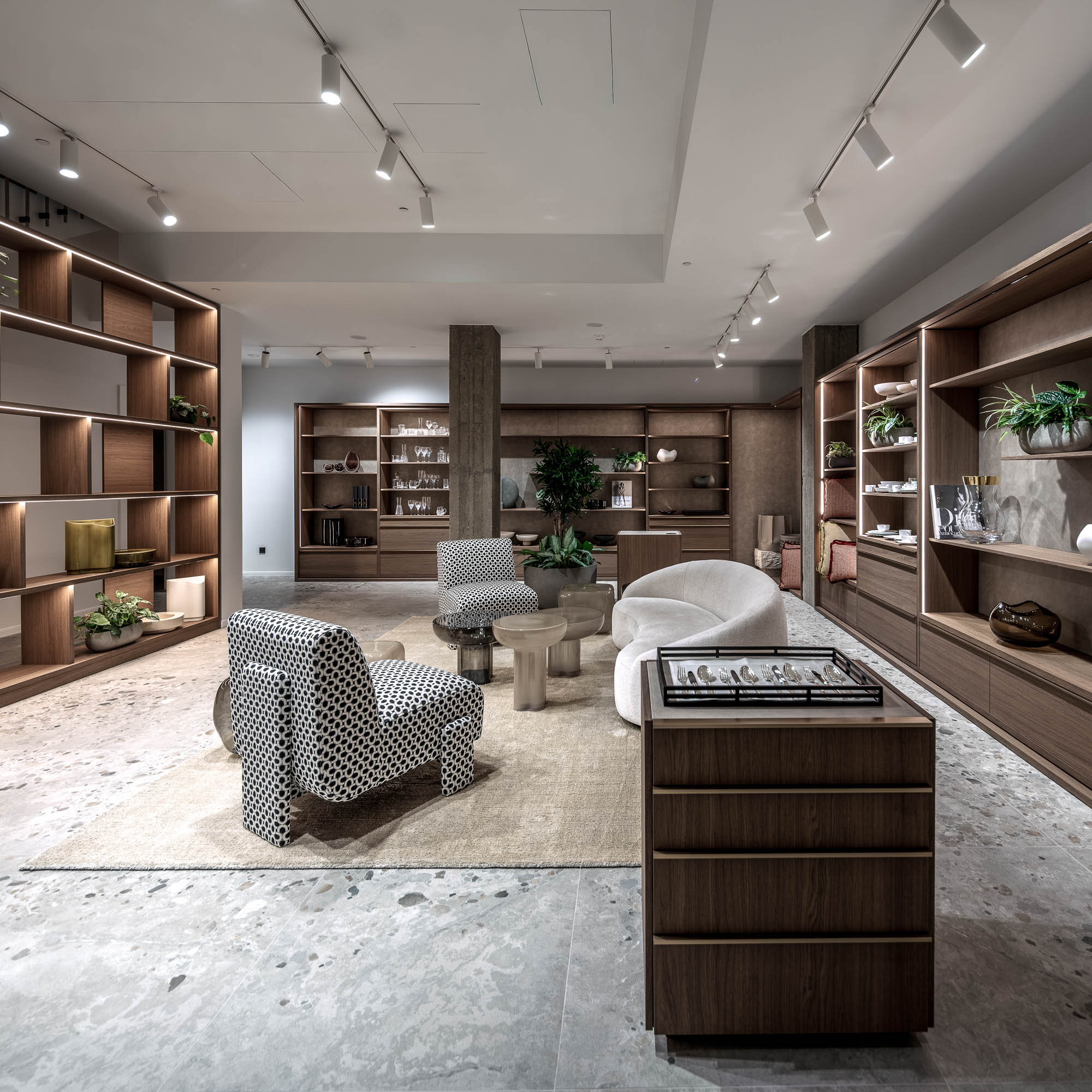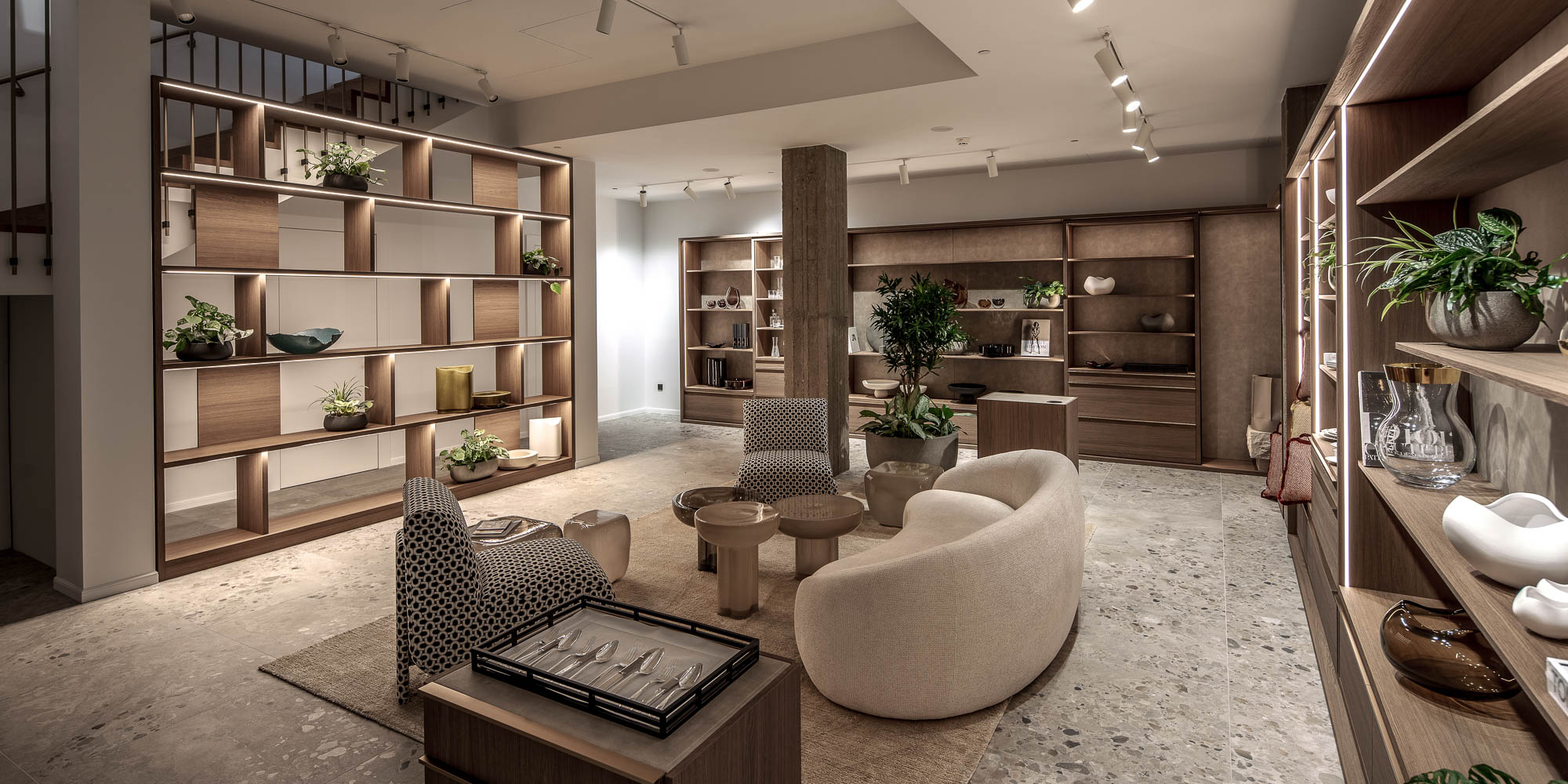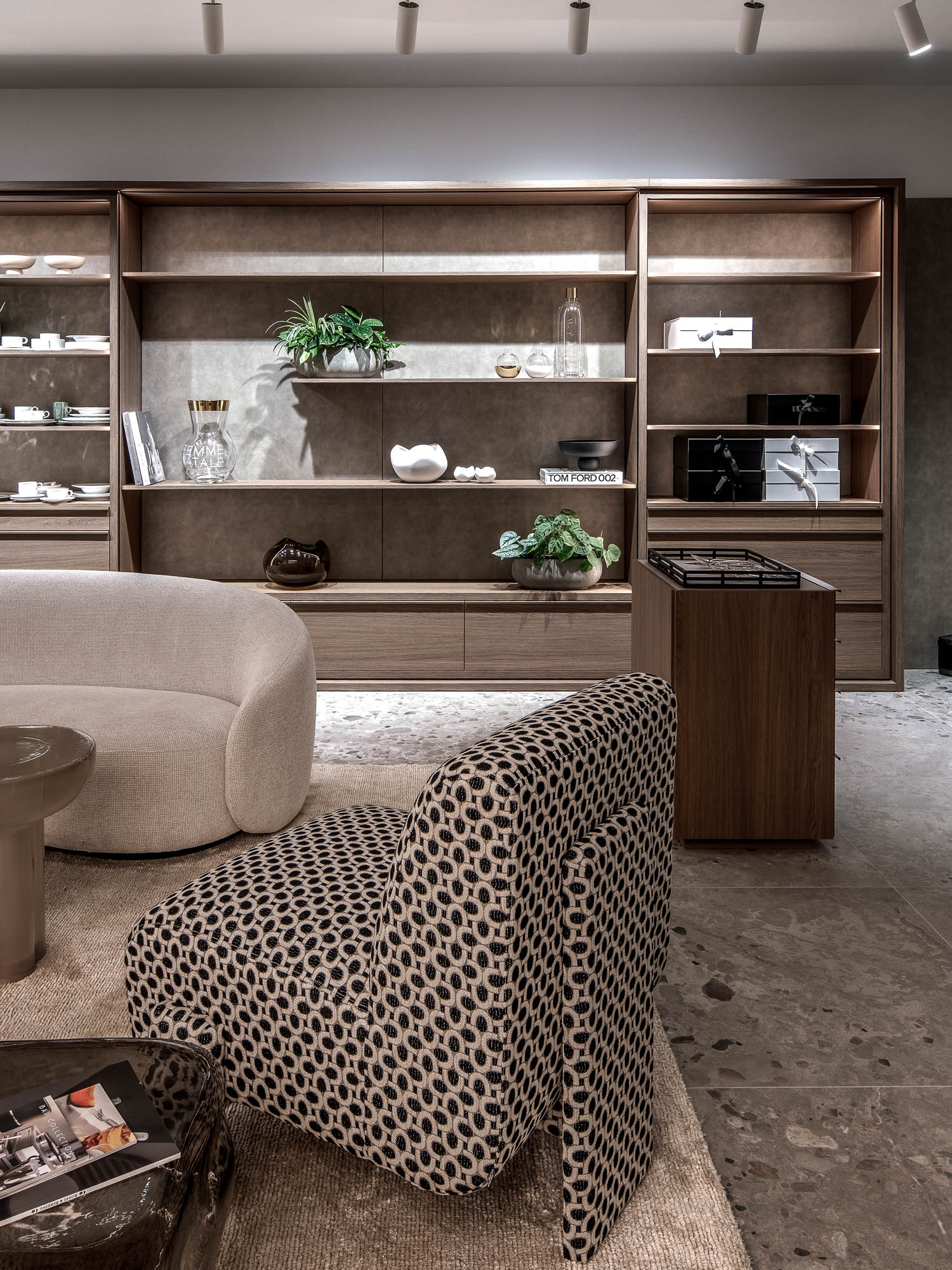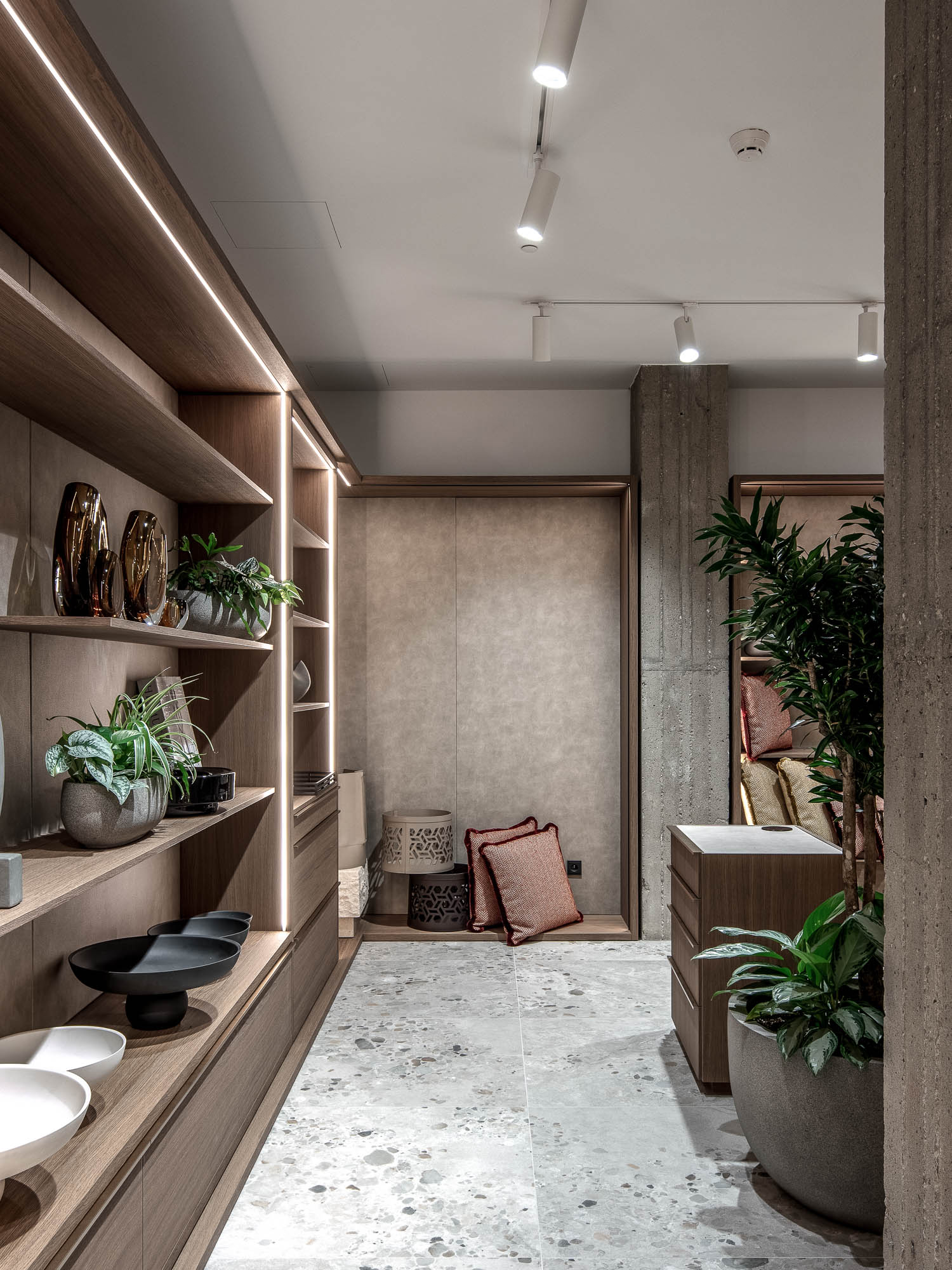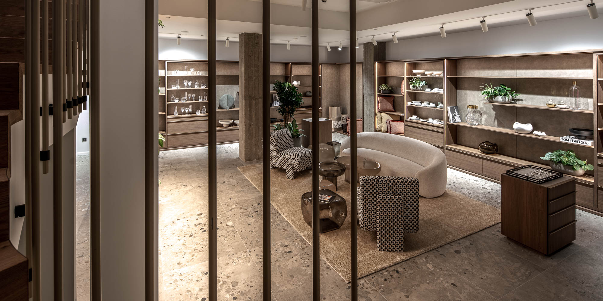 Také v této realizaci se opakuje princip intimnější části, tentokrát umístěné v suterénu. Je to klidnější poloha celého showroomu. Prostor se sedačkou, dalšími policemi na produkty a možností jednání, kde se tempo butiku záměrně zpomalí. Nenavazuje na hlavní část kopírováním, ale stejnou atmosféru překládá do civilnější, komornější podoby. Je to místo, kde se neřeší jen vystavení zboží, ale i setkání, rozhovor a čas strávený nad výběrem.