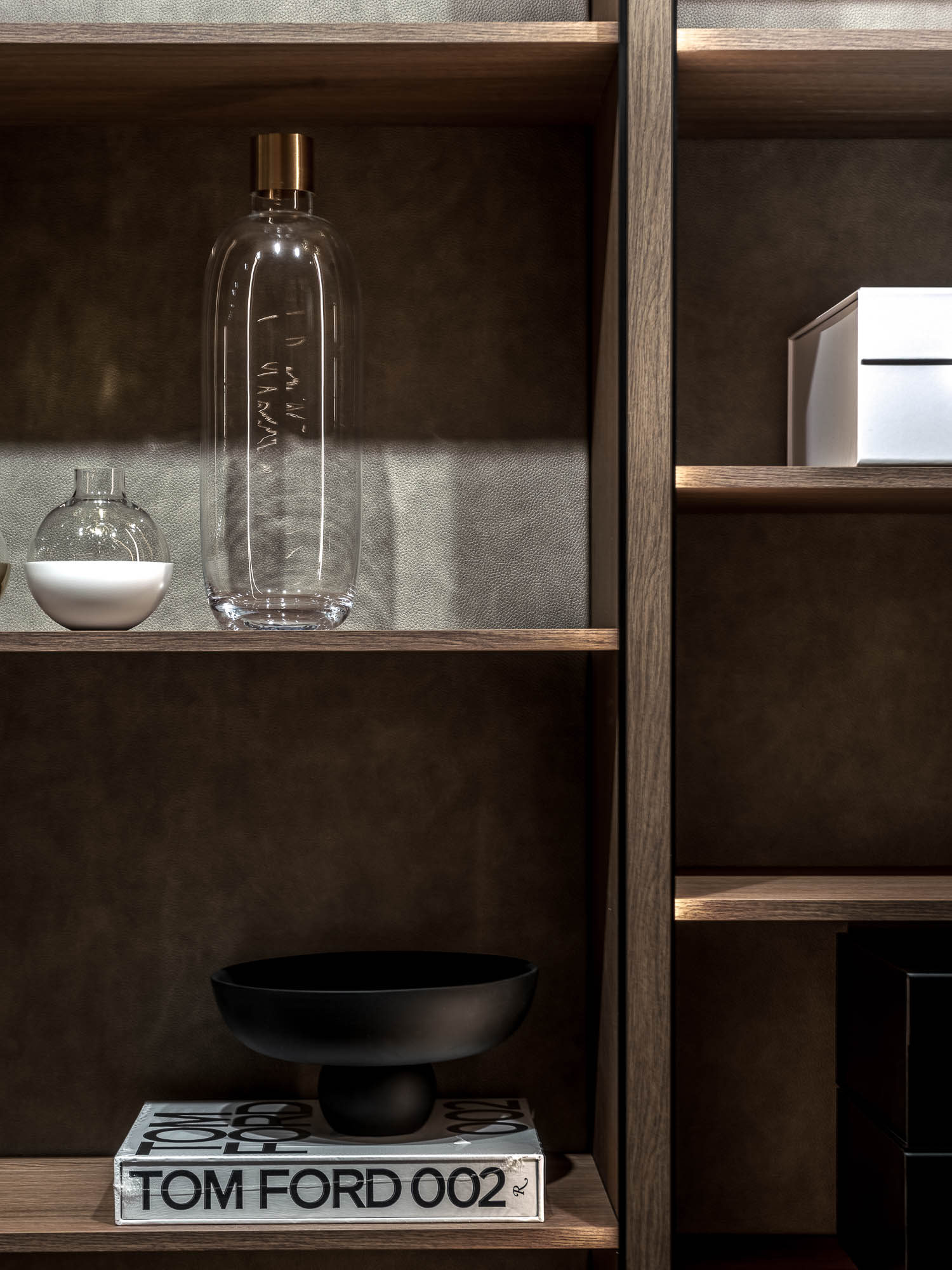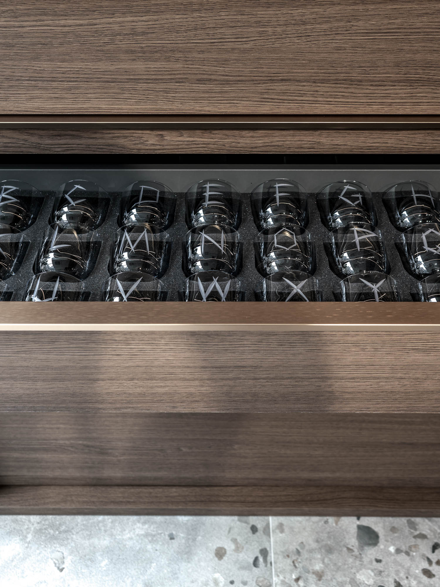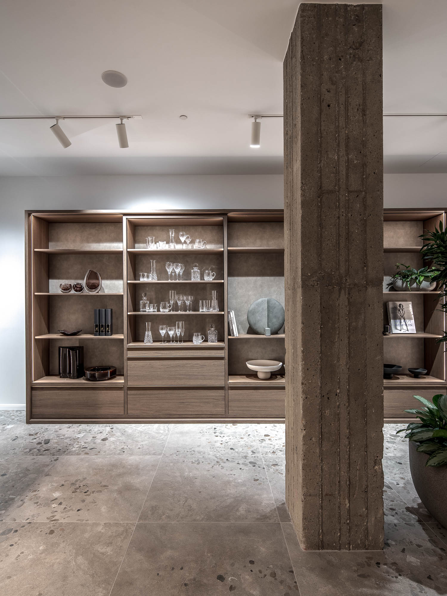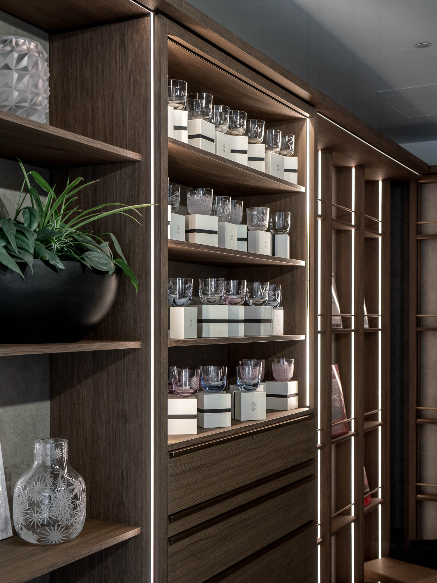 Veškerý vestavný nábytek určený pro vystavení produktů jsme navrhli ze speciálního lamina v teplém odstínu, které je od dýhy téměř k nerozeznání. Po brutalistním obalu prostoru je to právě ta vrstva, která interiér kultivuje a dává mu správnou míru luxusu. Záda nik doplňuje koženka, která celek změkčuje a zároveň přidává hloubku i haptický rozměr. Všechny police i skříně jsou po celém obvodu nasvětlené, takže vystavené objekty dostávají přesný, ale neagresivní rám. A pak jsou tu detaily, které návštěvník možná nevnímá hned, ale právě ony dělají rozdíl — třeba zásuvky na skleničky s vyřezávaným molitanem, kde má každá věc své pevné místo.