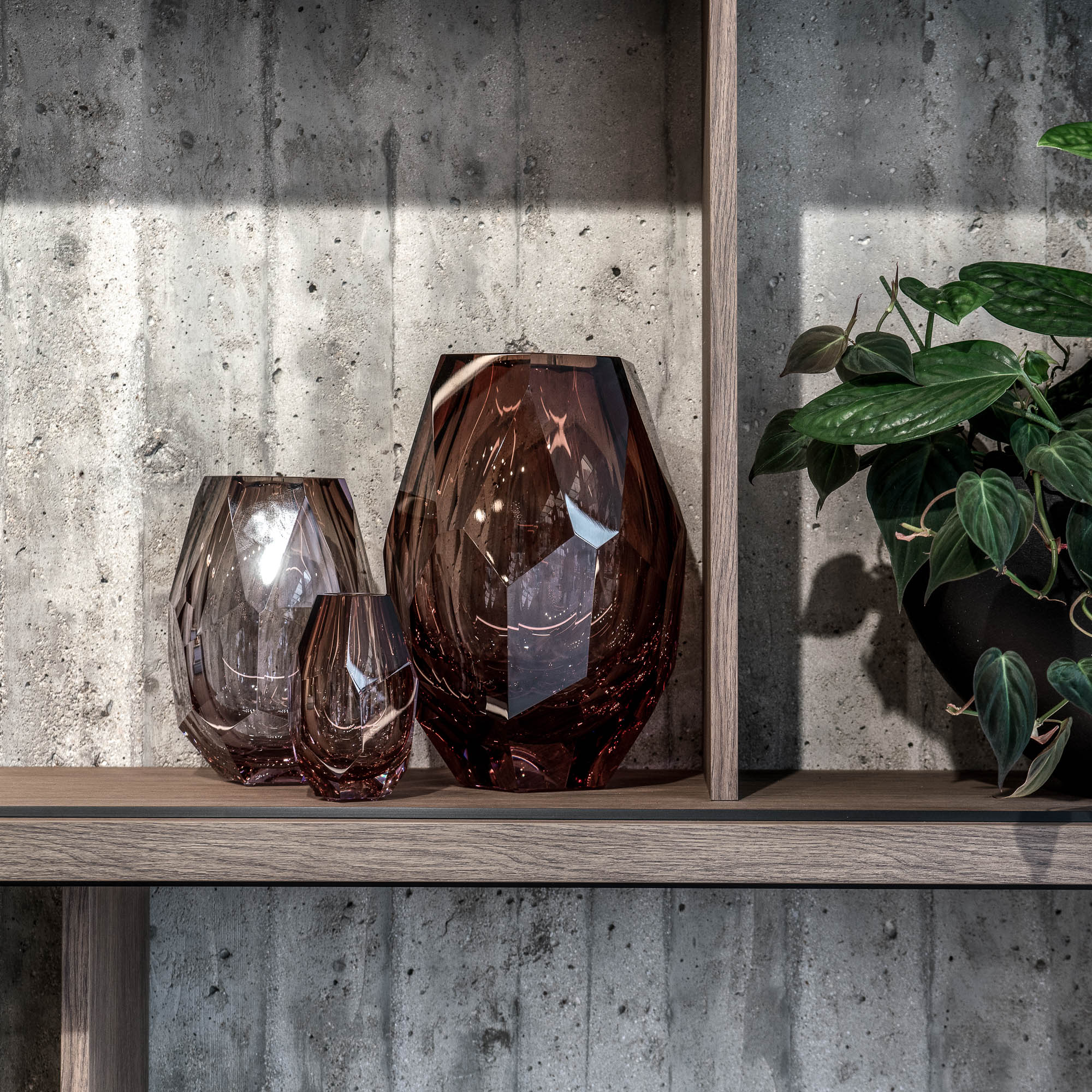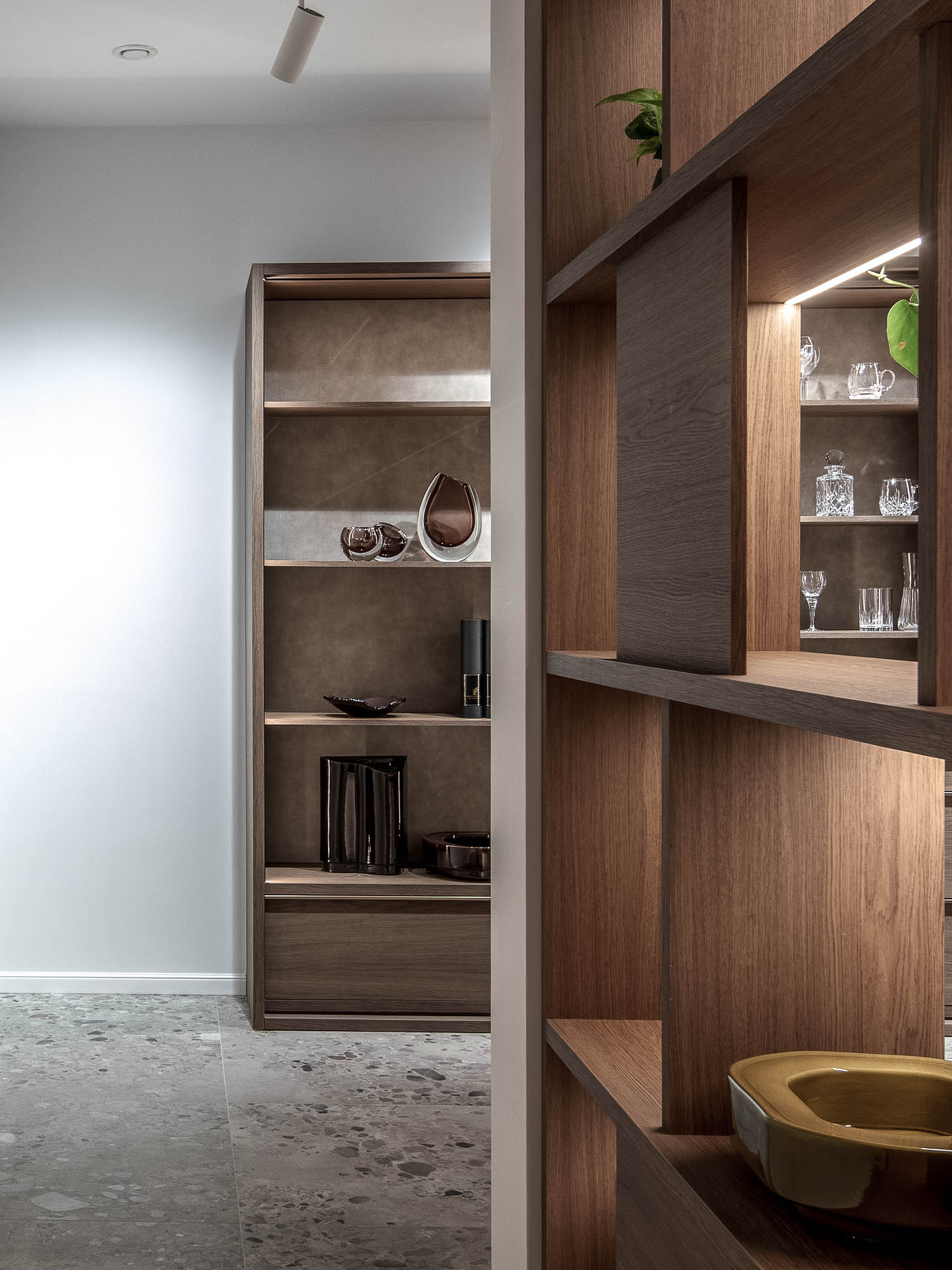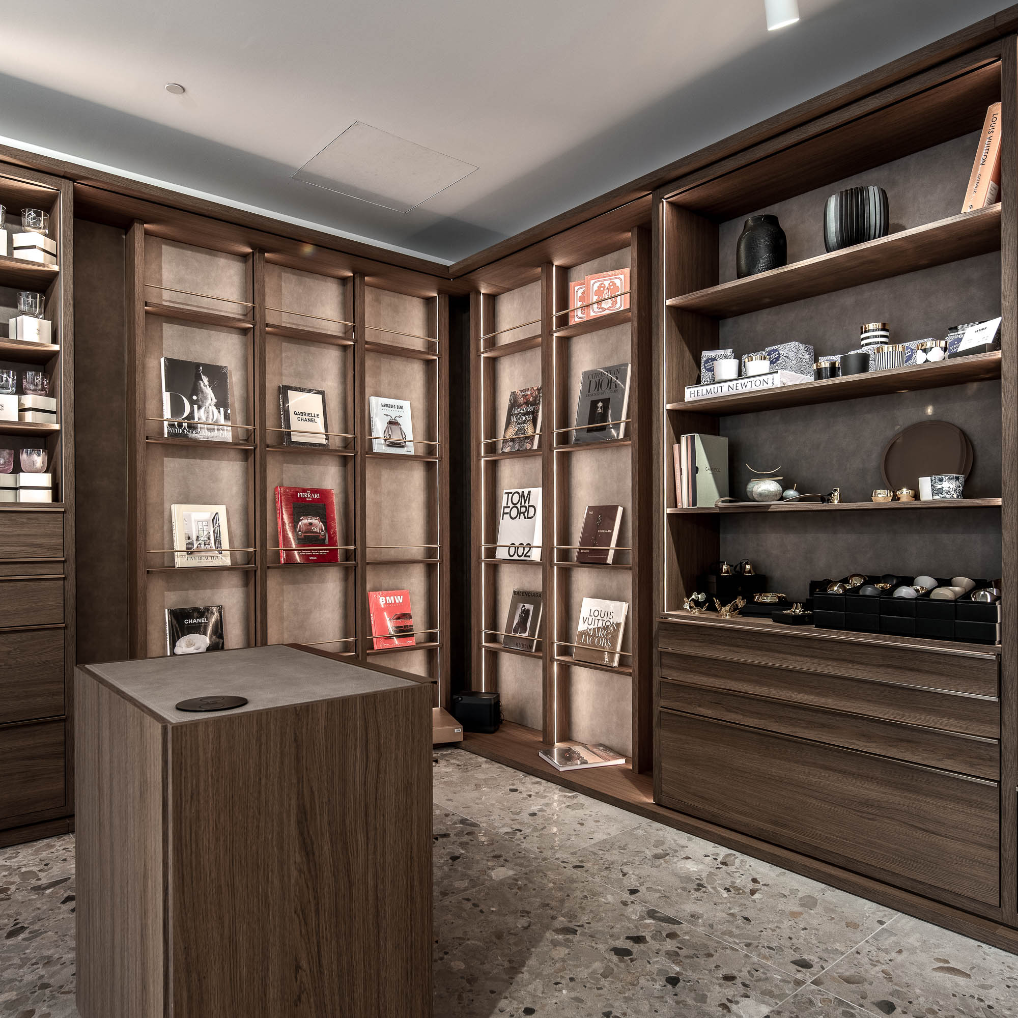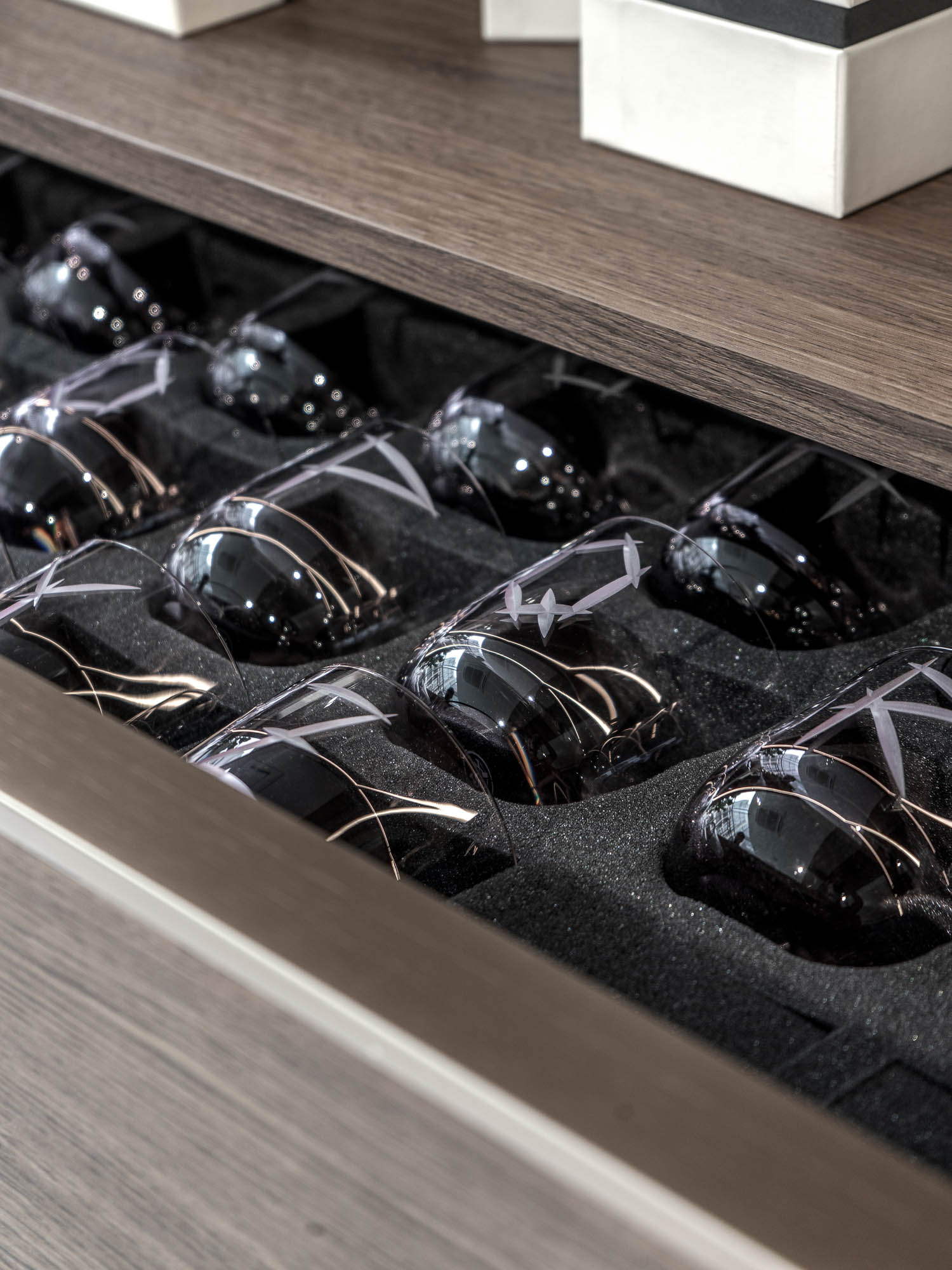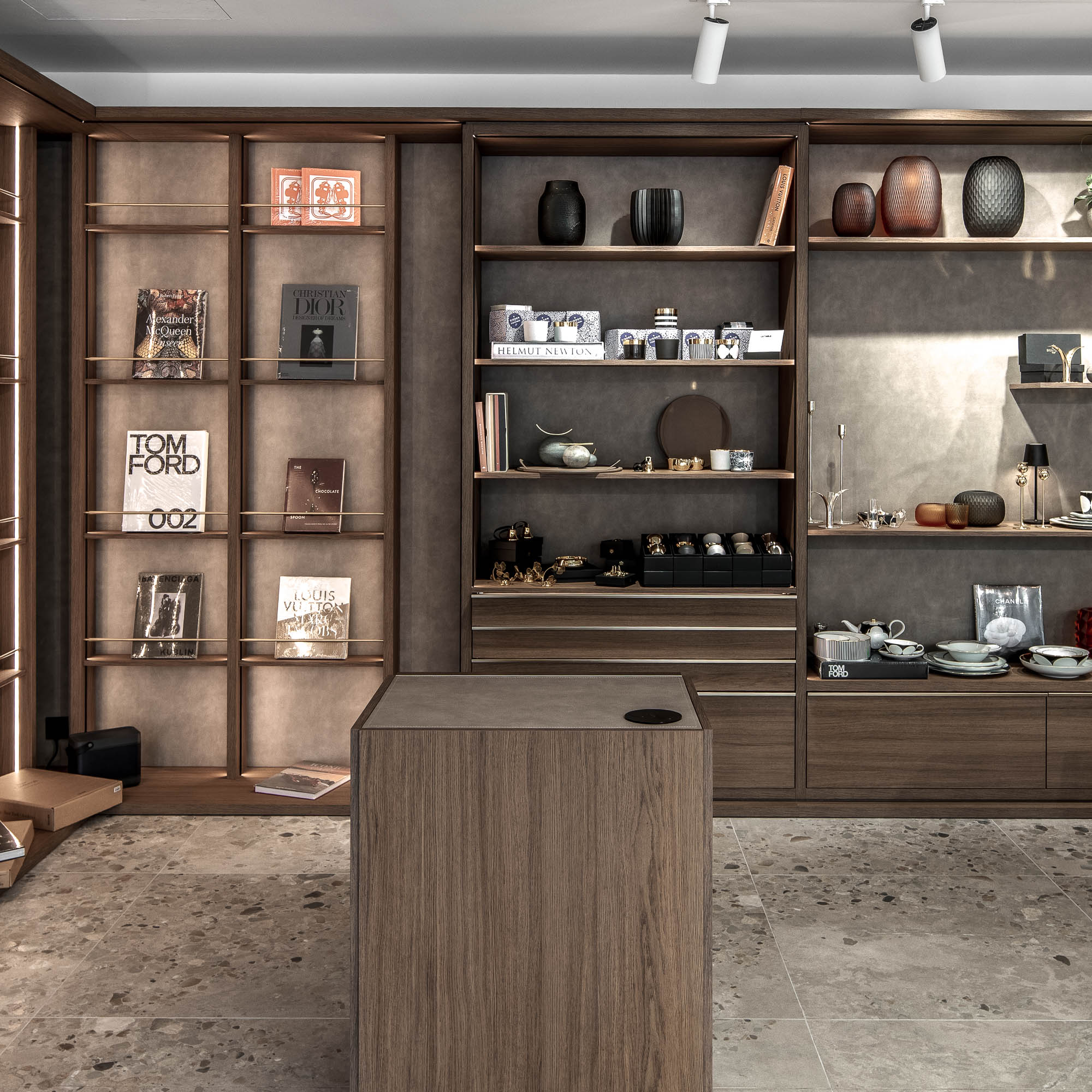 Veškerý vestavný nábytek určený pro vystavení produktů jsme navrhli ze speciálního lamina v teplém odstínu, které je od dýhy téměř k nerozeznání. Po brutalistním obalu prostoru je to právě ta vrstva, která interiér kultivuje a dává mu správnou míru luxusu. Záda nik doplňuje koženka, která celek změkčuje a zároveň přidává hloubku i haptický rozměr. Všechny police i skříně jsou po celém obvodu nasvětlené, takže vystavené objekty dostávají přesný, ale neagresivní rám. A pak jsou tu detaily, které návštěvník možná nevnímá hned, ale právě ony dělají rozdíl — třeba zásuvky na skleničky s vyřezávaným molitanem, kde má každá věc své pevné místo.