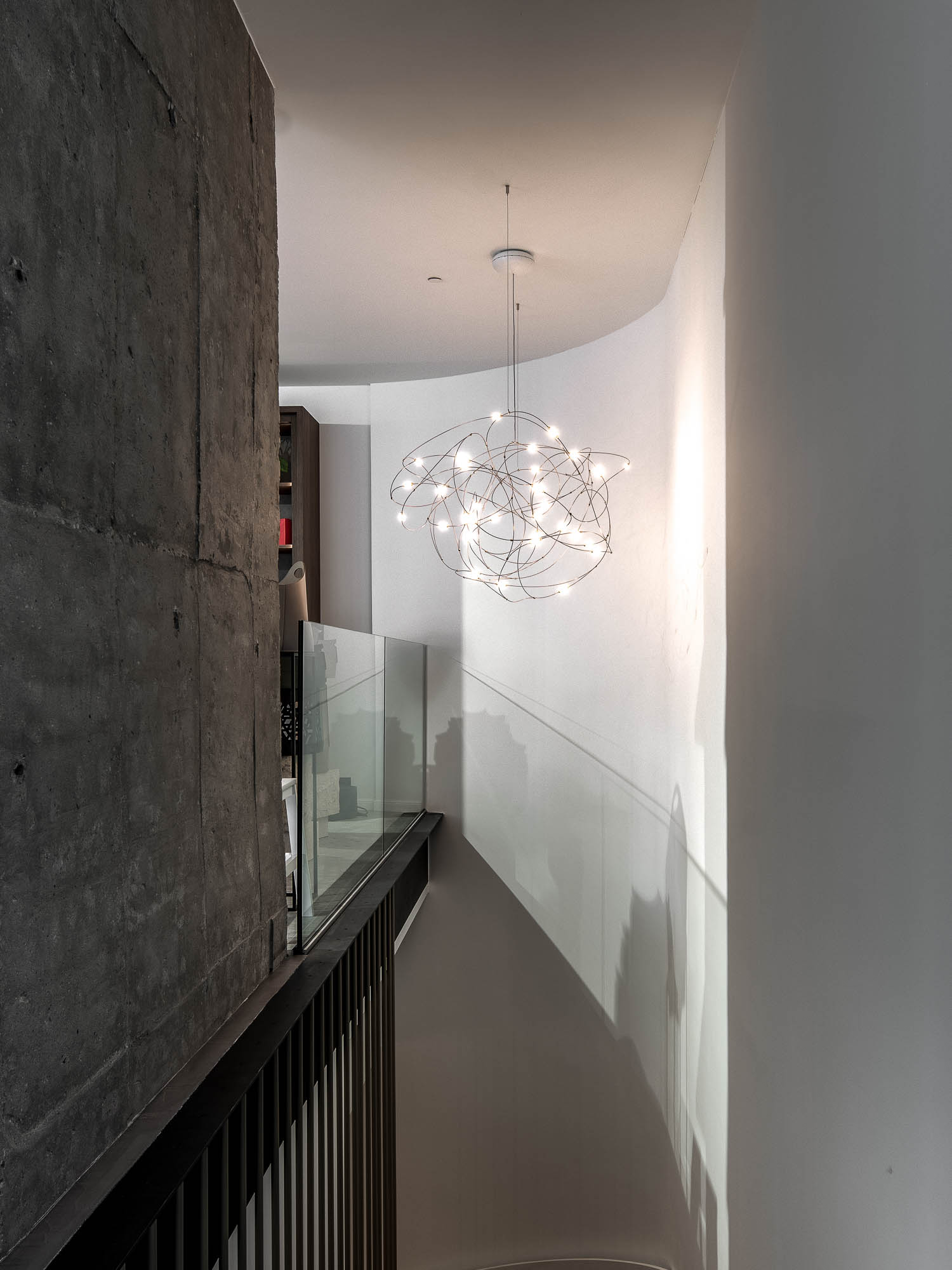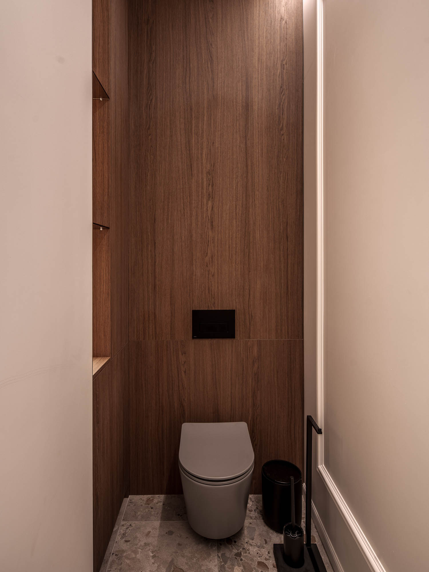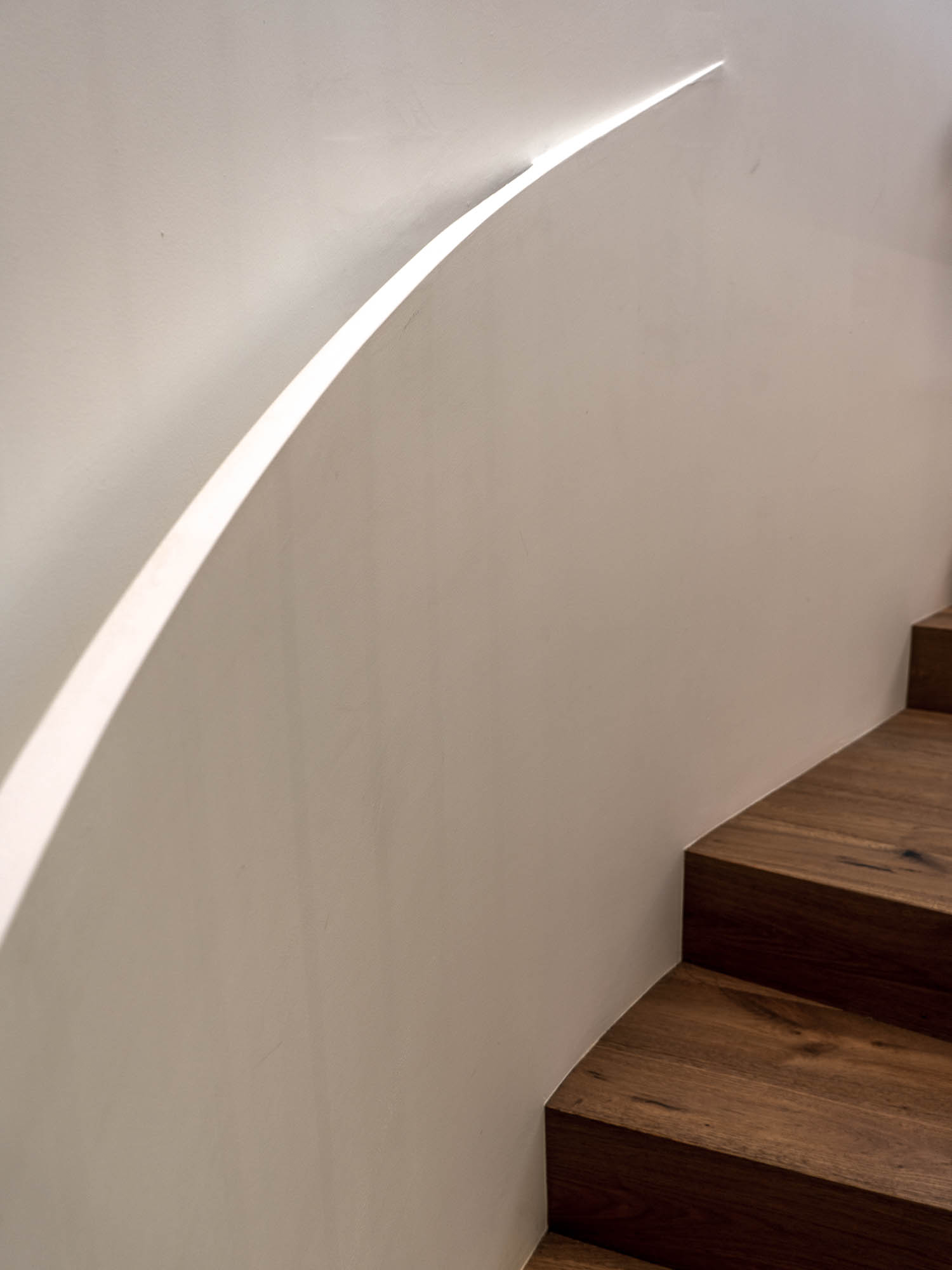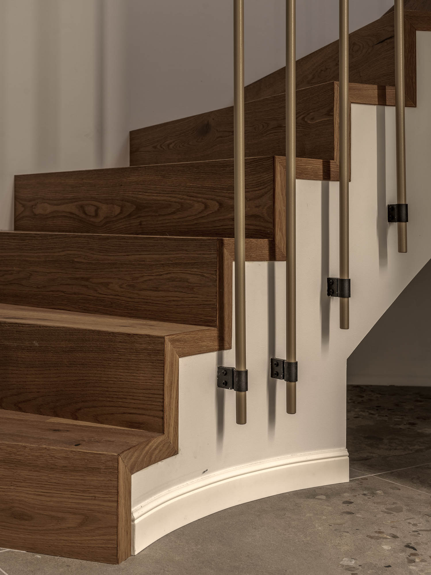 Zázemí je navržené ve stejném duchu jako celý showroom, takže prostor drží pohromadě od hlavního stolu až po poslední schod. Do suterénu vedou zatočené schody, které nejsou jen funkční spojnicí mezi patry, ale přirozeným pokračováním celého konceptu. Právě na takových místech se pozná, jestli je interiér opravdu dotažený. Ne když funguje jen tam, kde se na něj všichni dívají, ale když si udrží sílu i v částech, které by jinde zůstaly jen obyčejným provozem.