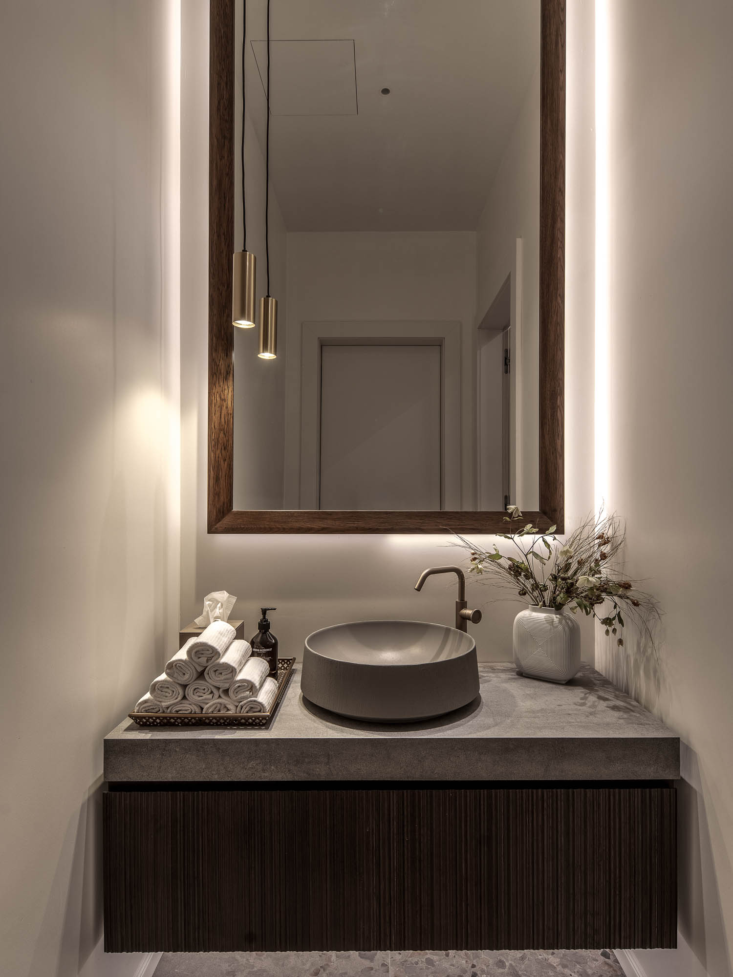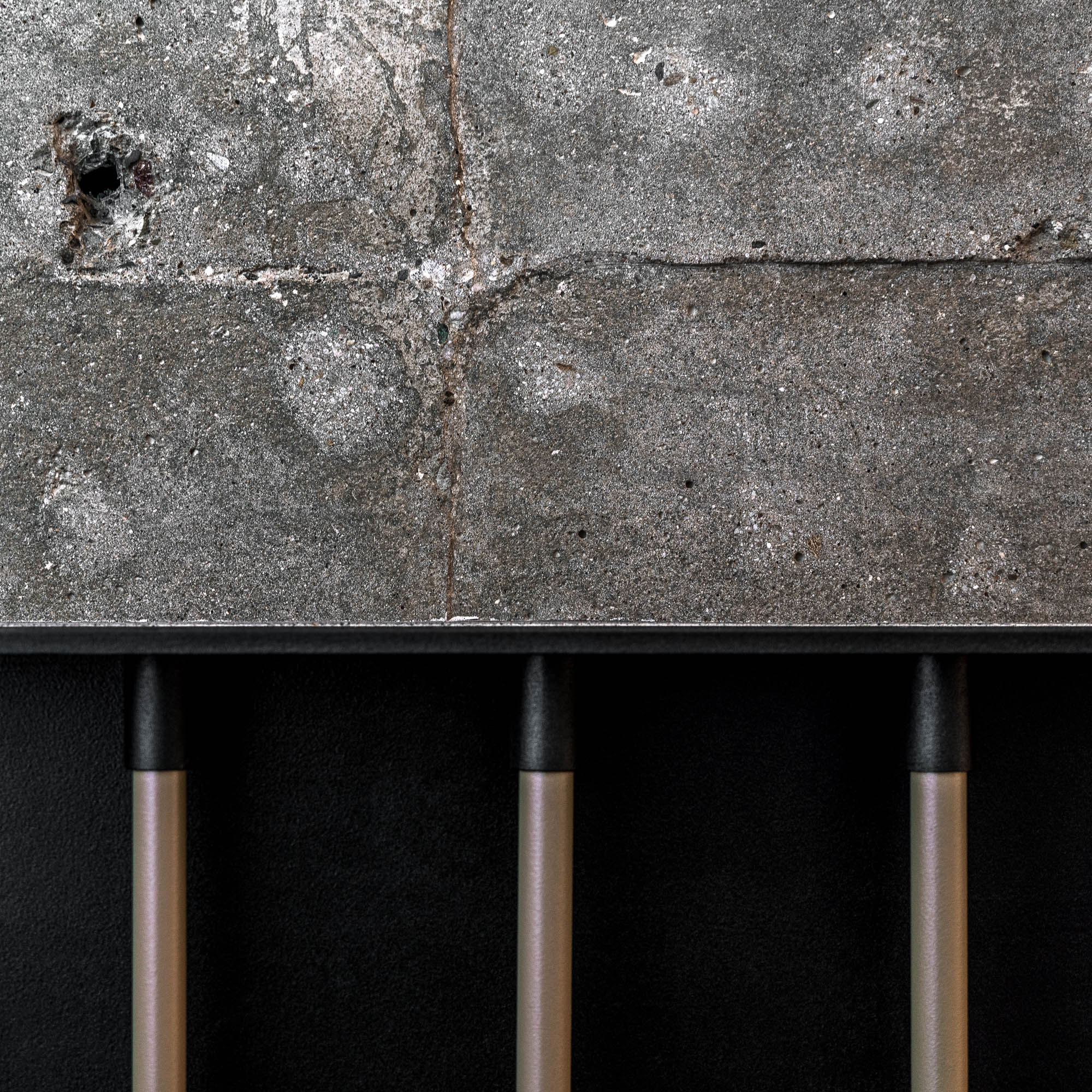 Tam, kde jsme nechali odhalené původní betonové konstrukce, jsme nechtěli nic zakrývat. Naopak. Nábytek jsme v těchto místech navrhli bez zad, takže se beton stává jeho přirozenou pohledovou součástí. Nehraje jen roli kulisy, ale přímo vstupuje do kompozice interiéru. Tady už syrovost nebylo potřeba do prostoru vkládat. Byla přítomná od začátku a naším úkolem bylo najít způsob, jak ji nepřebít, ale správně usadit vedle jemnějších materiálů a luxusních produktů.