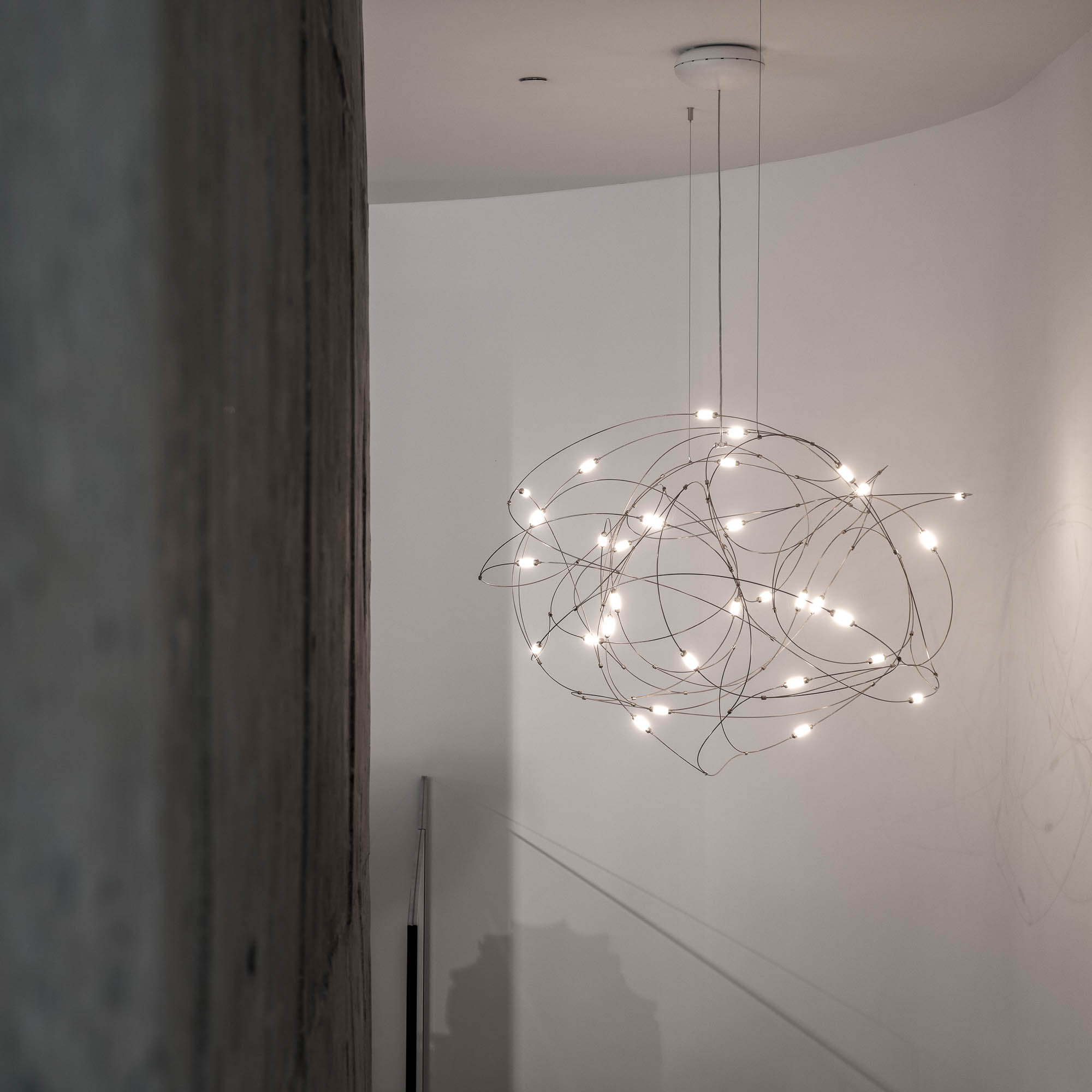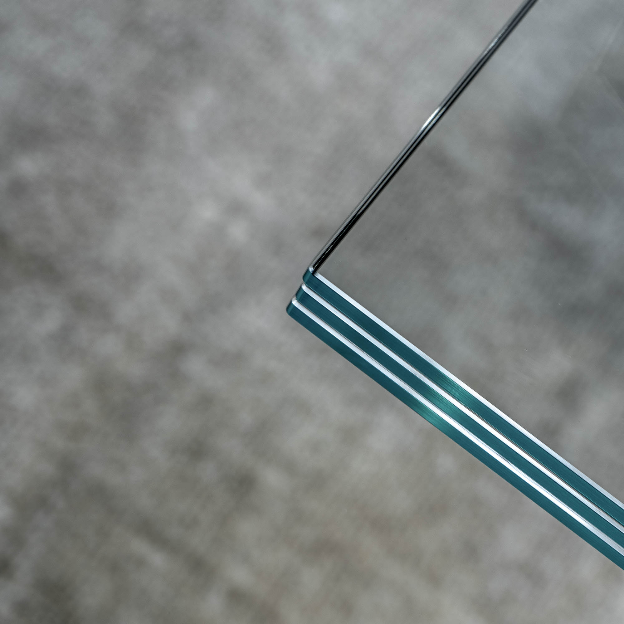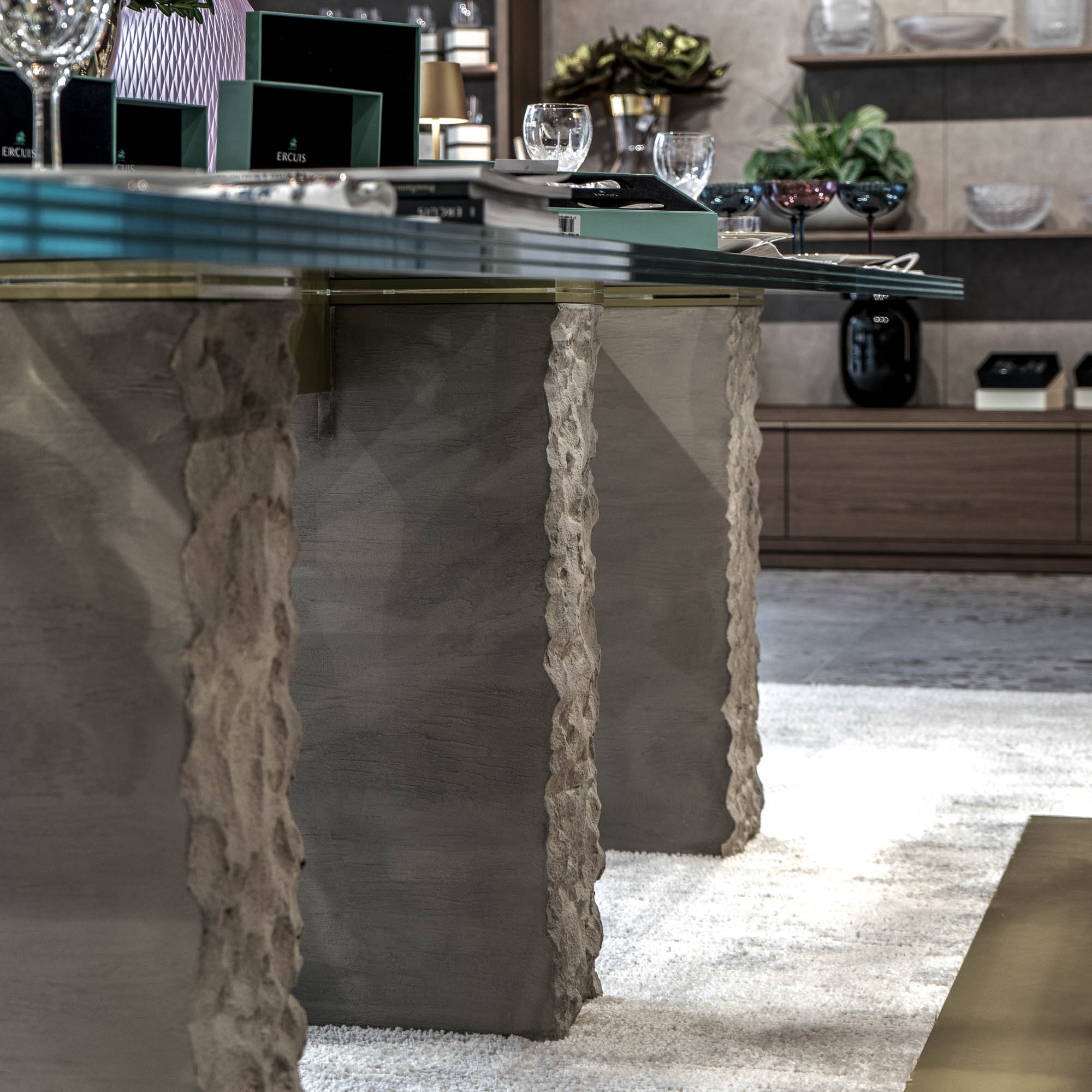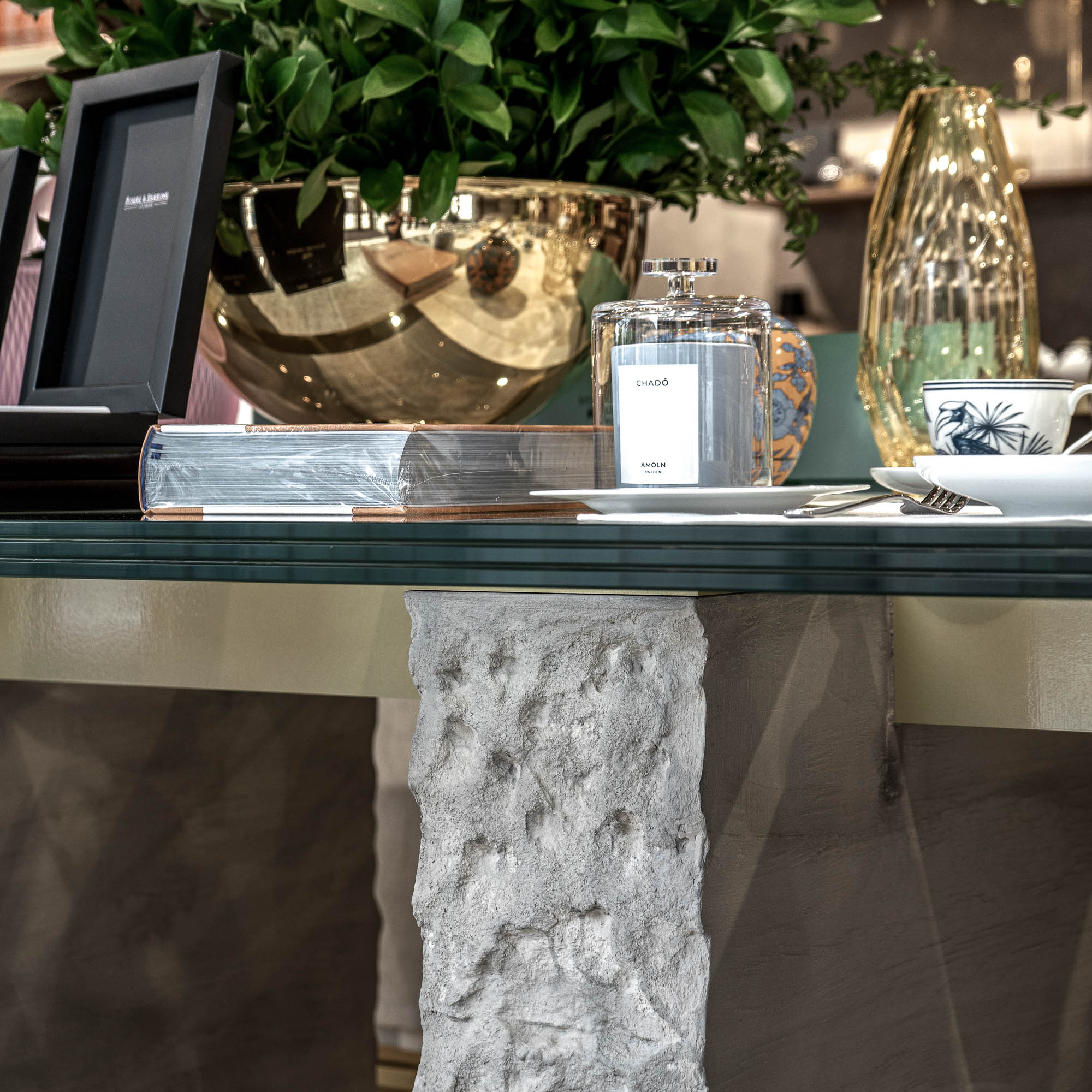 I tentokrát hraje hlavní roli stůl. Zatímco v Mánesově jsme pracovali s ostřejším designem vloženým do štukového prostoru, tady je princip opačný. Syrová brutalistní architektura si žádala jemnější odpověď. Do prostoru jsme proto umístili monumentální stůl o délce 4,5 metru s masivní deskou z trojitého skla, usazenou na brutalistní betonové podnoži. Je to solitér, který drží celý showroom pohromadě. Stojí pod zvýšeným stropem otevřeným do původní betonové konstrukce, a právě tam dostává svou plnou sílu. Syrovost betonu nad hlavou i pod ním pak zjemňuje drátěné svítidlo, které prostoru přidává lehkost a klid.