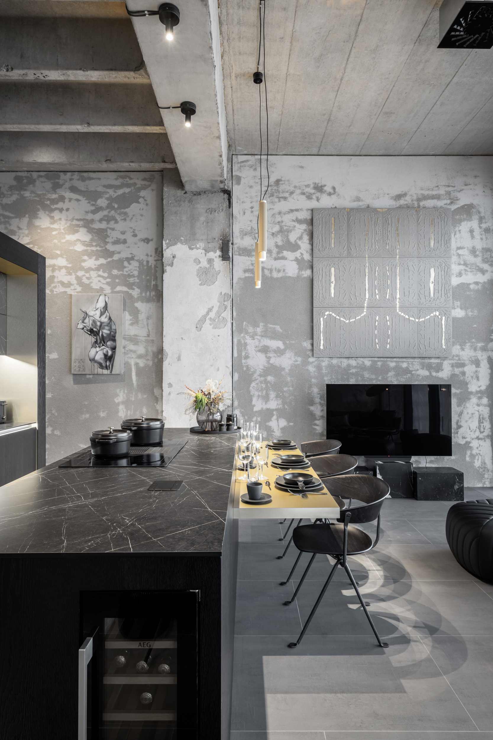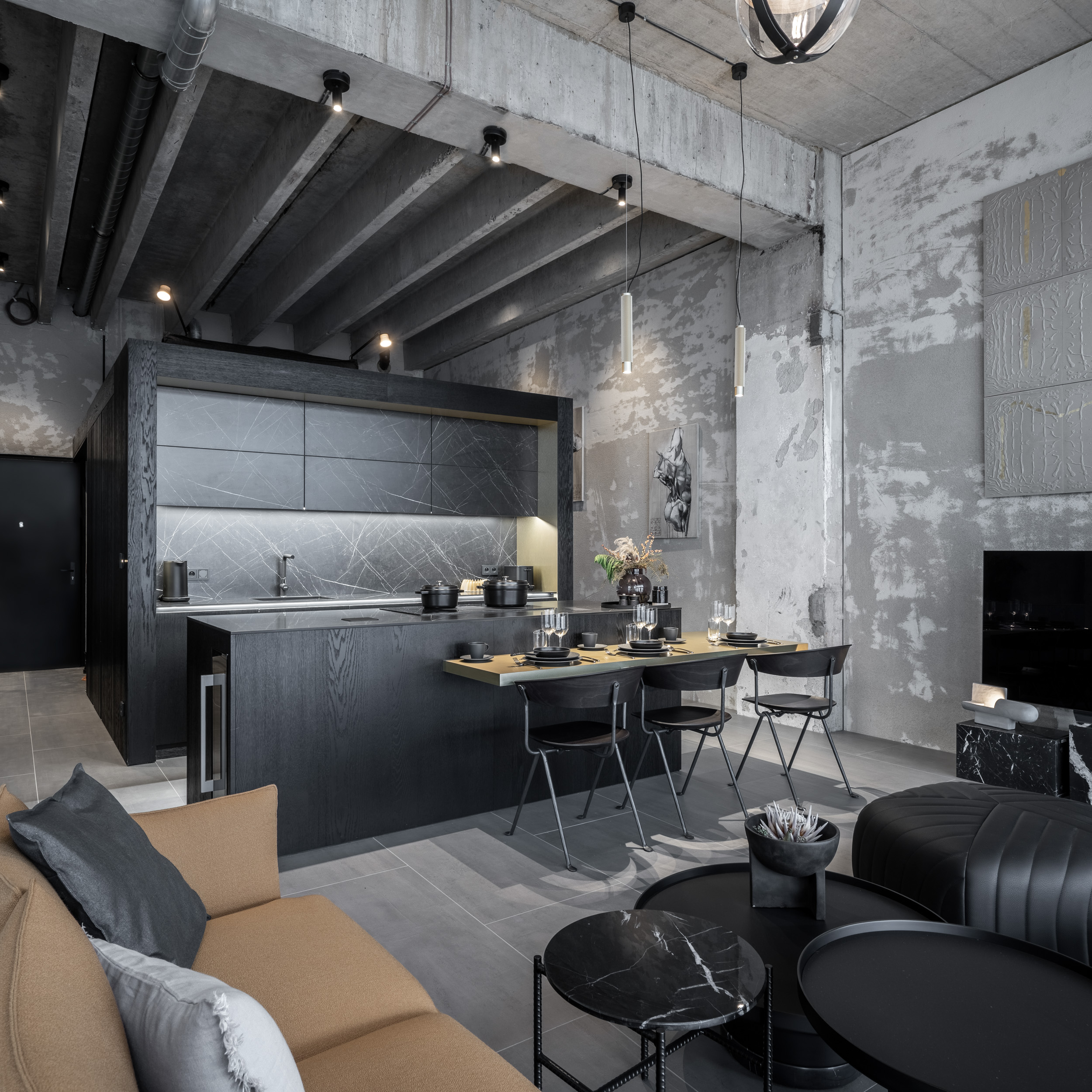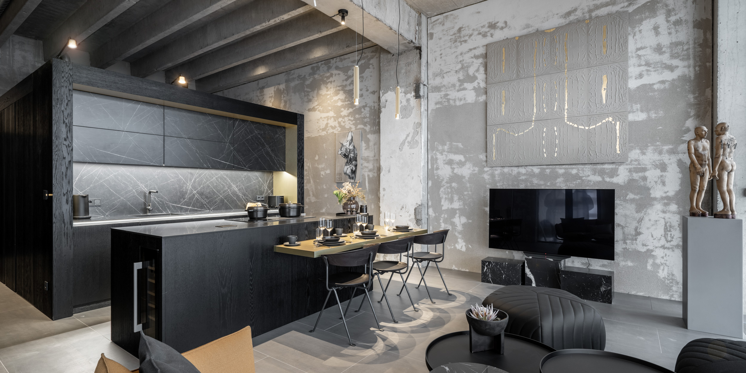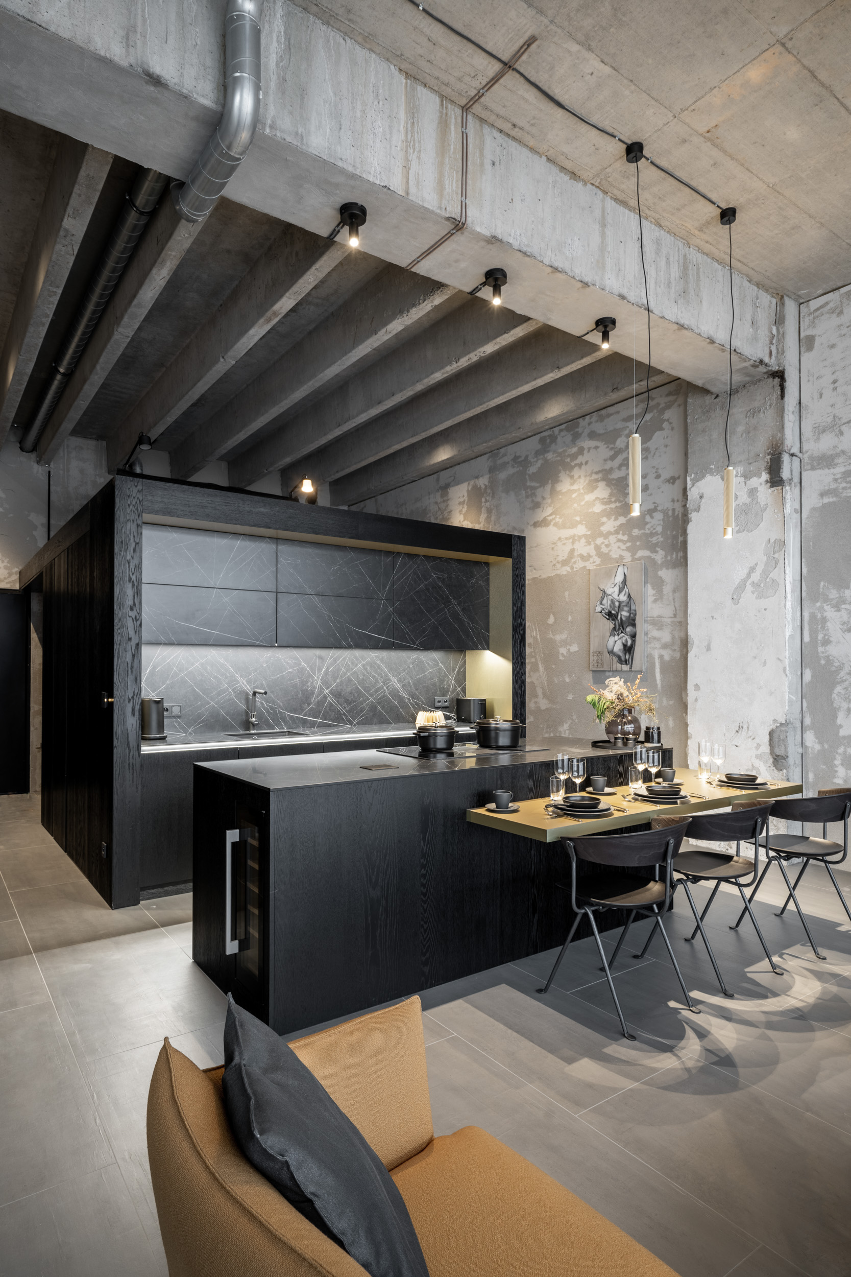 Vzhledem k tomu, že se celý objekt rekonstruuje na bydlení, chtěli jsme tu přiznanou surovost něčím změkčit a zároveň vytvořit zajímavý kontrast luxusních materiálů a betonové konstrukce. Celý návrh je tedy kombinací černého dřeva, zjemněného mosaznými detaily v betonovém kabátě. Všechny loftové byty mají neuvěřitelně luxusní výšku, některé tak, že je možné tam udělat i dvě patra. Vysoký prostor má úplně jinou atmosféru než standardní výšky bytů. K tomu si přidejte celoprosklenou fasádu, takže krásný výhled a světlo, proto jsme se nebáli černé.