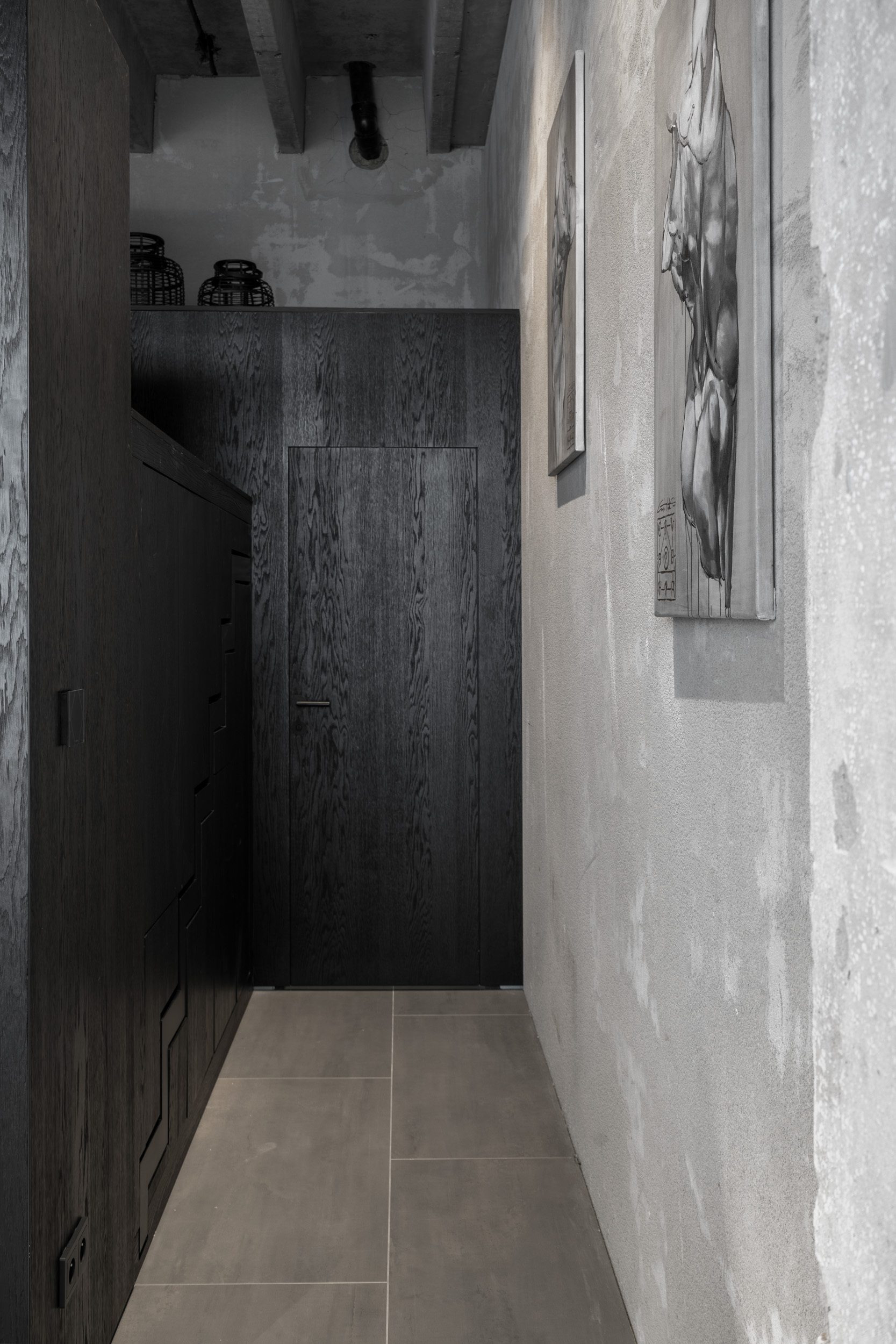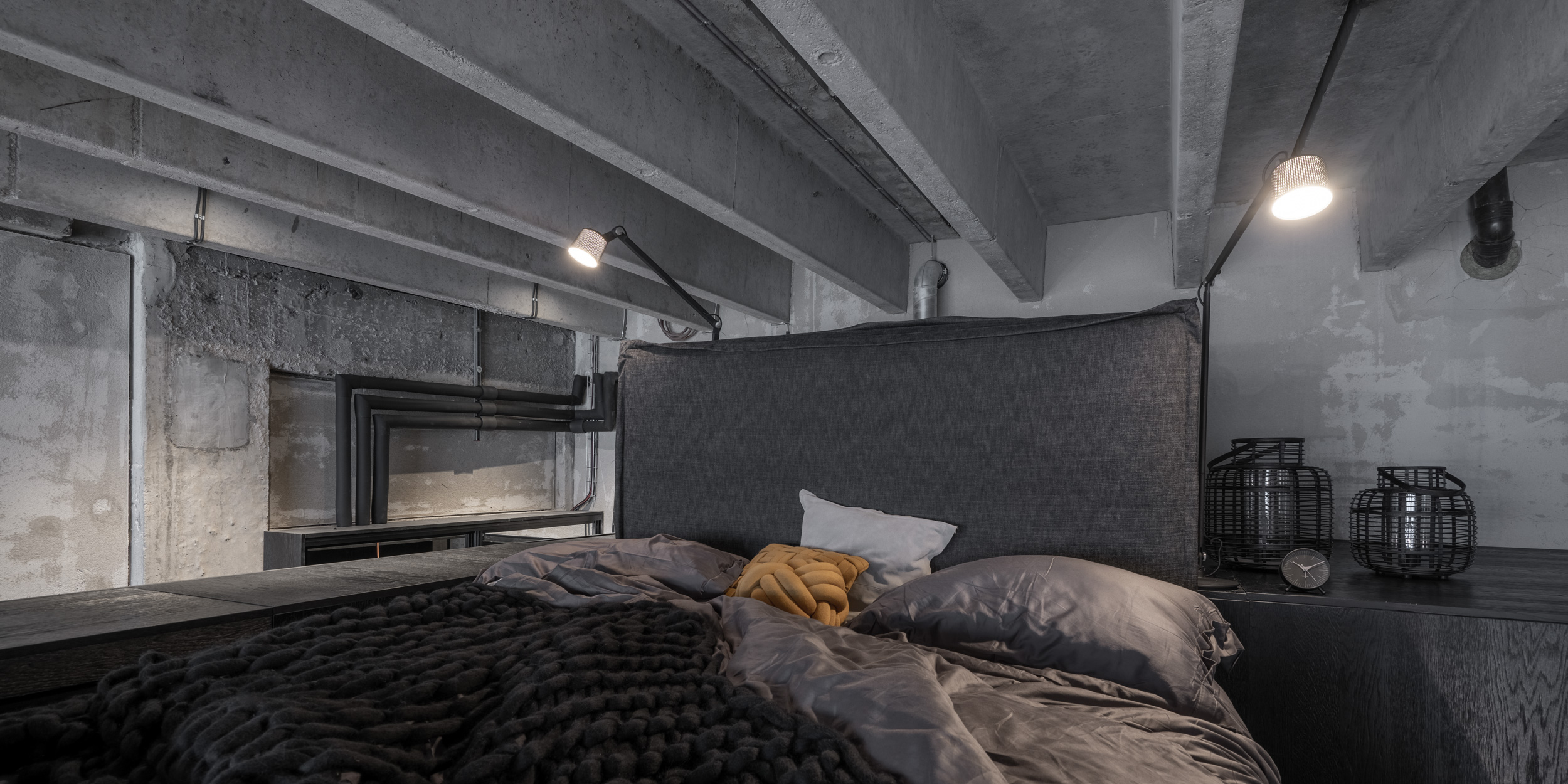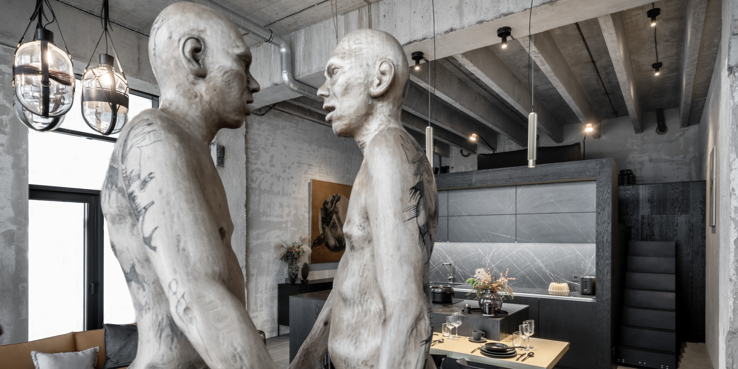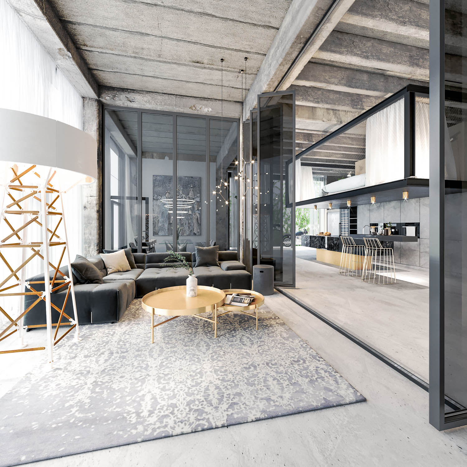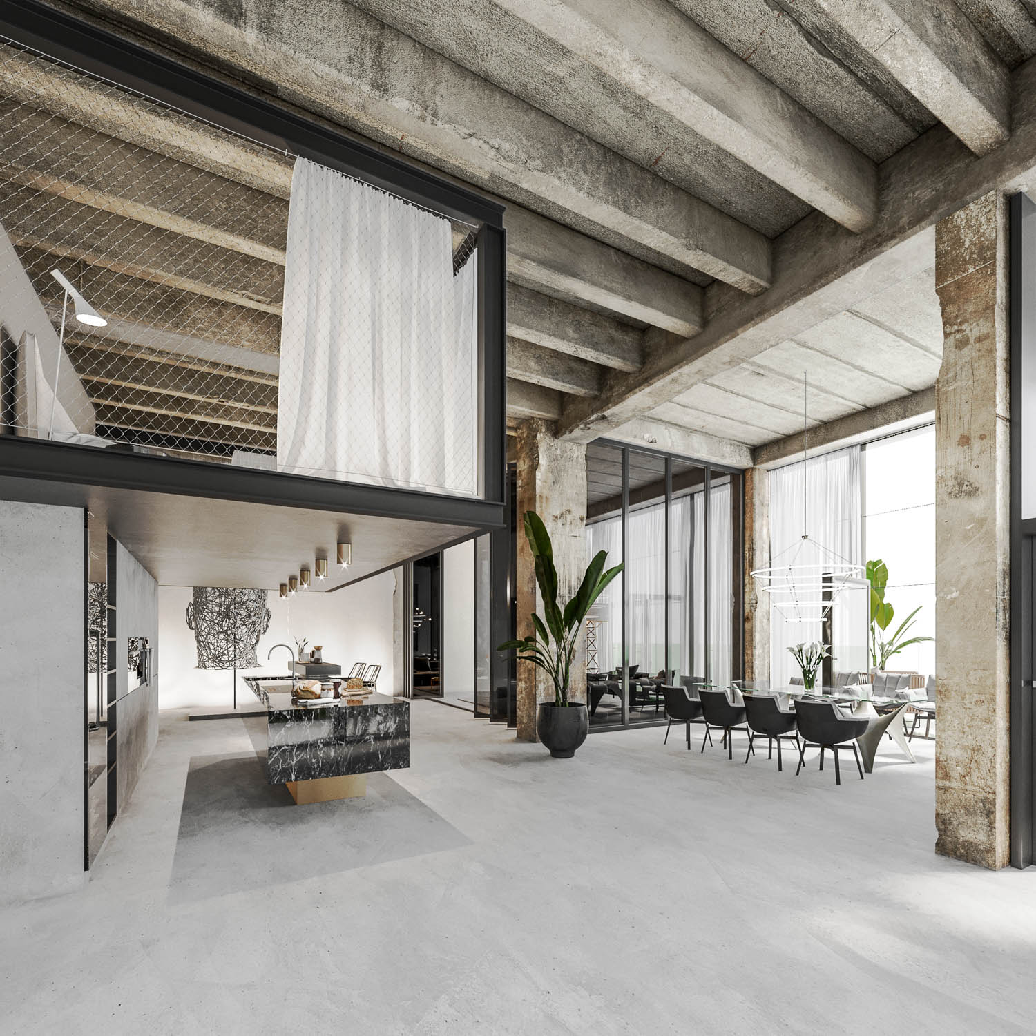 Vzhledem k tomu, že se celý objekt rekonstruuje na bydlení, chtěli jsme tu přiznanou surovost něčím změkčit a zároveň vytvořit zajímavý kontrast luxusních materiálů a betonové konstrukce. Celý návrh je tedy kombinací černého dřeva, zjemněného mosaznými detaily v betonovém kabátě. Všechny loftové byty mají neuvěřitelně luxusní výšku, některé tak, že je možné tam udělat i dvě patra. Vysoký prostor má úplně jinou atmosféru než standardní výšky bytů. K tomu si přidejte celoprosklenou fasádu, takže krásný výhled a světlo, proto jsme se nebáli černé.