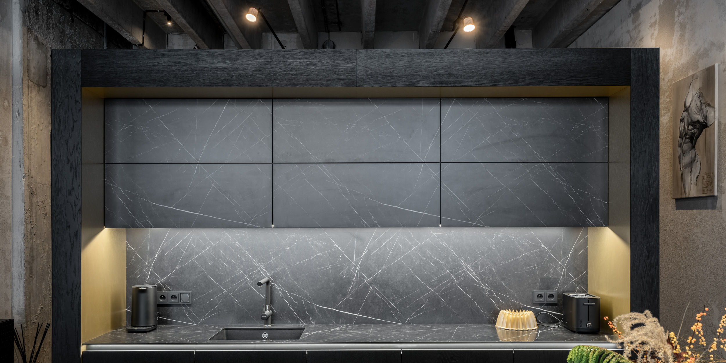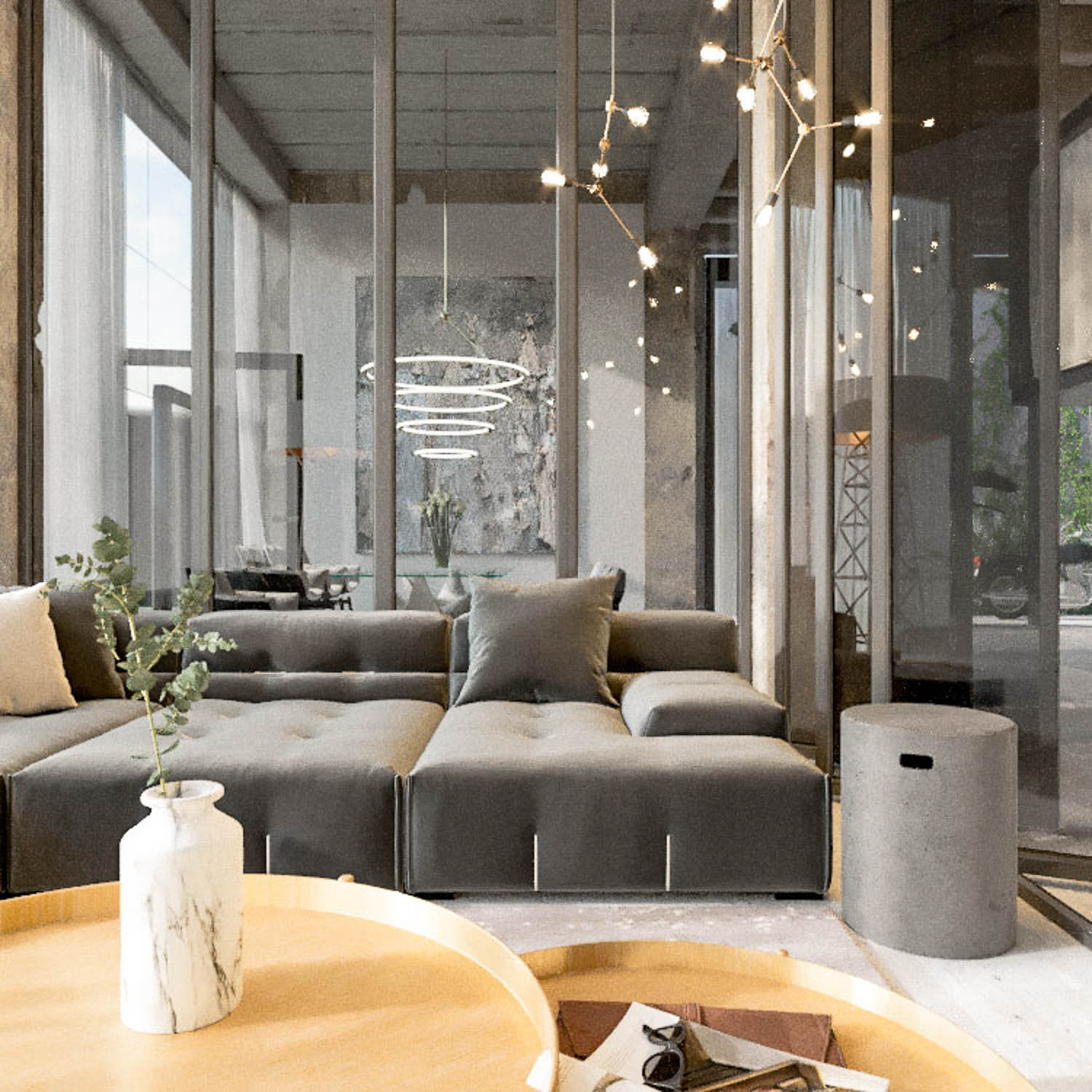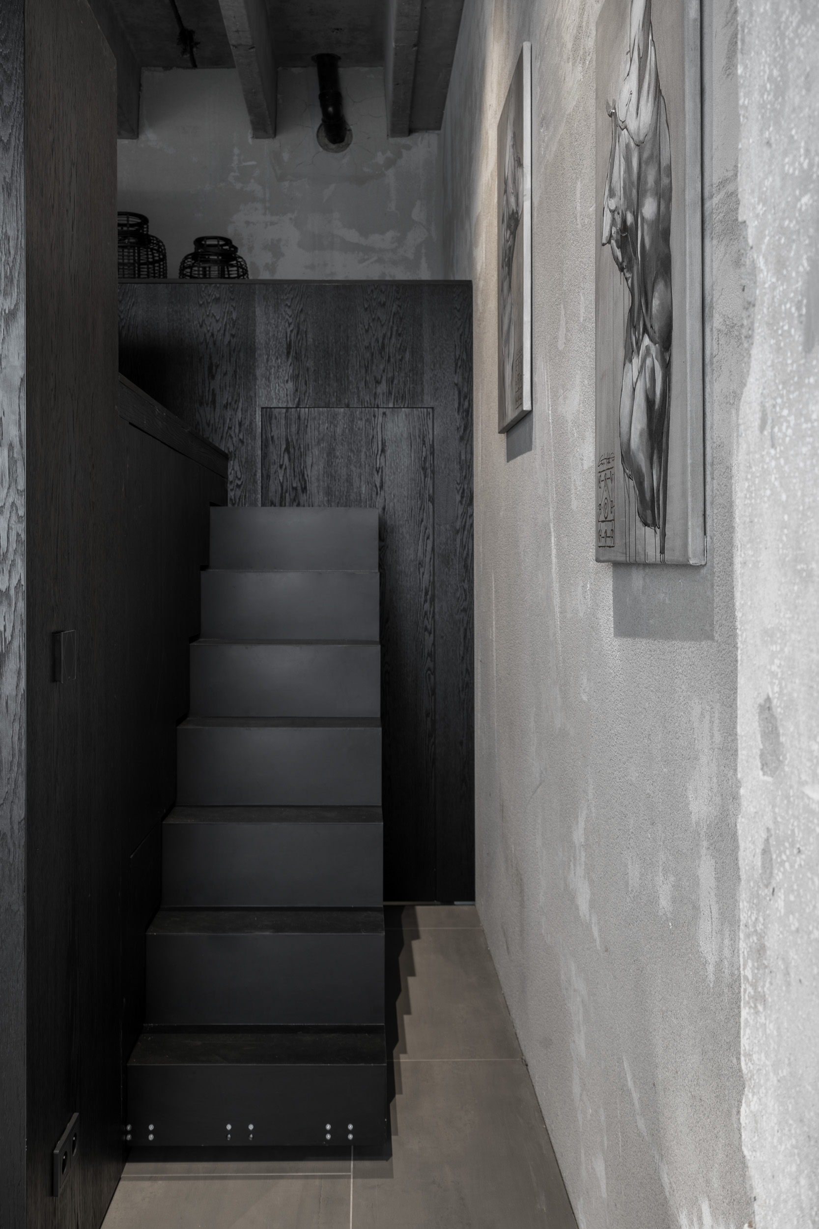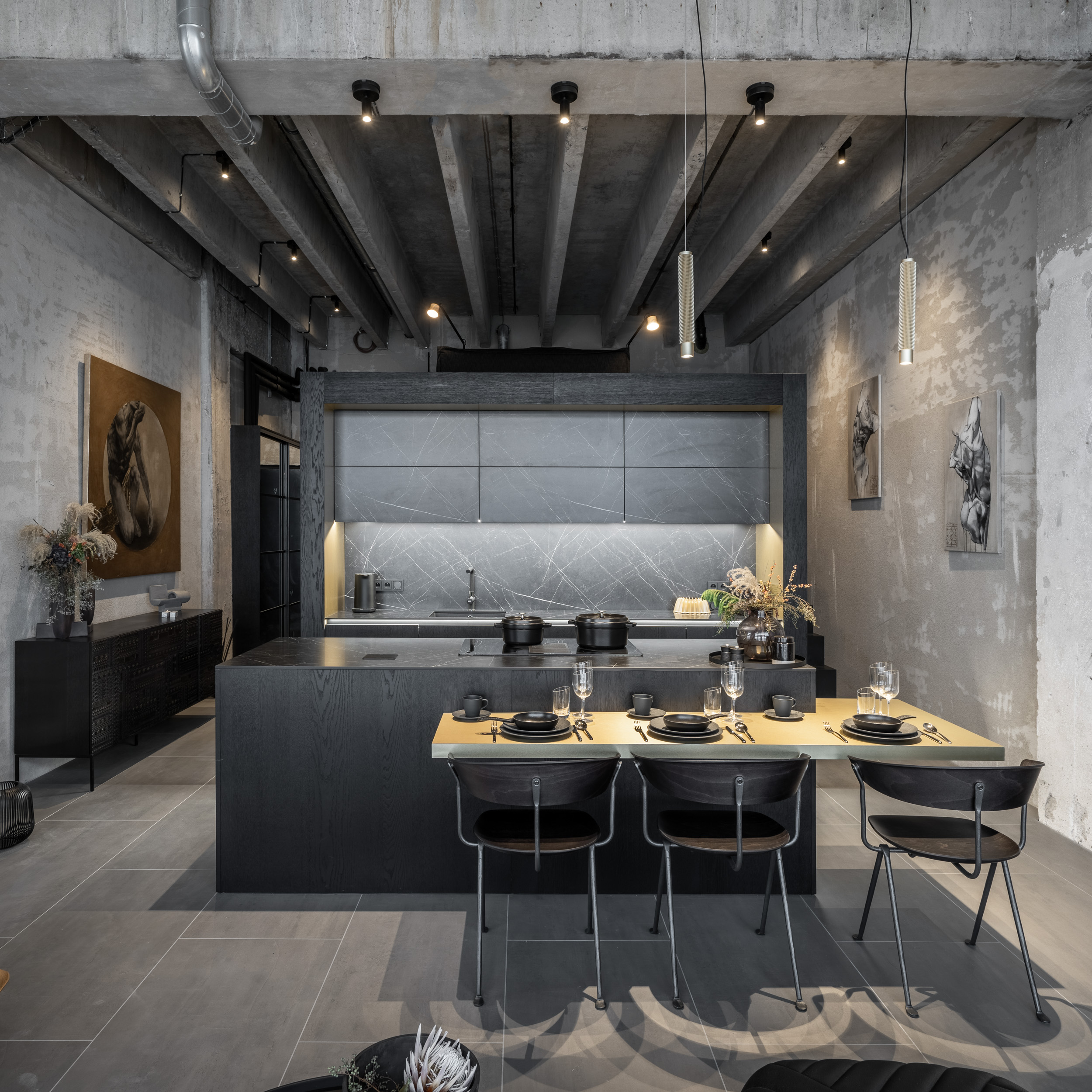 Vzhledem k tomu, že se celý objekt rekonstruuje na bydlení, chtěli jsme tu přiznanou surovost něčím změkčit a zároveň vytvořit zajímavý kontrast luxusních materiálů a betonové konstrukce. Celý návrh je tedy kombinací černého dřeva, zjemněného mosaznými detaily v betonovém kabátě. Všechny loftové byty mají neuvěřitelně luxusní výšku, některé tak, že je možné tam udělat i dvě patra. Vysoký prostor má úplně jinou atmosféru než standardní výšky bytů. K tomu si přidejte celoprosklenou fasádu, takže krásný výhled a světlo, proto jsme se nebáli černé.