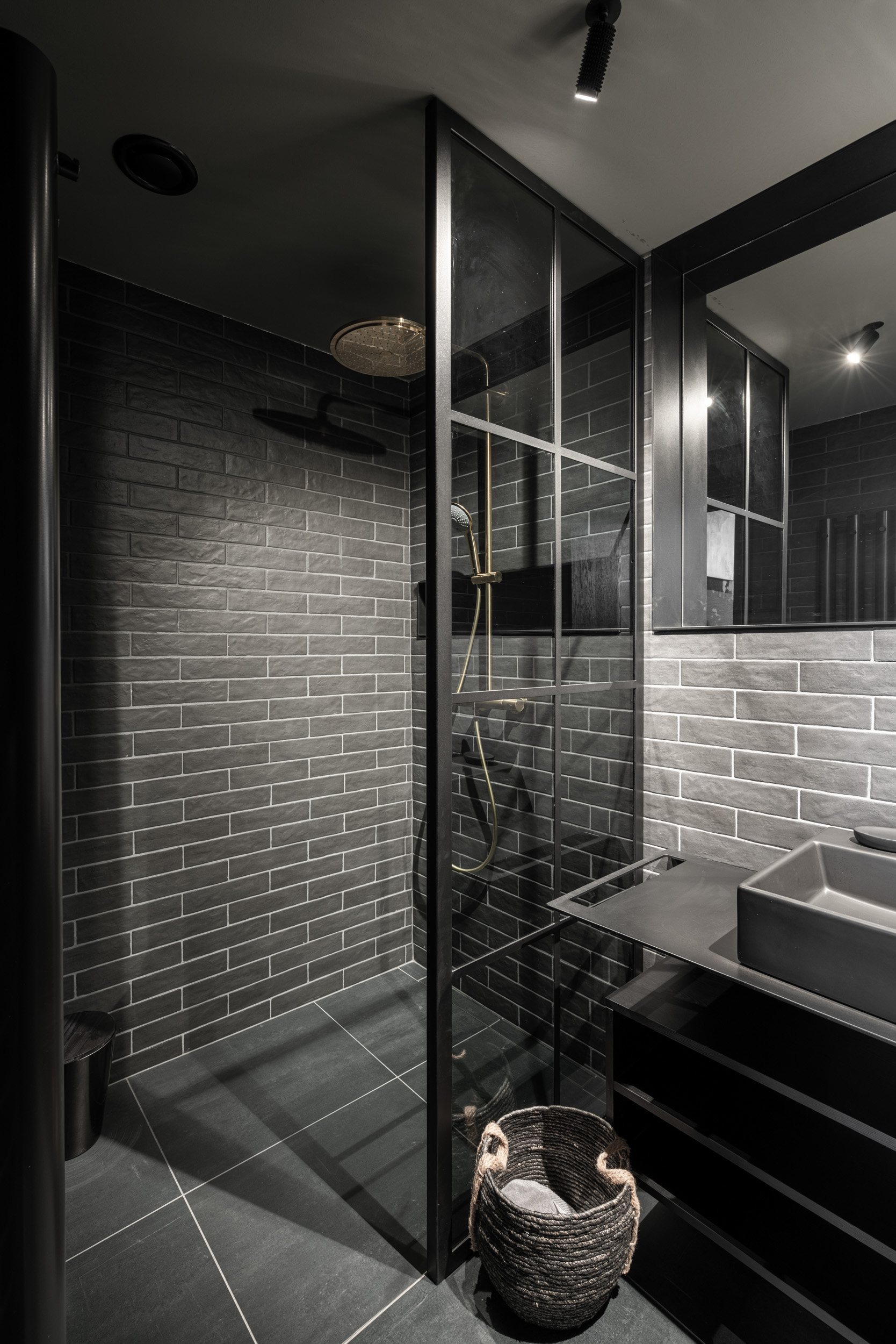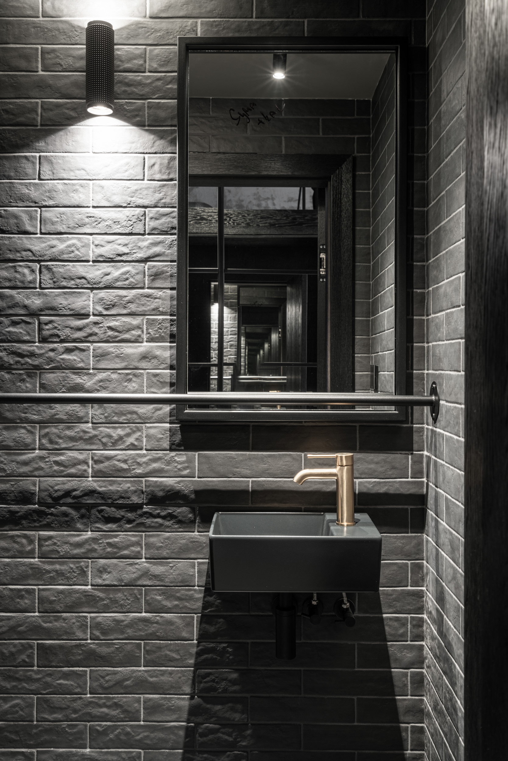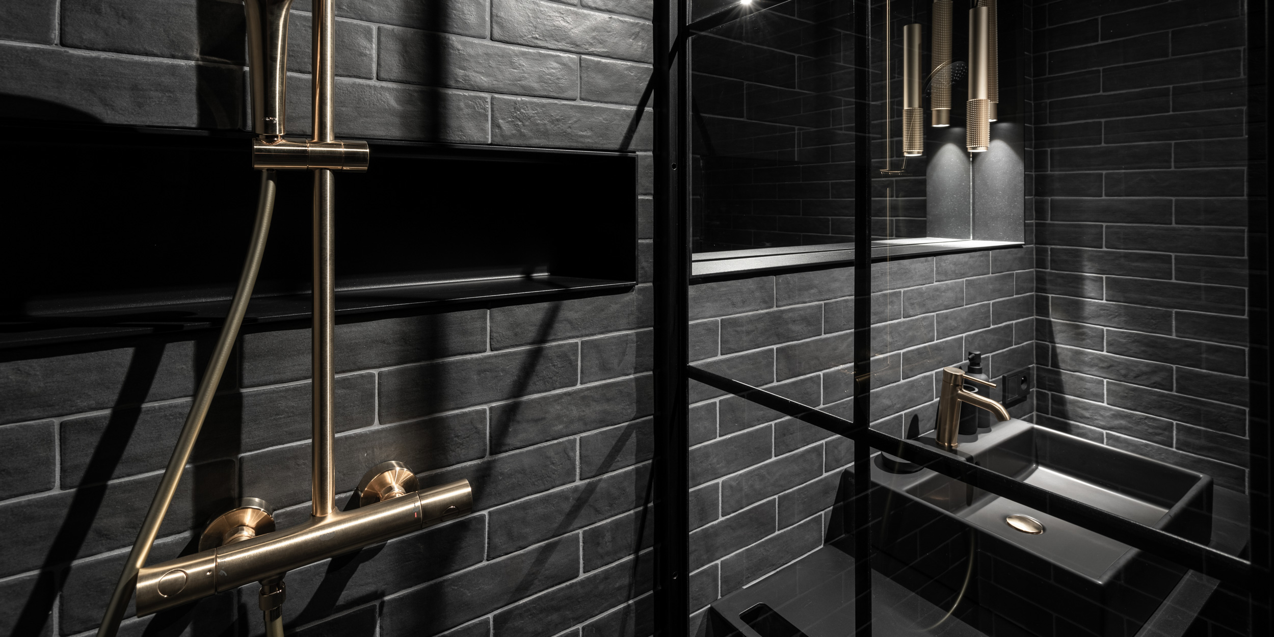 Koupelna navazuje na industriální náladu stylem malých černých obkladů a opět s mosaznými doplňky.
