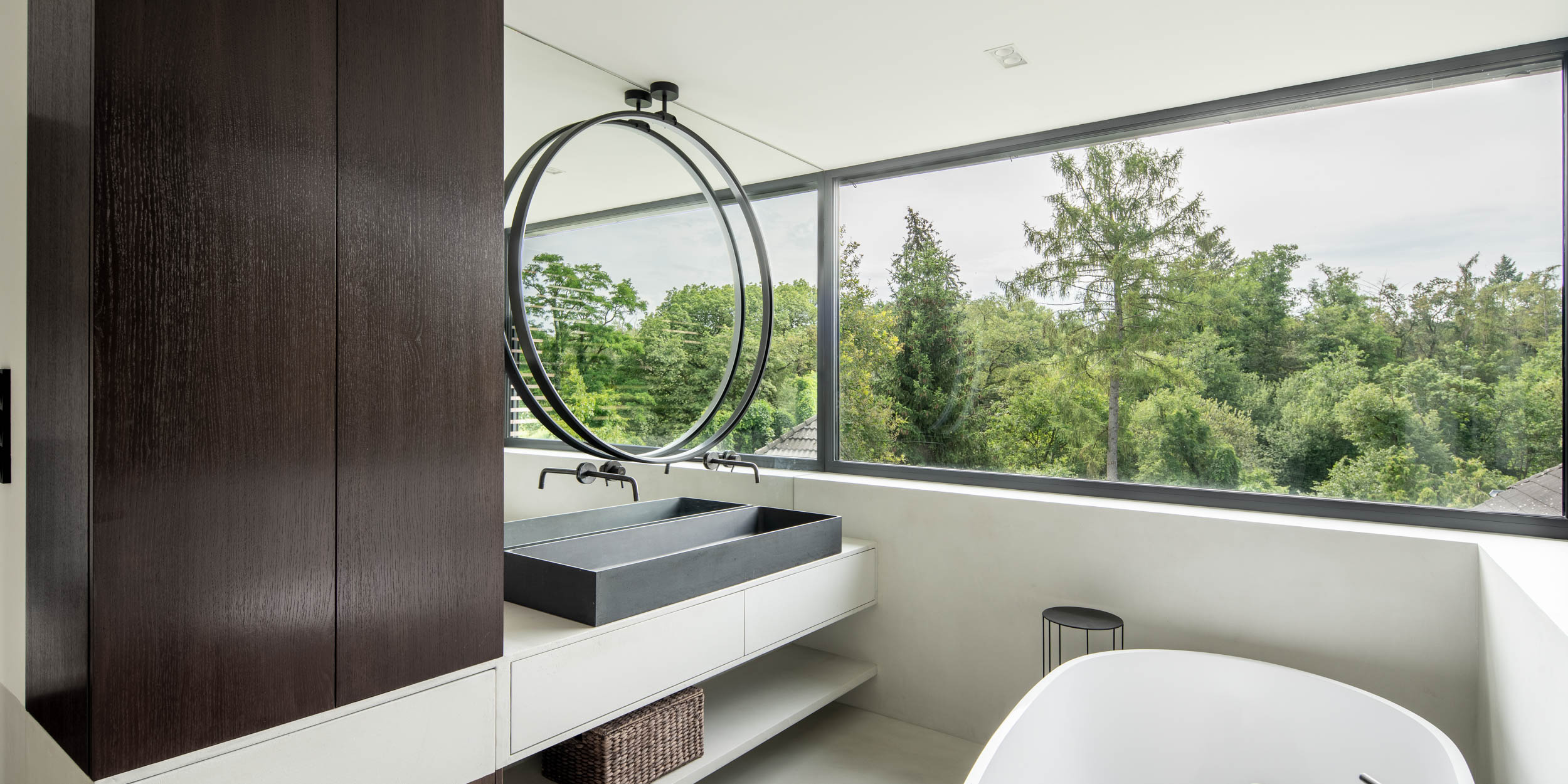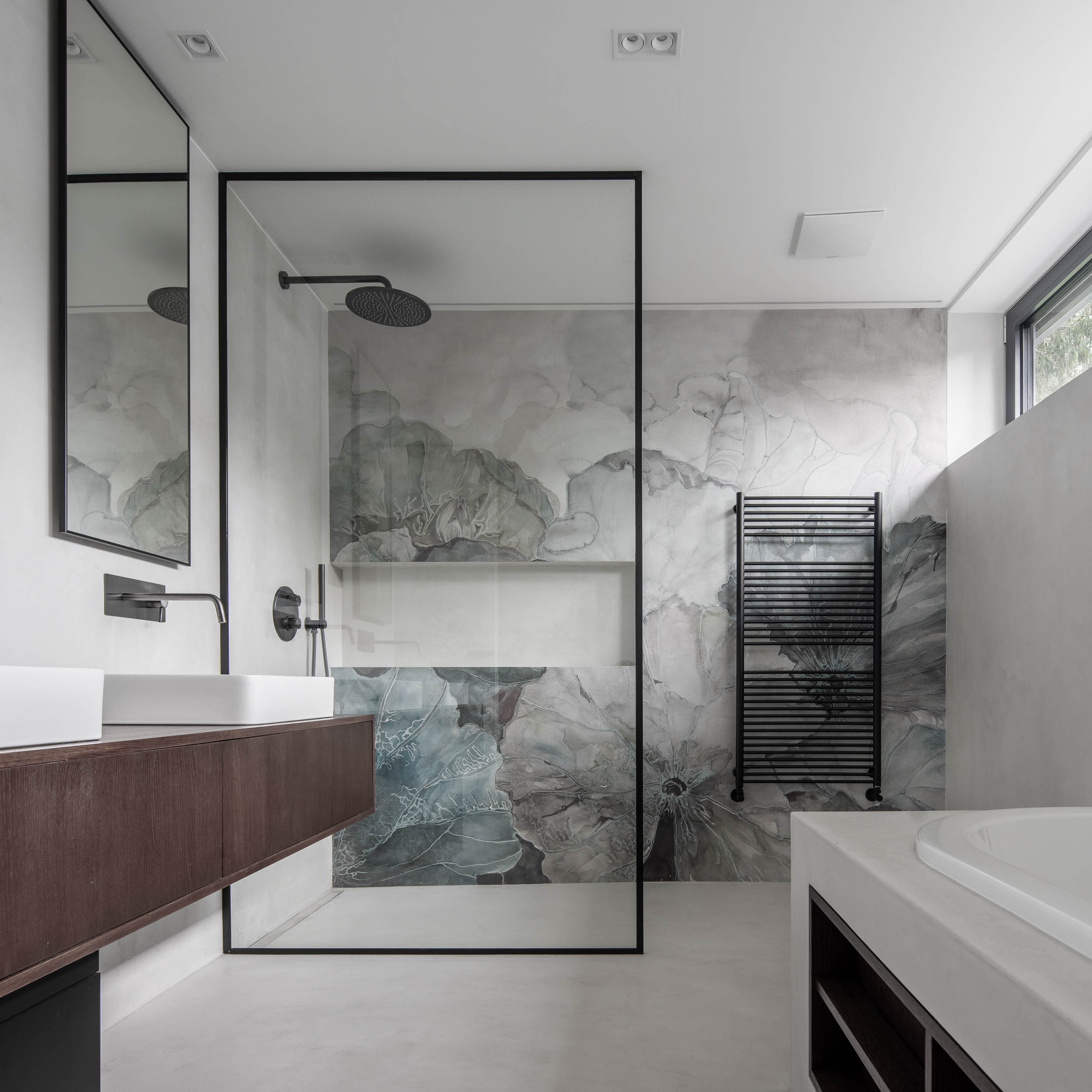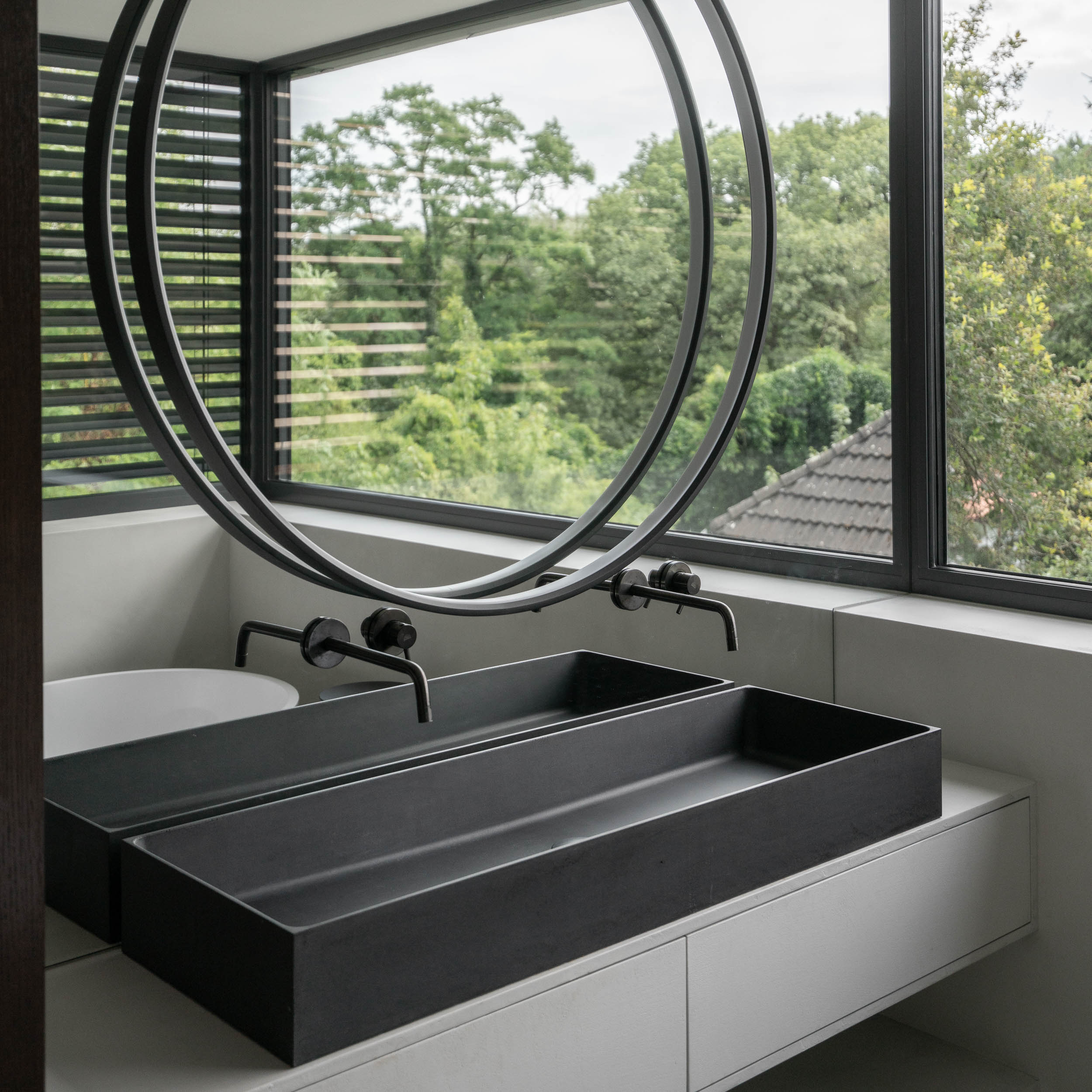 Díky tomu, že vila nabízí dostatek soukromí a krásný výhled do zeleně, umístění vany do rohu prostoru se přímo nabízelo. Tento prostor jsme chtěli využít naplno, a tak jsme navrhli vanu tak, aby se stala místem pro relaxaci s krásným výhledem na okolní přírodu. Zeleň jsme do interiéru vtáhli ještě pomocí velkoplošného zrcadla, které odráží a násobí přirozený vzhled exteriéru. To nejen že opticky zvětšuje prostor, ale zároveň umocňuje pocit spojení s přírodou, čímž vzniká harmonické prostředí pro klidné chvíle odpočinku.