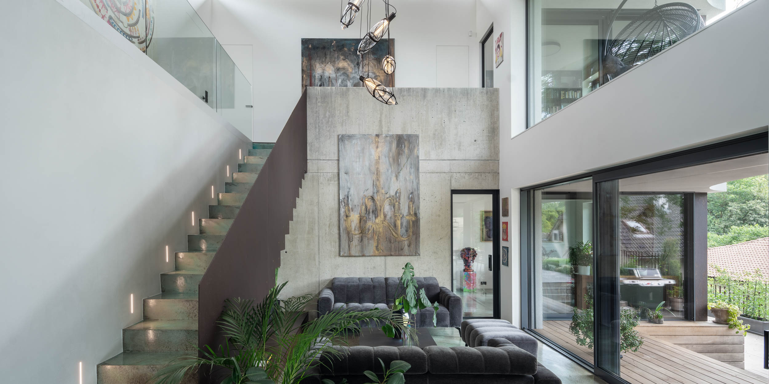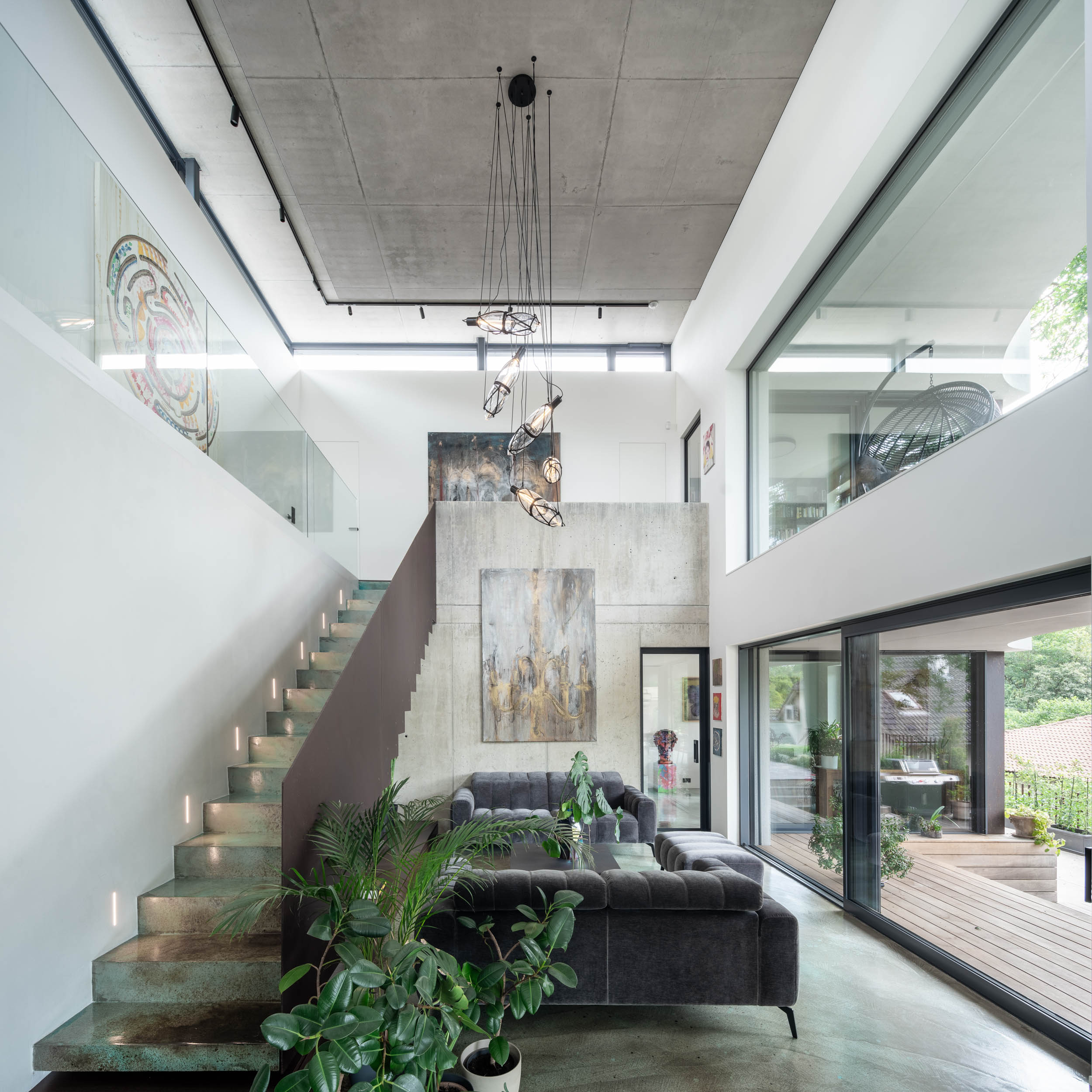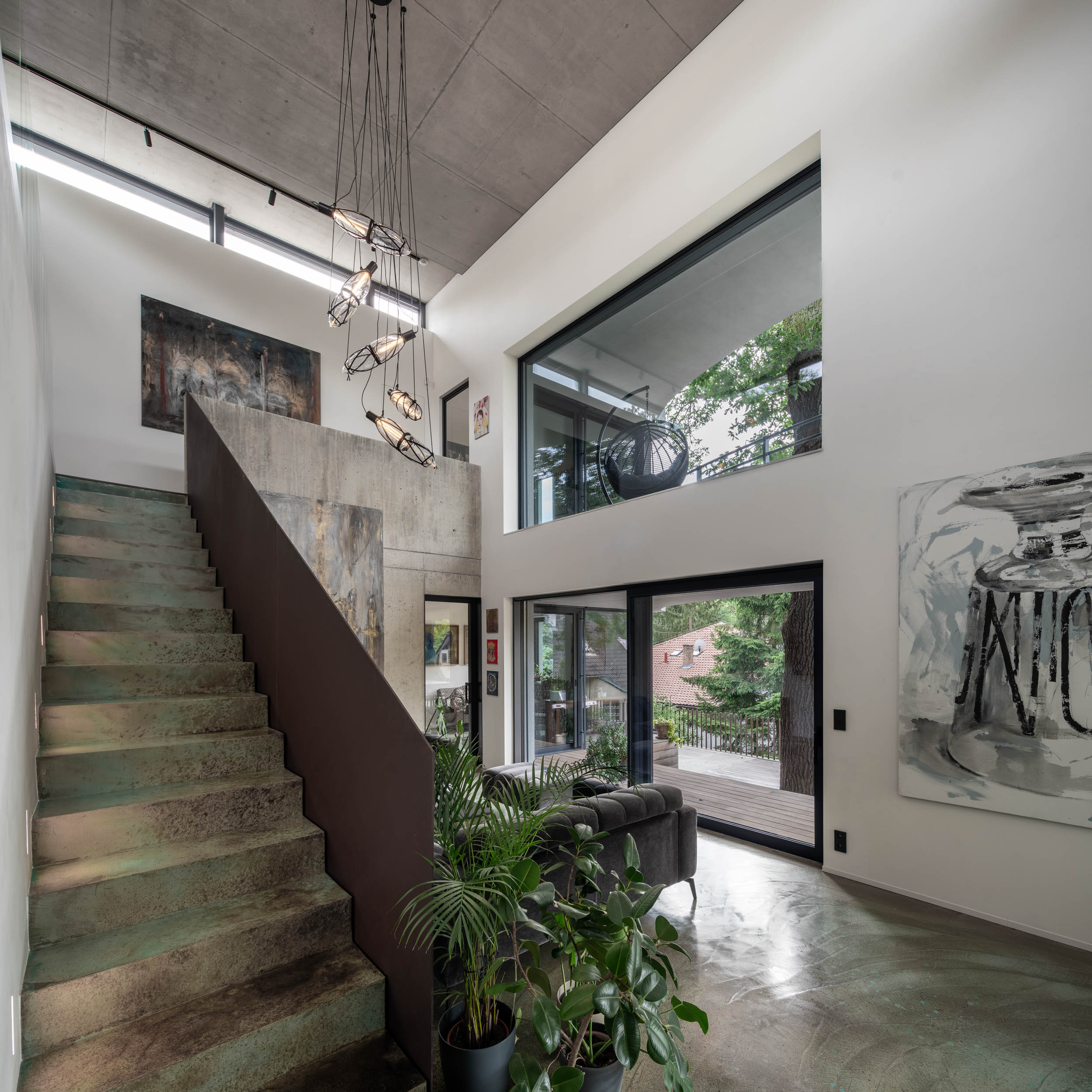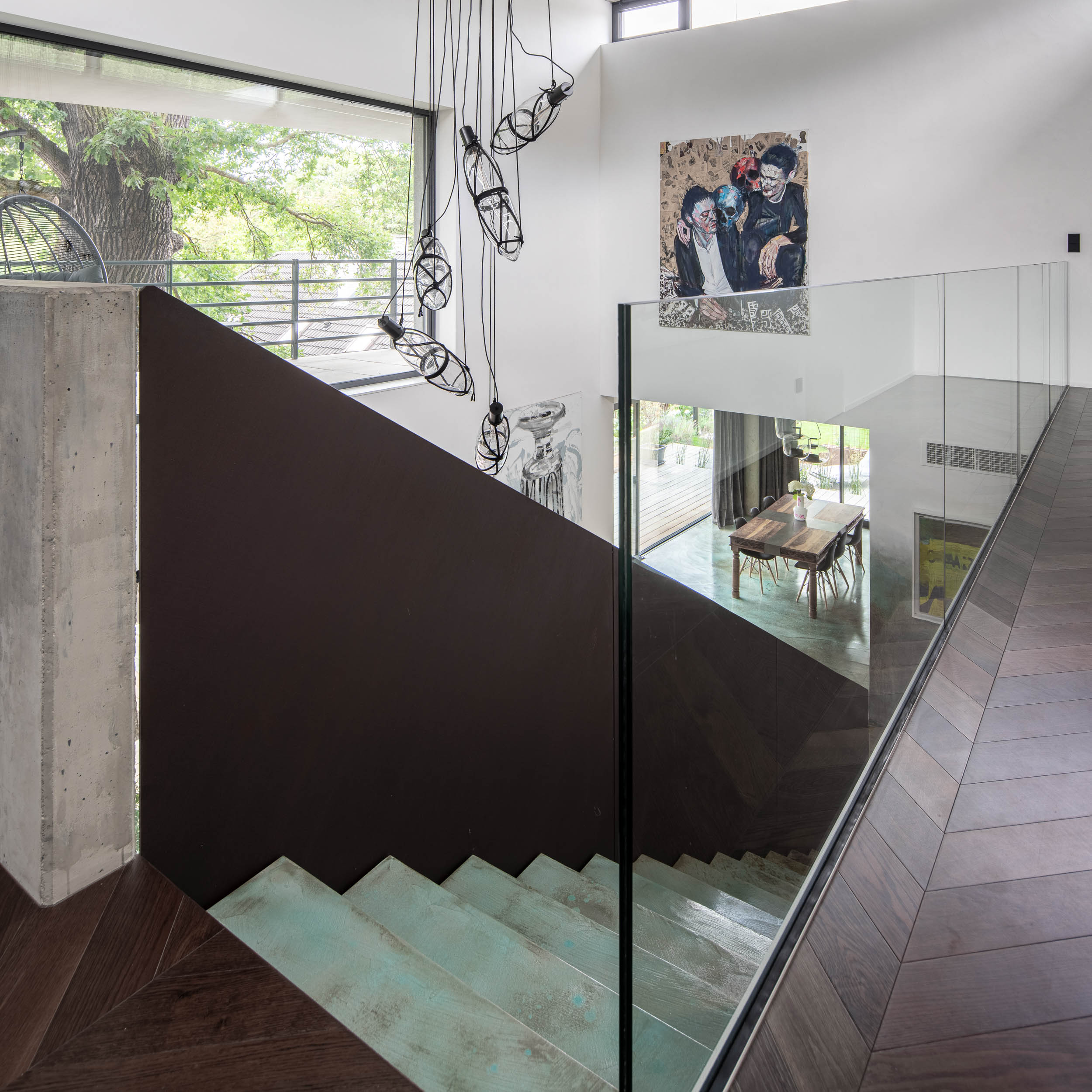 Při řešení zábradlí jsme vyzkoušeli nespočet variant. Použití pouze skleněného zábradlí nám přišlo příliš fádní, zatímco sítě by působily až příliš divoce. Potřebovali jsme vytvořit podklad pro umění. Nakonec jsme se rozhodli pro prodloužení monolitické betonové stěny v obývacím pokoji až po výšku zábradlí, čímž vznikla větší plocha pro umělecké dílo. Druhou část zábradlí na patře jsme nechali skleněnou, aby obrazy byly viditelné i ze spodního patra. Samotné schodiště pak doplnilo plné kortenové zábradlí, které vyniká svou texturou a charakterem.