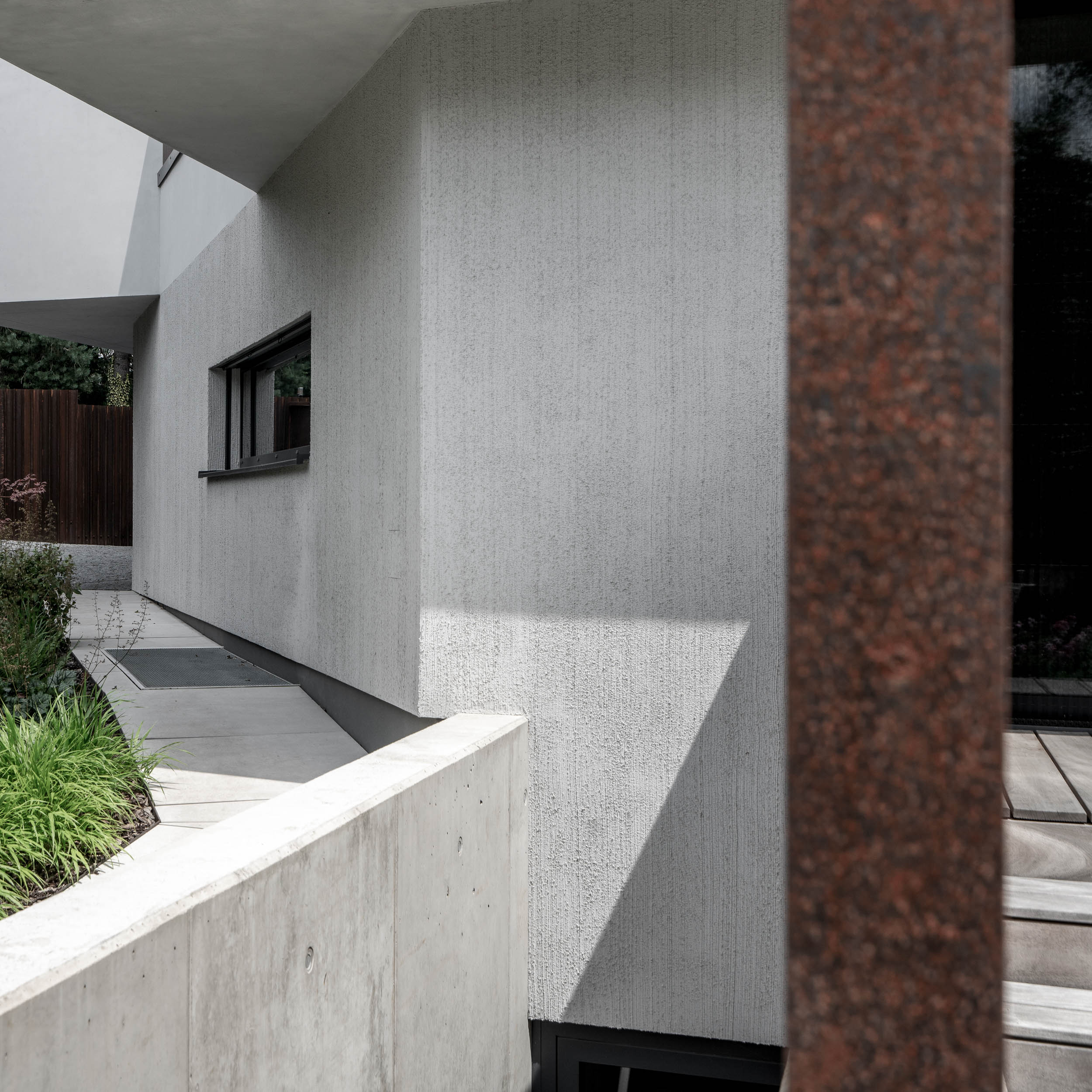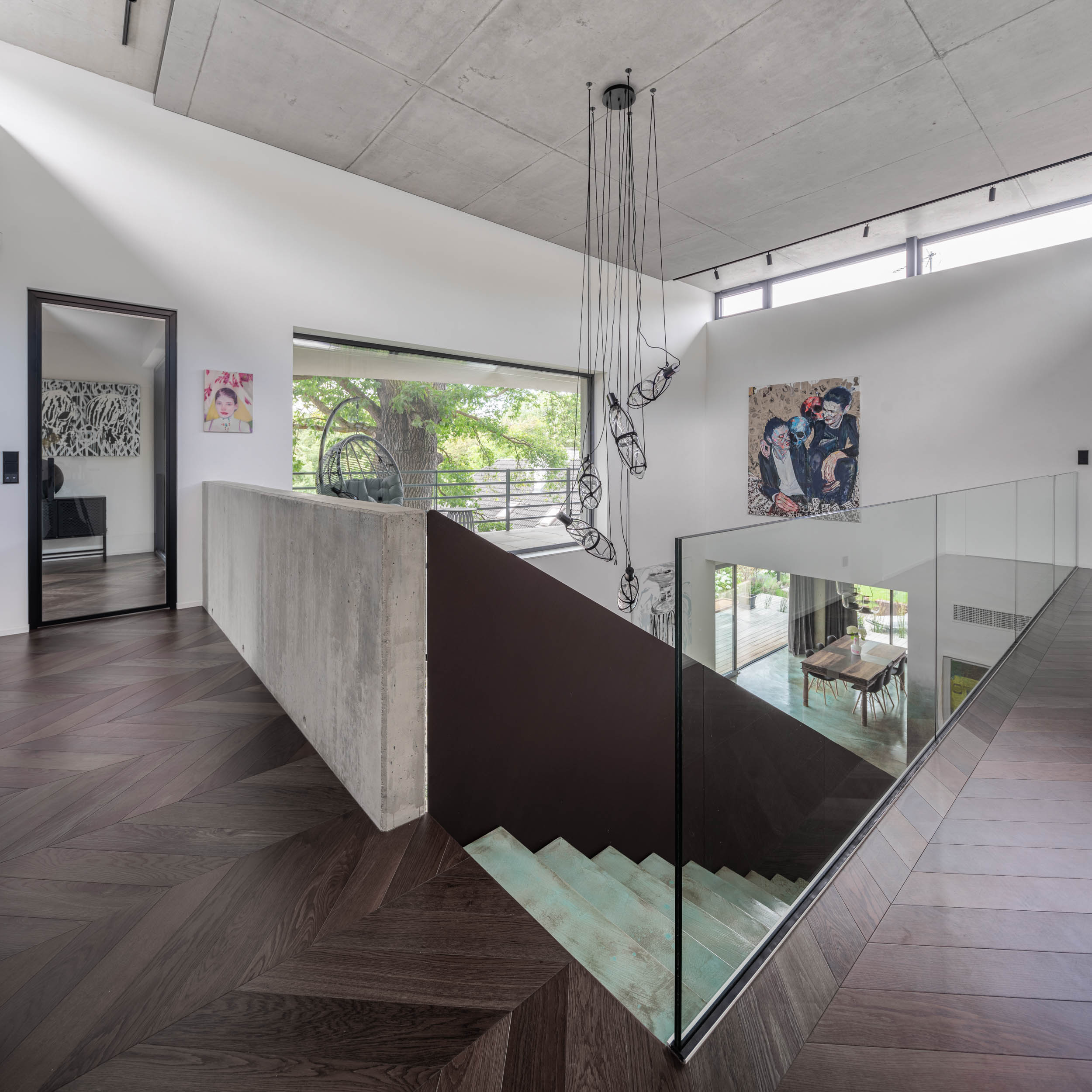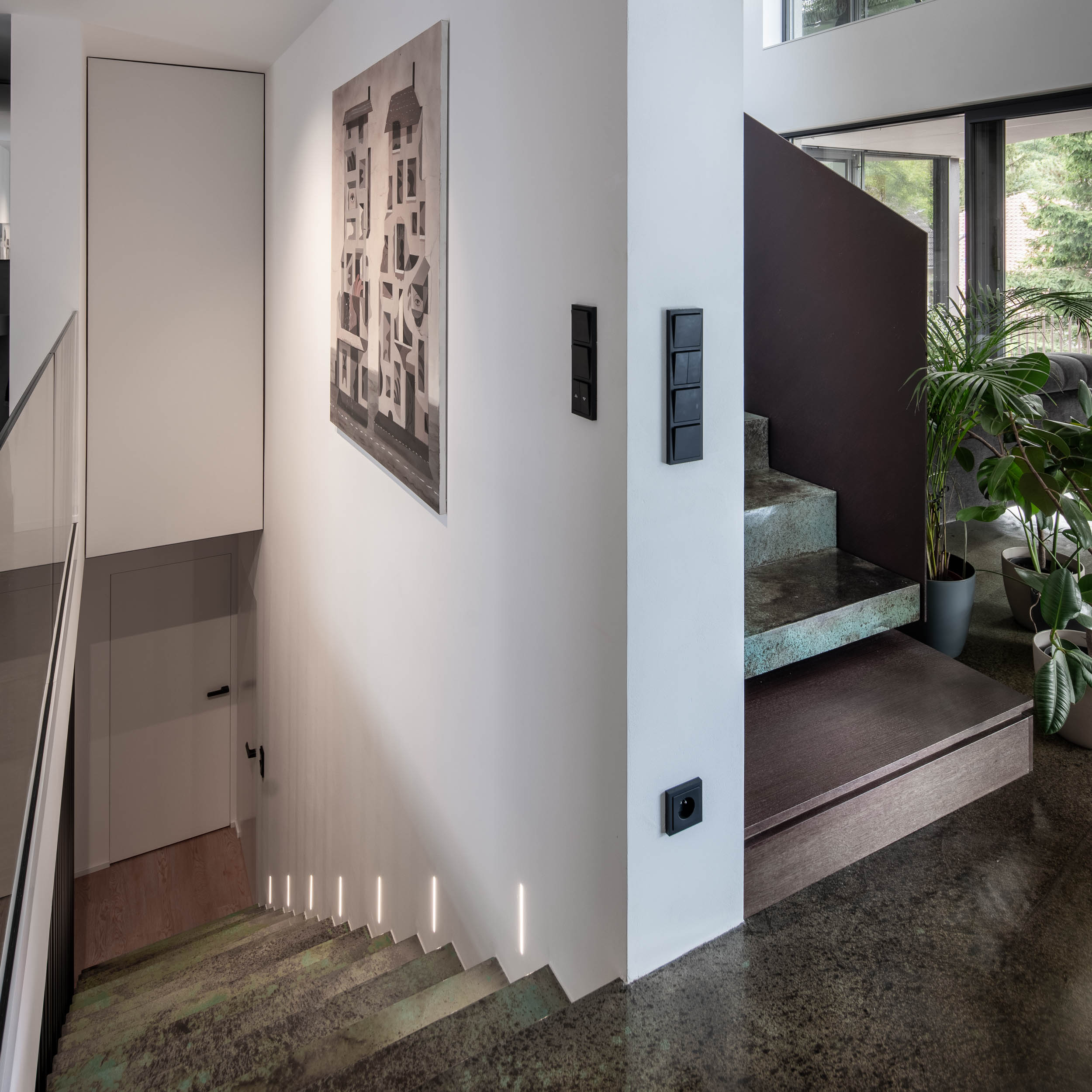 Při řešení zábradlí jsme vyzkoušeli nespočet variant. Použití pouze skleněného zábradlí nám přišlo příliš fádní, zatímco sítě by působily až příliš divoce. Potřebovali jsme vytvořit podklad pro umění. Nakonec jsme se rozhodli pro prodloužení monolitické betonové stěny v obývacím pokoji až po výšku zábradlí, čímž vznikla větší plocha pro umělecké dílo. Druhou část zábradlí na patře jsme nechali skleněnou, aby obrazy byly viditelné i ze spodního patra. Samotné schodiště pak doplnilo plné kortenové zábradlí, které vyniká svou texturou a charakterem.