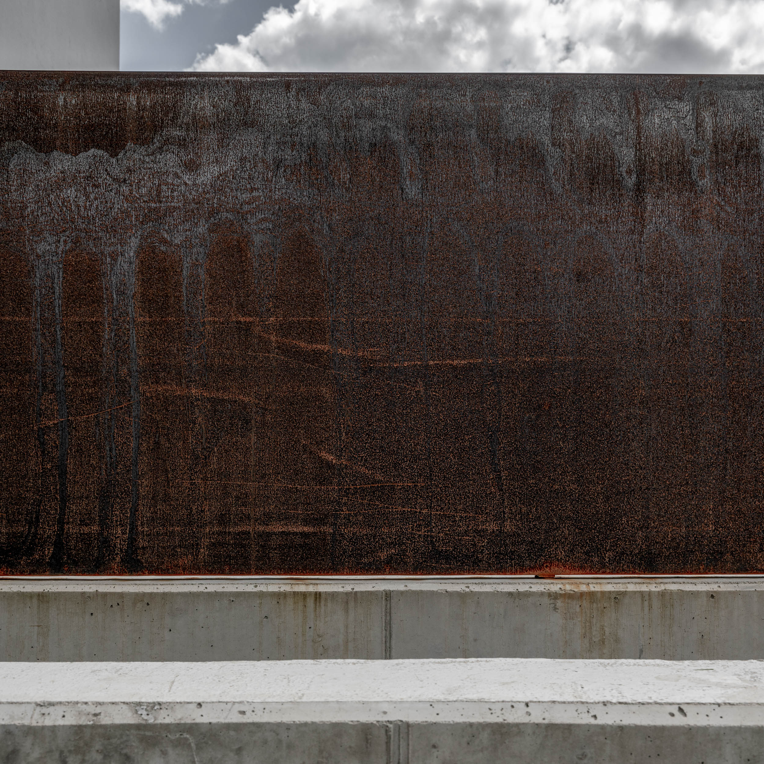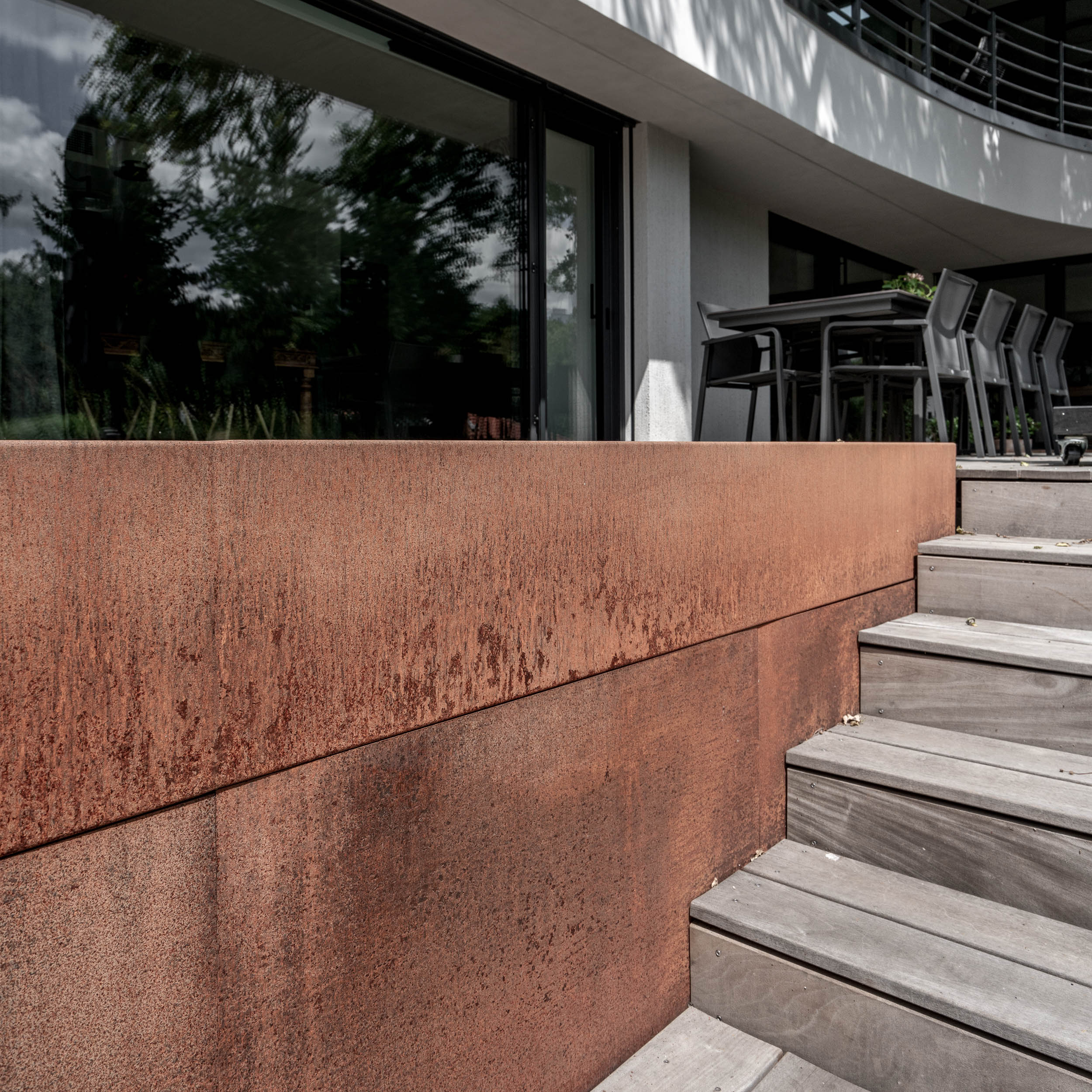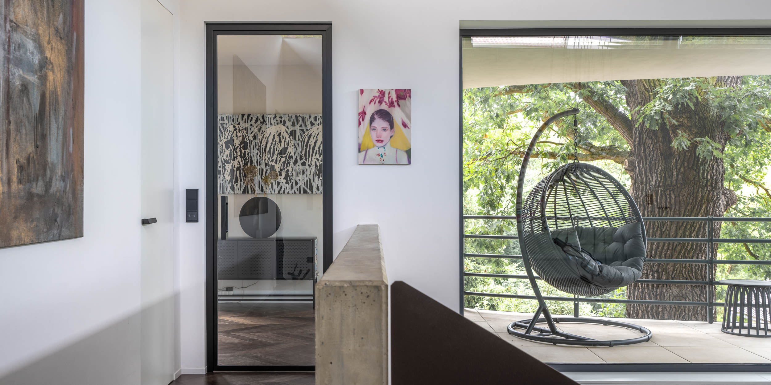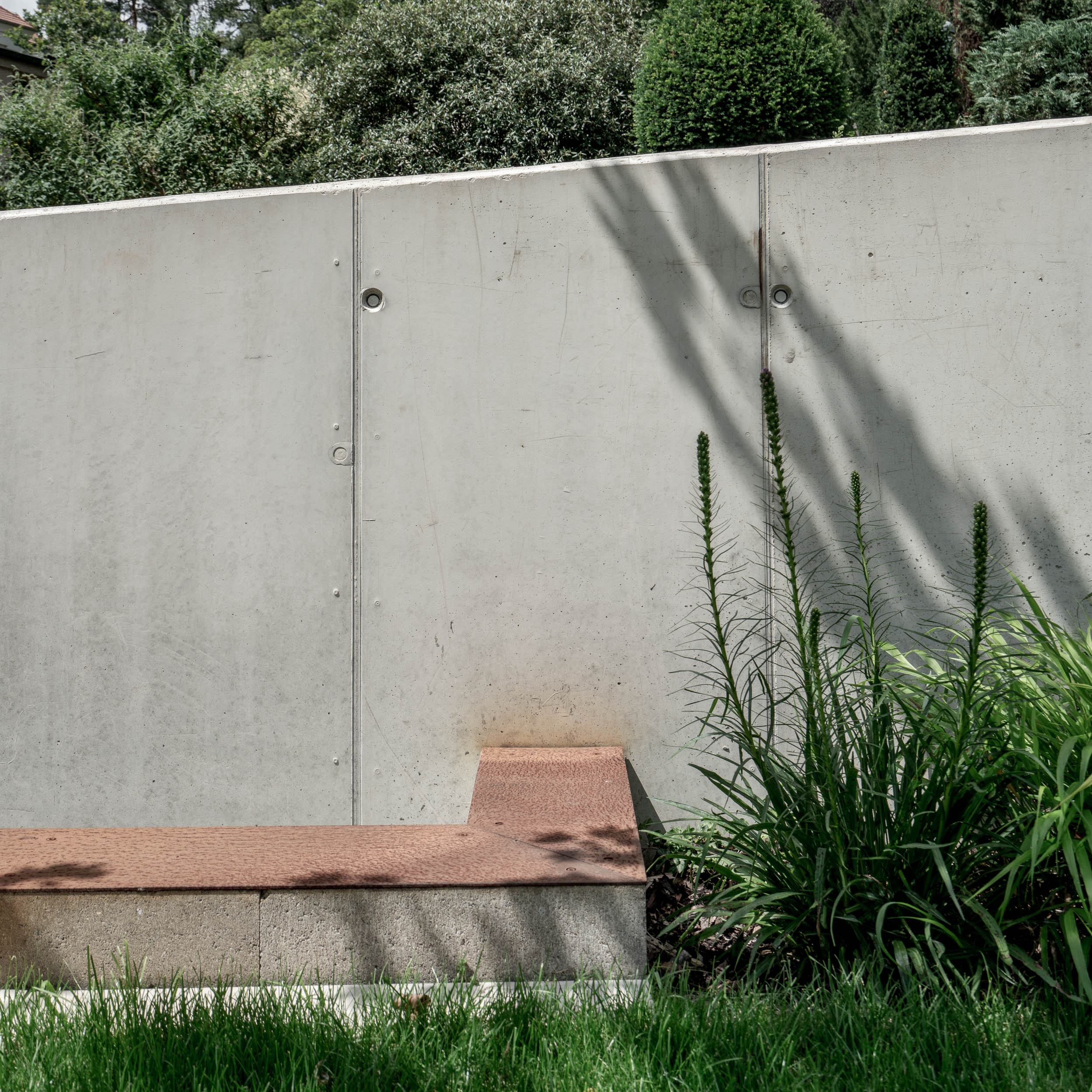 Při řešení zábradlí jsme vyzkoušeli nespočet variant. Použití pouze skleněného zábradlí nám přišlo příliš fádní, zatímco sítě by působily až příliš divoce. Potřebovali jsme vytvořit podklad pro umění. Nakonec jsme se rozhodli pro prodloužení monolitické betonové stěny v obývacím pokoji až po výšku zábradlí, čímž vznikla větší plocha pro umělecké dílo. Druhou část zábradlí na patře jsme nechali skleněnou, aby obrazy byly viditelné i ze spodního patra. Samotné schodiště pak doplnilo plné kortenové zábradlí, které vyniká svou texturou a charakterem.