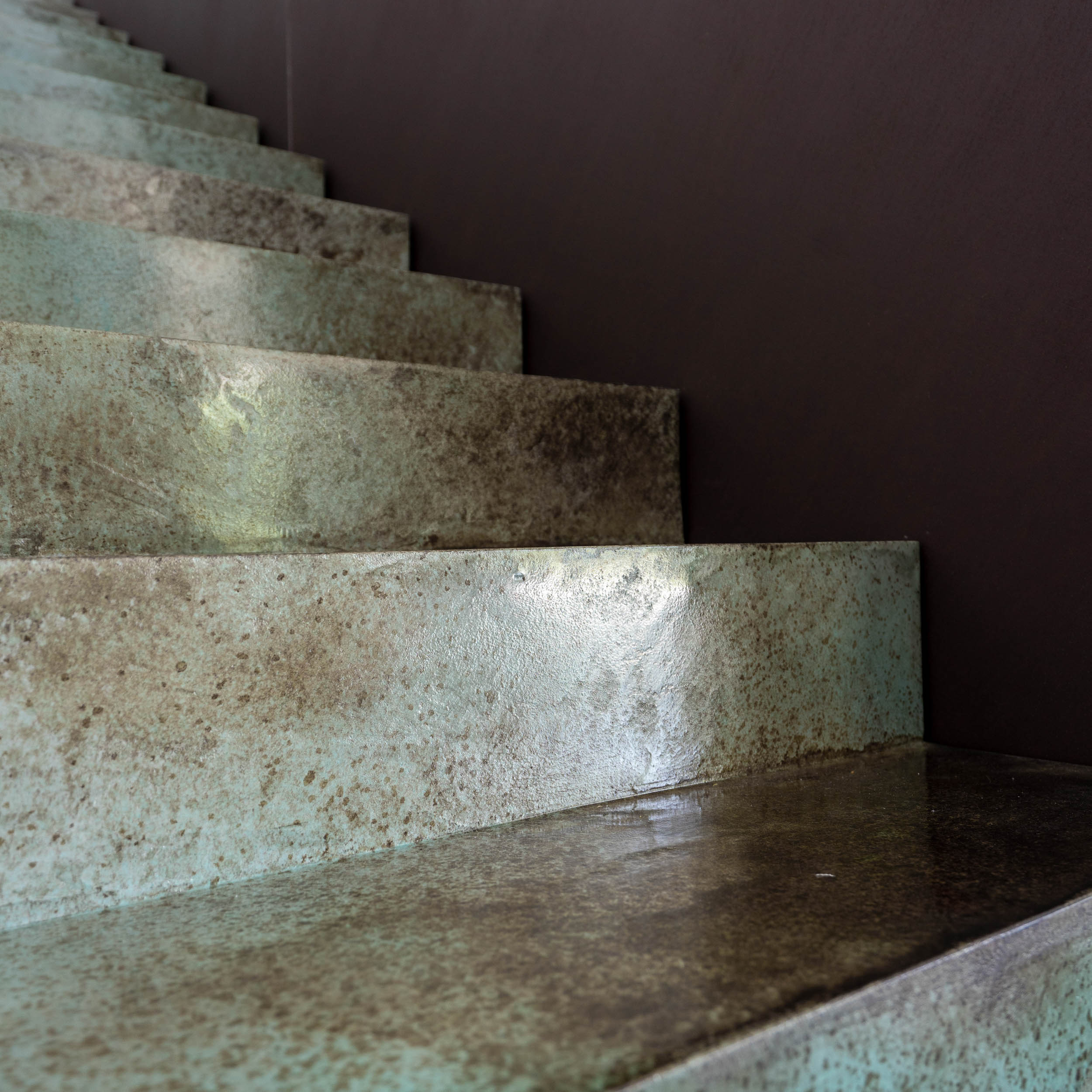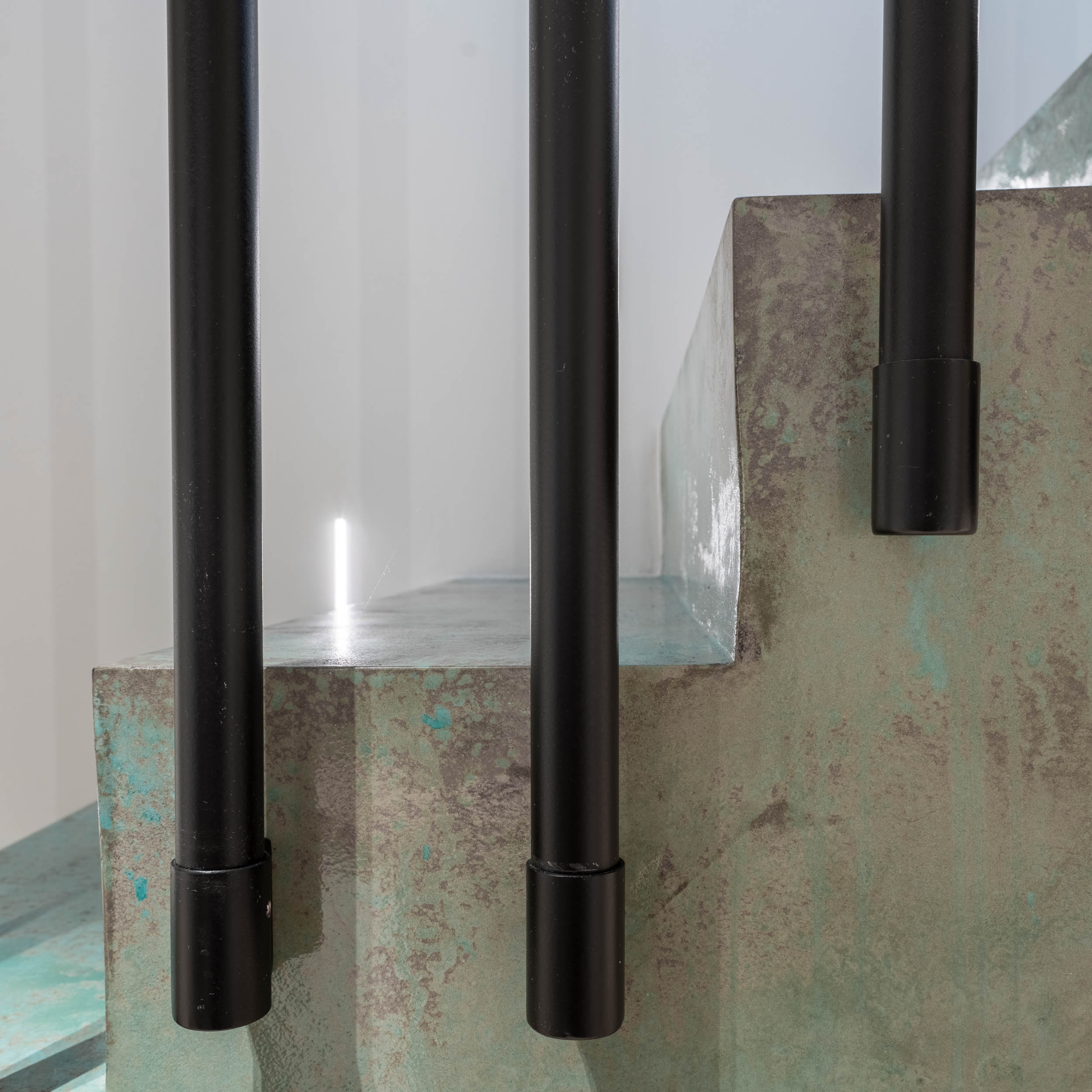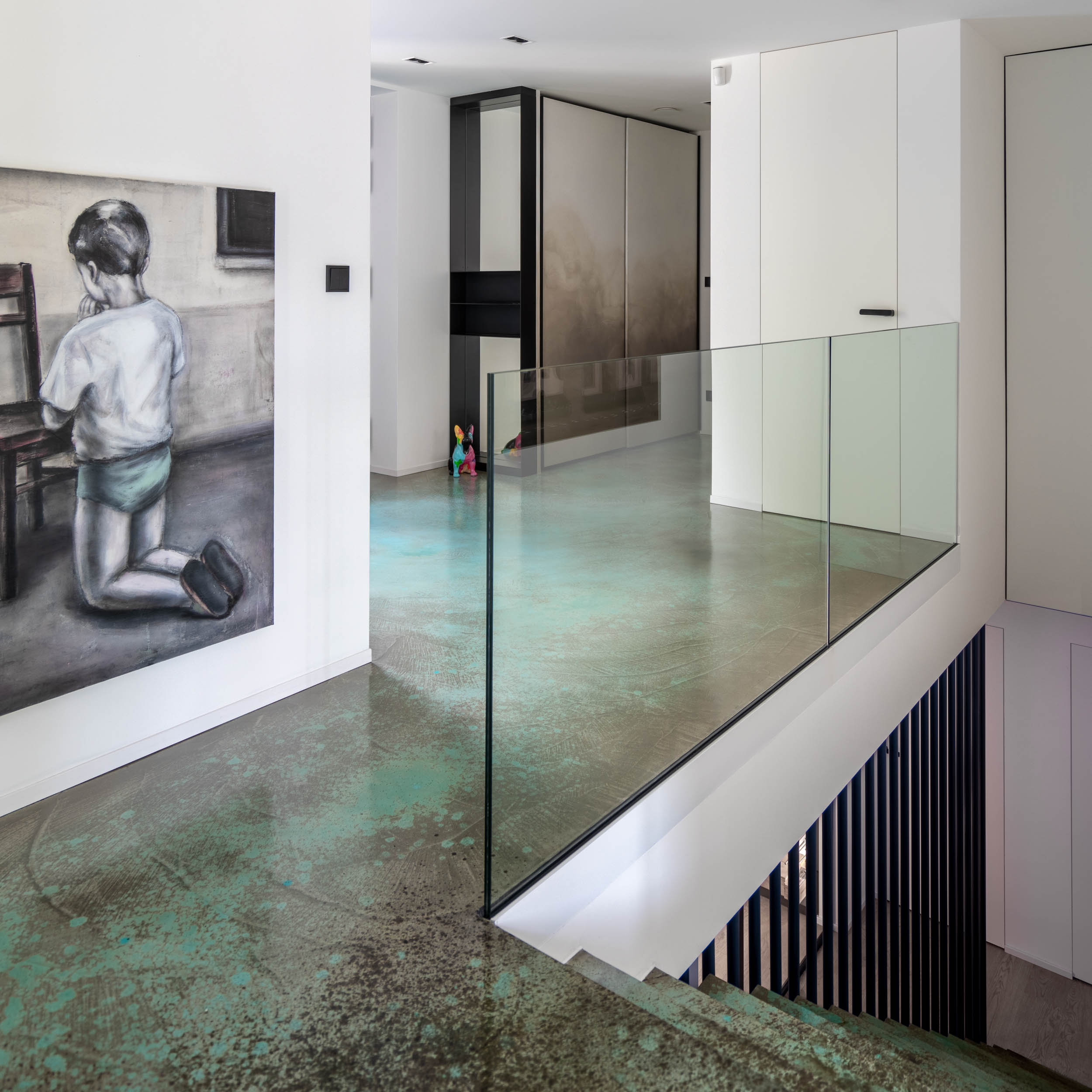Protože interiér není pouze bílý, rozhodli jsme se pro odvážné kombinace barevných betonových stěrek a rezavé oceli. Samotná stěrka se stává uměleckým dílem sama o sobě. Nezůstali jsme jen u podlahy, v kuchyni jsme stěrkou „vyběhli“ až na stěny. Barevnou stěrku jsme použili dokonce i na samotné stupně schodiště, což dodává prostoru jedinečný a dynamický charakter. Stěrky jsou naším oblíbeným materiálem, díky své neuvěřitelné praktičnosti, a protože je používáme často, rádi s nimi experimentujeme a hledáme nové způsoby jejich využití.