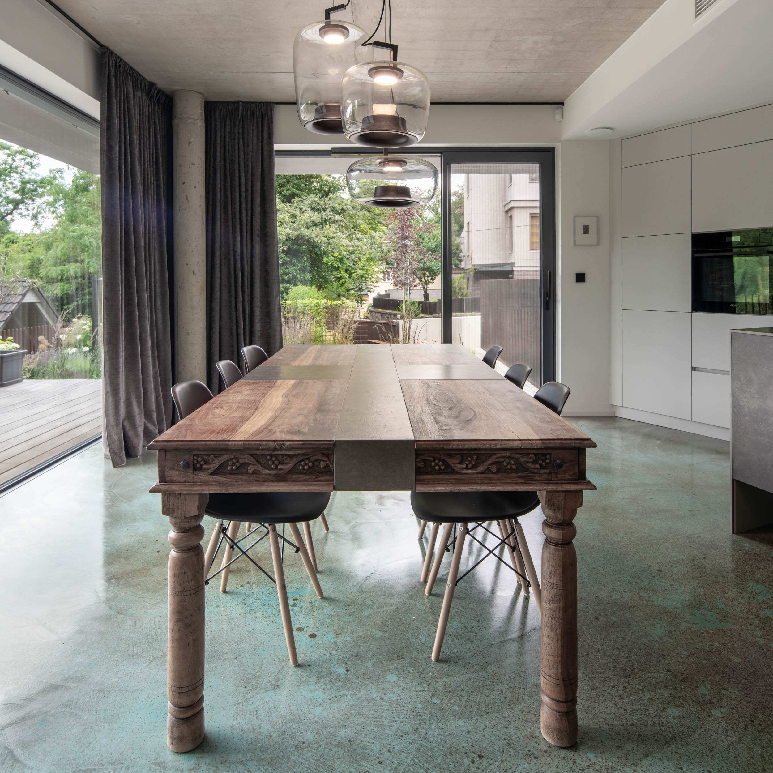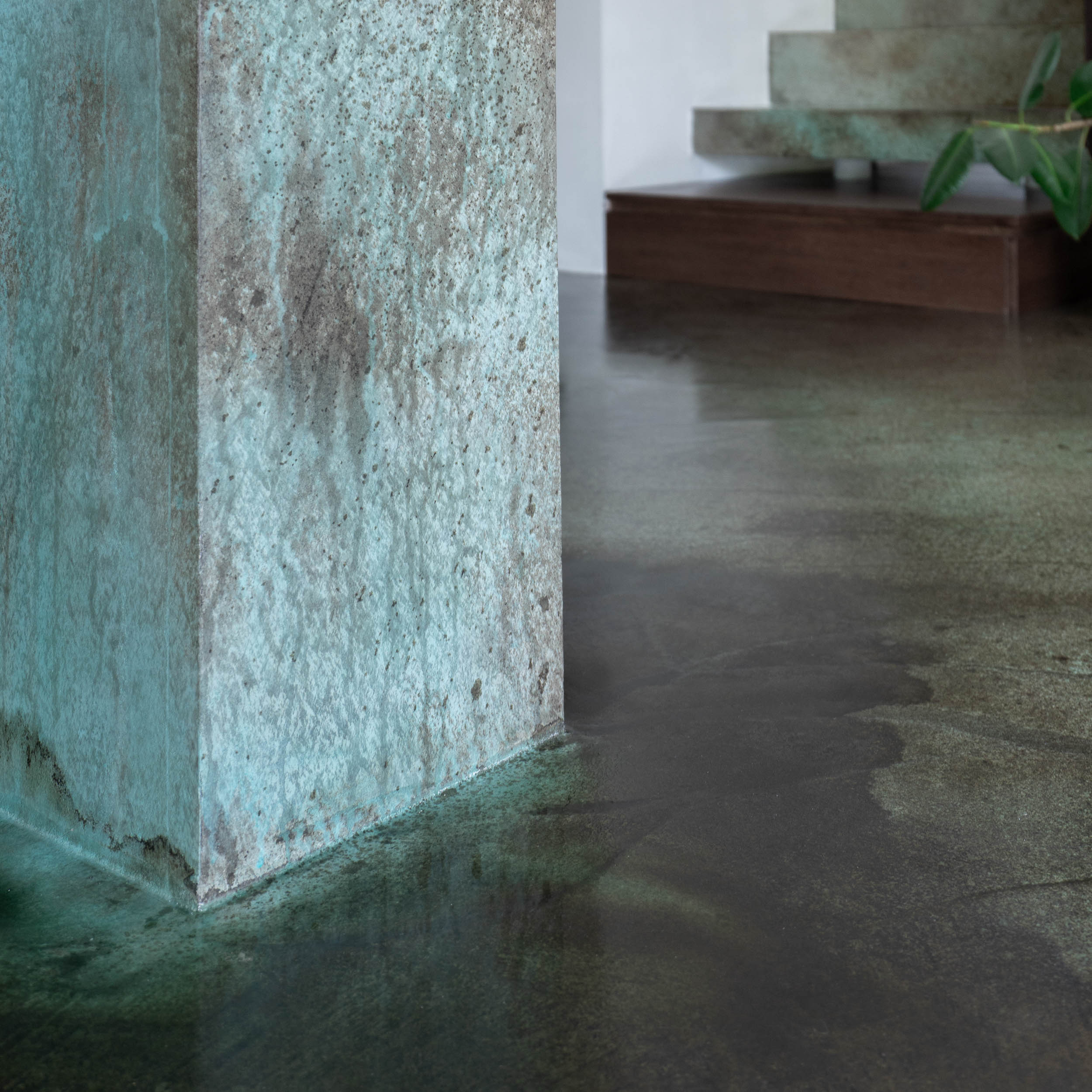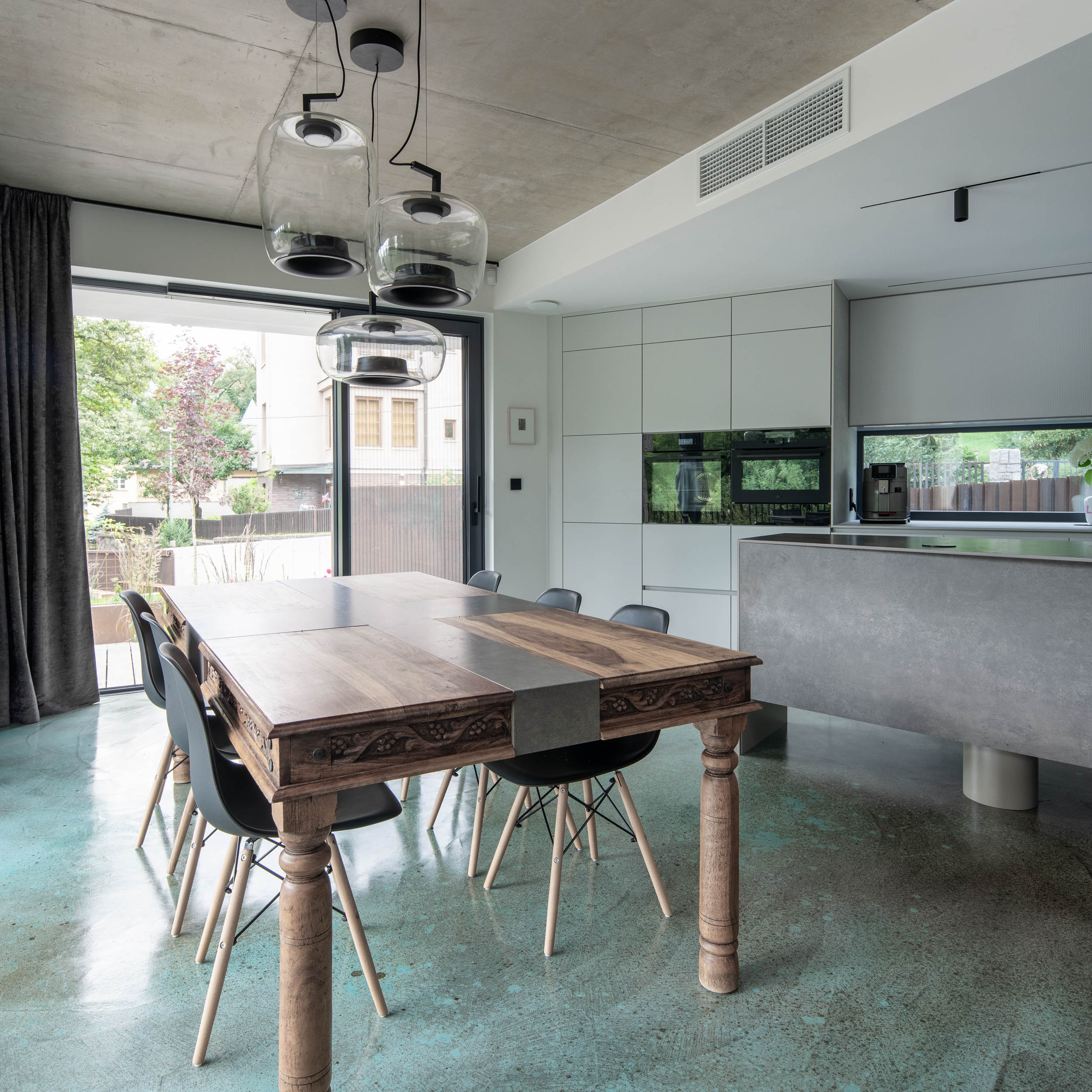Protože interiér není pouze bílý, rozhodli jsme se pro odvážné kombinace barevných betonových stěrek a rezavé oceli. Samotná stěrka se stává uměleckým dílem sama o sobě. Nezůstali jsme jen u podlahy, v kuchyni jsme stěrkou „vyběhli“ až na stěny. Barevnou stěrku jsme použili dokonce i na samotné stupně schodiště, což dodává prostoru jedinečný a dynamický charakter. Stěrky jsou naším oblíbeným materiálem, díky své neuvěřitelné praktičnosti, a protože je používáme často, rádi s nimi experimentujeme a hledáme nové způsoby jejich využití.