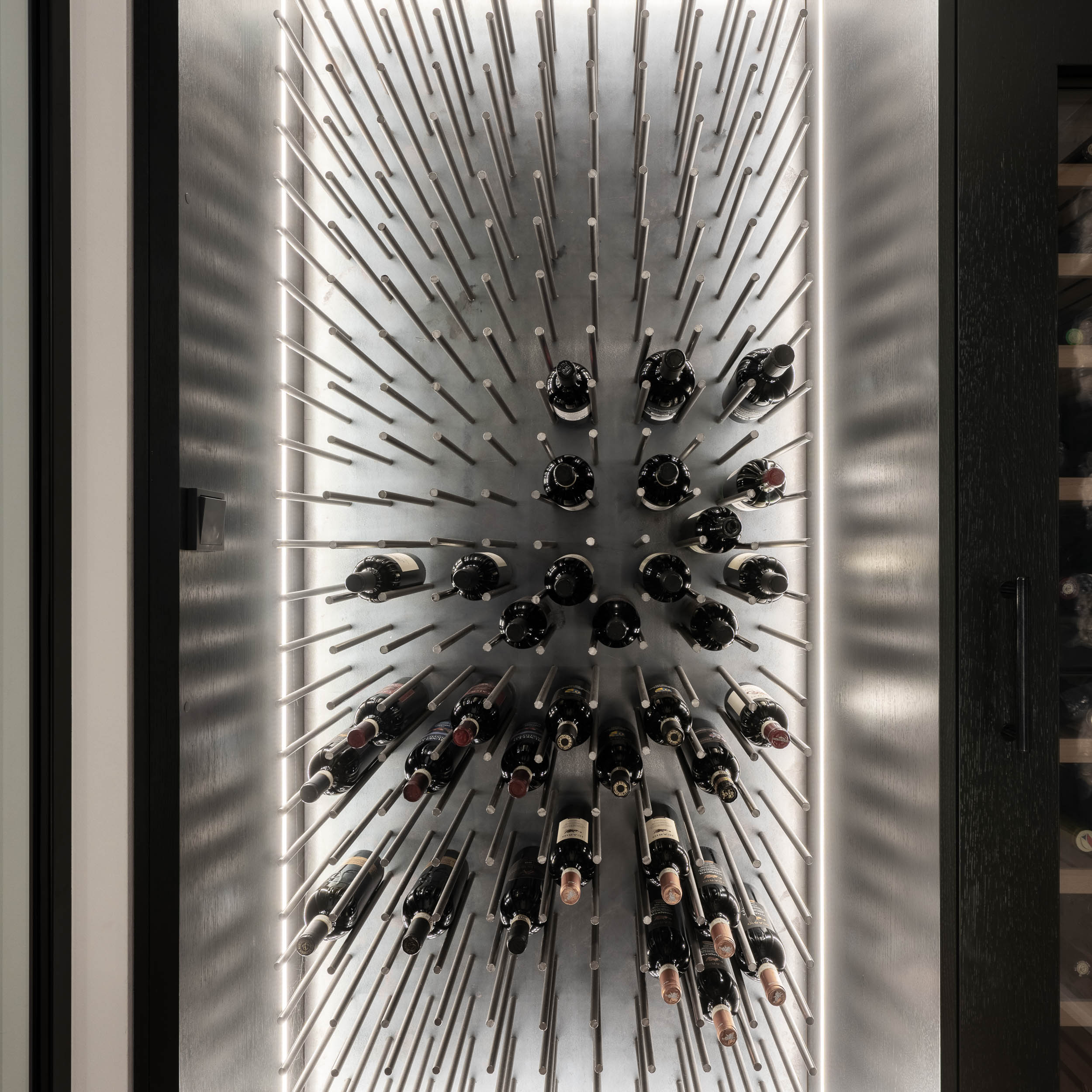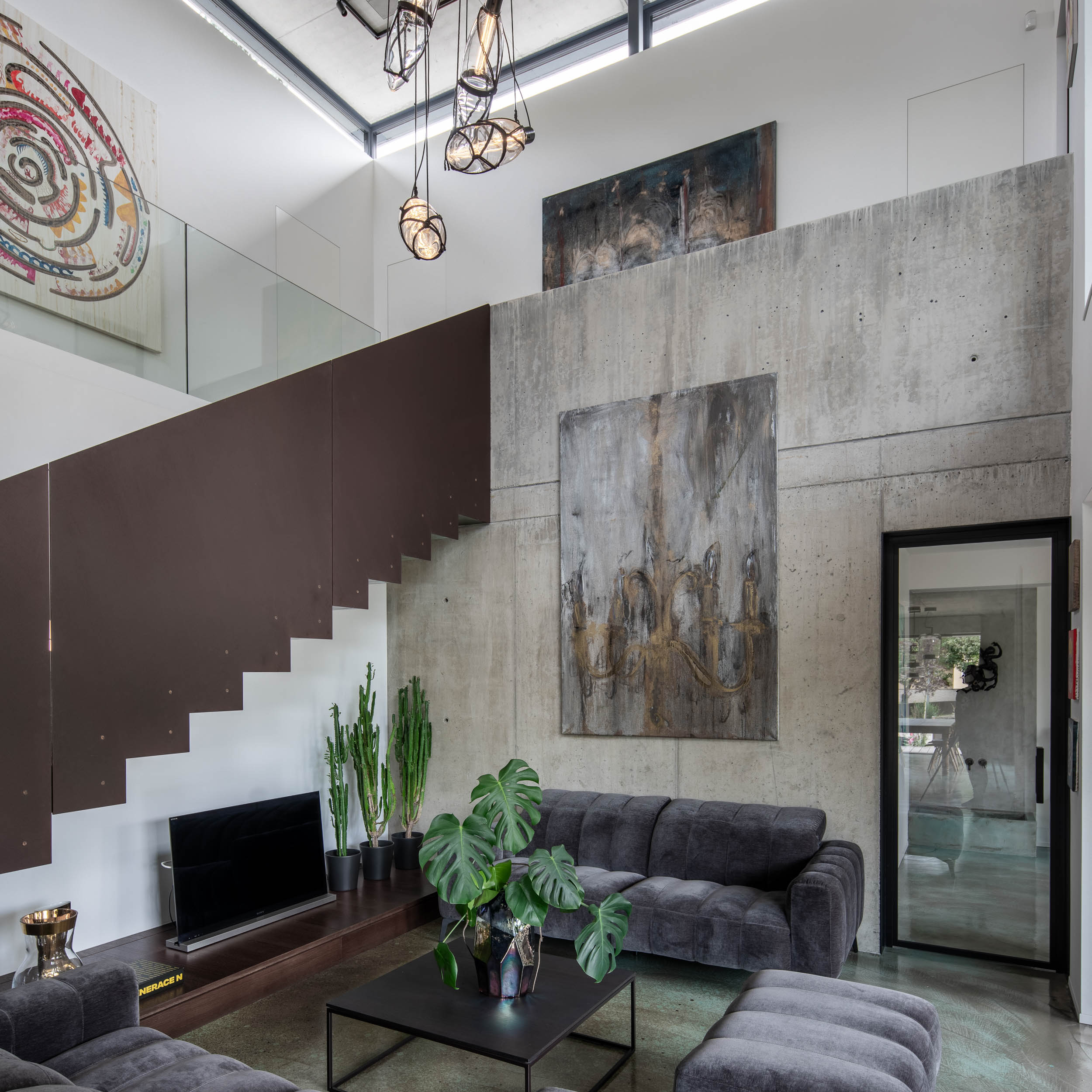 Od první chvíle jsme uvažovali o různých možnostech, co umístit do otevřeného prostoru ve středu domu. Zvažovali jsme například kuchyni, která by byla částečně pod schodištěm, a jídelní stůl s výrazným lustrem zavěšeným o patro výš. Nakonec jsme se rozhodli pro řešení, kde kuchyně zůstala v nízké části s klasickou výškou stropu, zatímco v otevřeném prostoru vznikl obývací pokoj. Televize v tomto prostoru není středobodem – v domě je dominantní umění, a televize se spíše skrývá pod schodištěm, čímž dává prostor uměleckým dílům, která jsou skutečnými hodnotami tohoto interiéru.