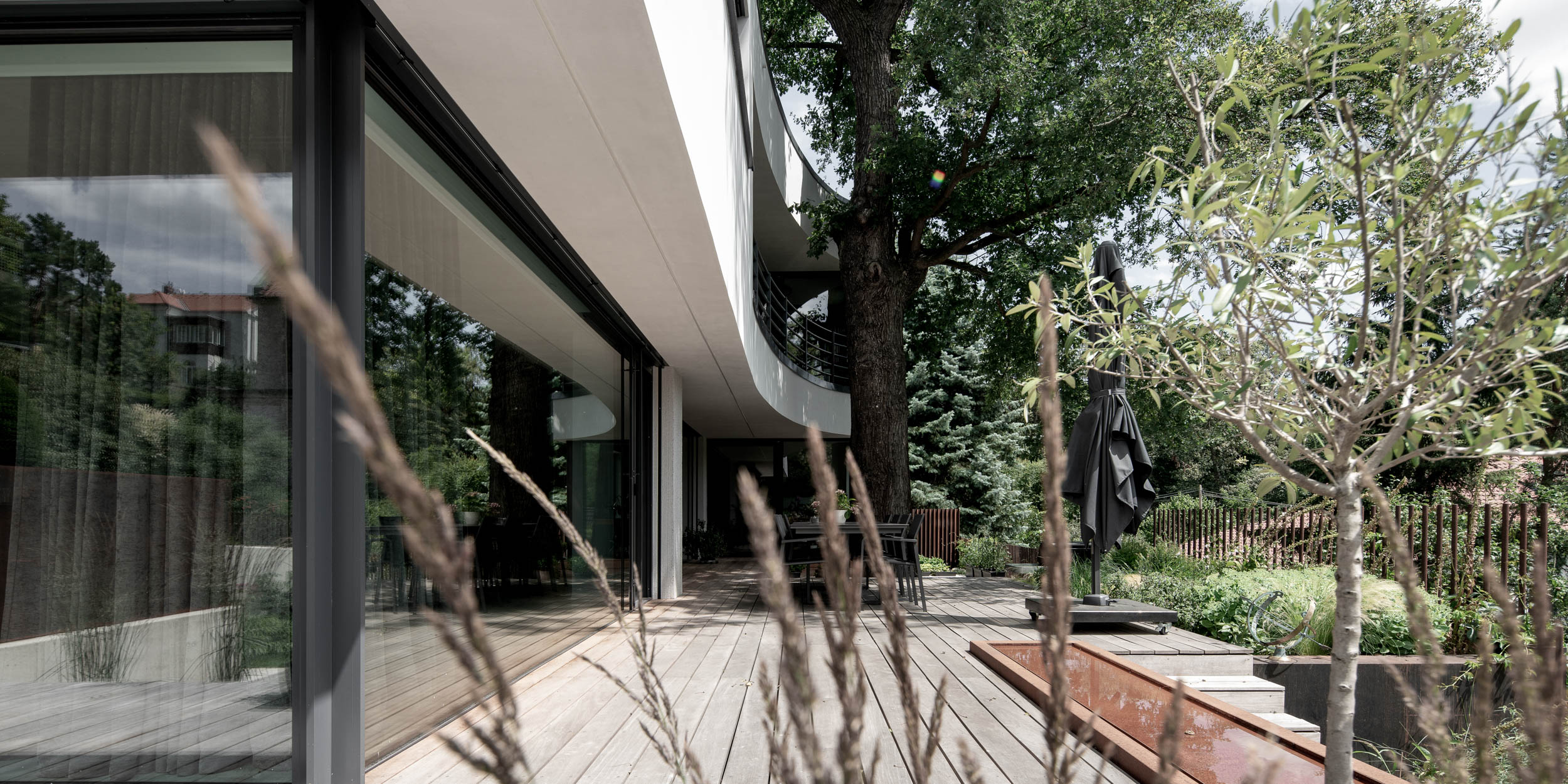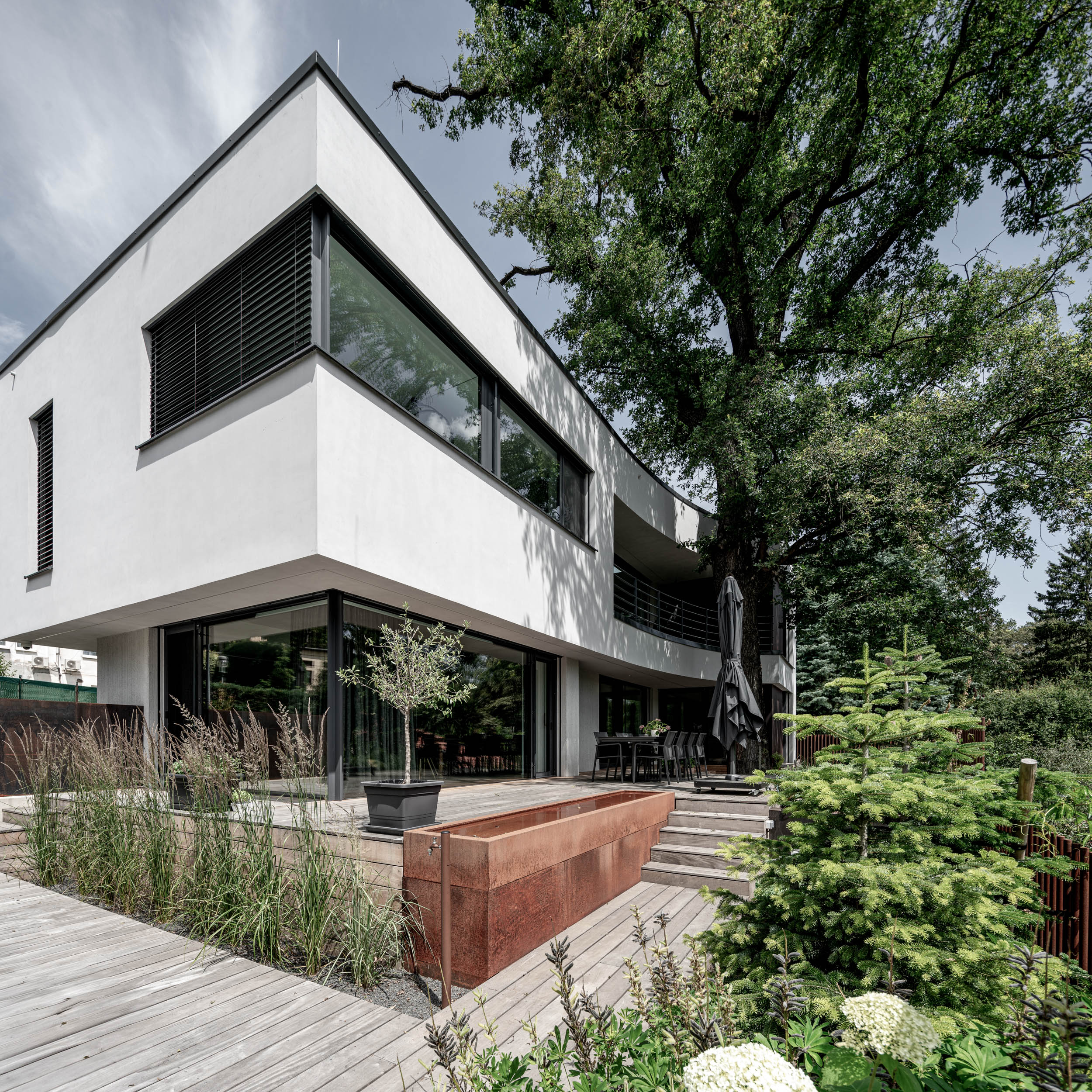 Projekt vily je dílem studia KarešArch. Tato realizace je příkladem toho, jak navazujeme na stávající návrh jiného architekta. Pokud, jako v tomto případě, projekt interiéru začne včas, je prostor řešit vše od konstrukčních detailů až po interiér, výsledkem je dokonale dokončená vila po všech stránkách. Interiér je pak v dokonalé symbióze s exteriérem a tak to má být.