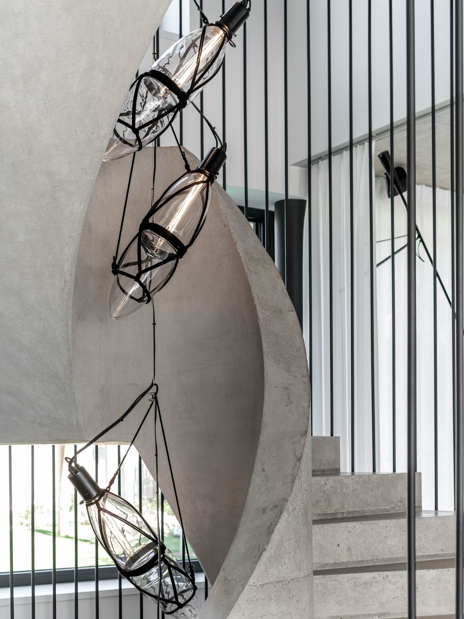 Proto jsme zvolili variantu s tyčový tubusem kolem celého schodiště přes tři patra a skleněným zábradlí v otevřeném prostoru obývacího pokoje. Celé schodiště je odlité z betonu a bylo velmi náročné na přesnost připravit kotvení ocelových tyčí nebo zabudovaného osvětlení stupňů. Ještě pořád si tady někdo myslí, že interiér je o nábytku? Abychom dojem schodiště umocnili, usadili jsme do jeho středu zavěšená svítidla a celého ho ostěrkovali.