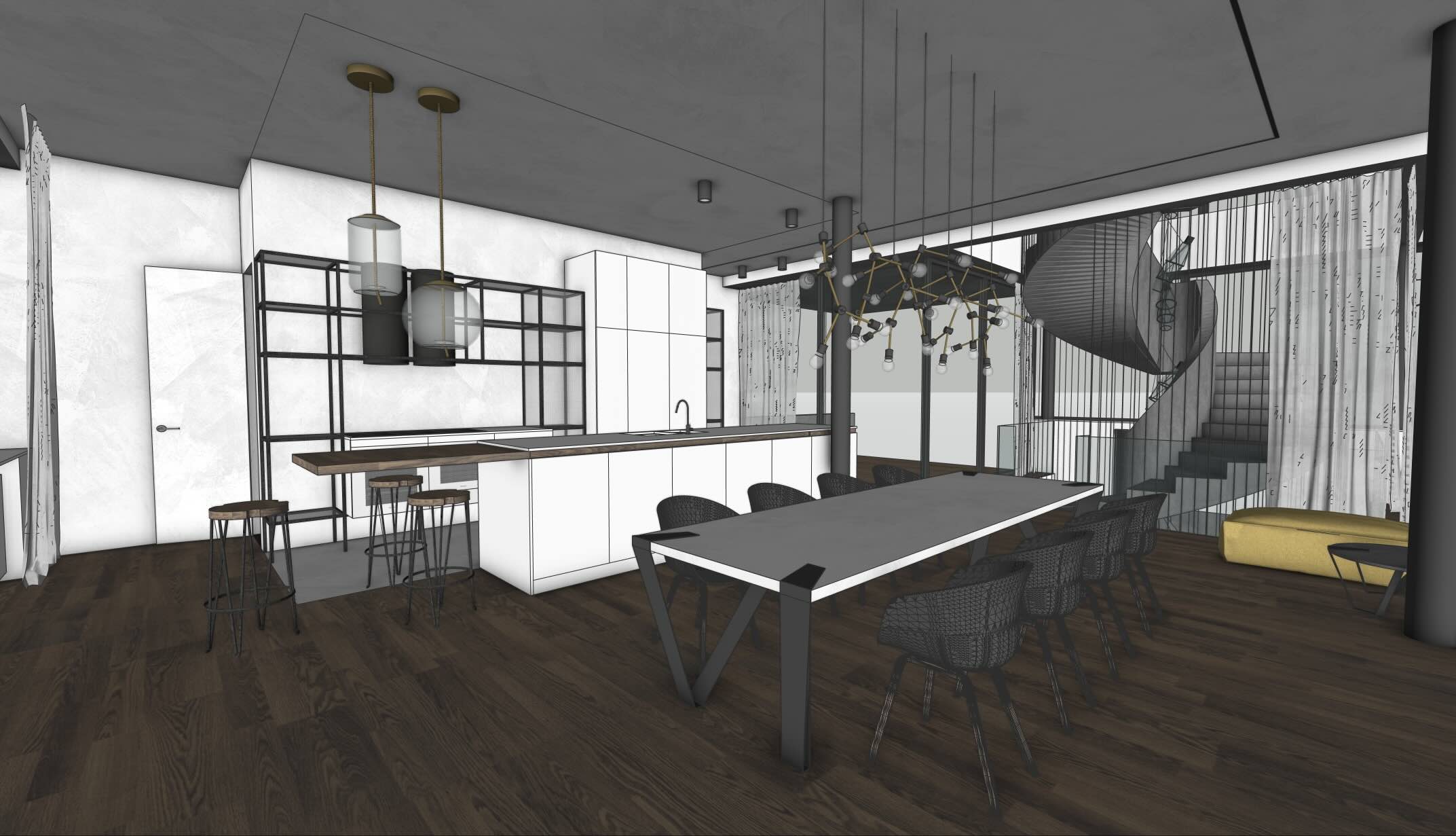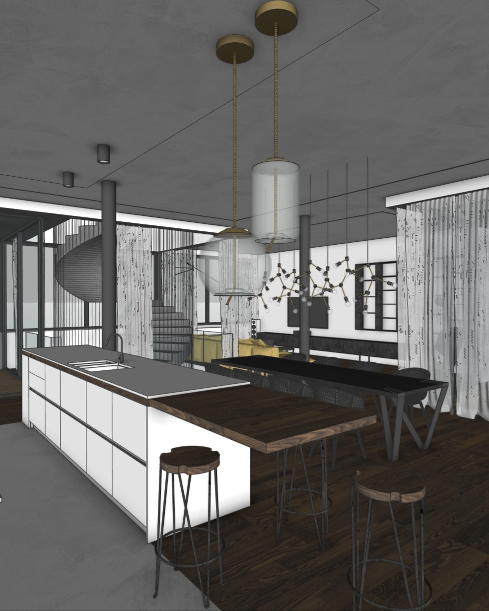 Zpracování do reálných materiálů s reálným světlem je velmi praktický pomocník. Nejen, že díky těmto vizualizacím dokážete vidět svůj budoucí prostor jako na fotce, ale poslouží i při výběru konkrétních materiálů v showroomech v navazujících fázích projektu. V tomto provedení zpracováváme zpravidla jen hlavní obytný prostor, tedy obývací pokoj, kuchyni, jídelnu. Tady se toho odehrává nejvíc a můžete si tak ověřit, jestli na Vás zvolená kombinace materiálů nepůsobí moc tmavě, přesvětleně, studeně a podobně. Není problém se domluvit na zpracování i dalších místností, pokud si to budete přát.
