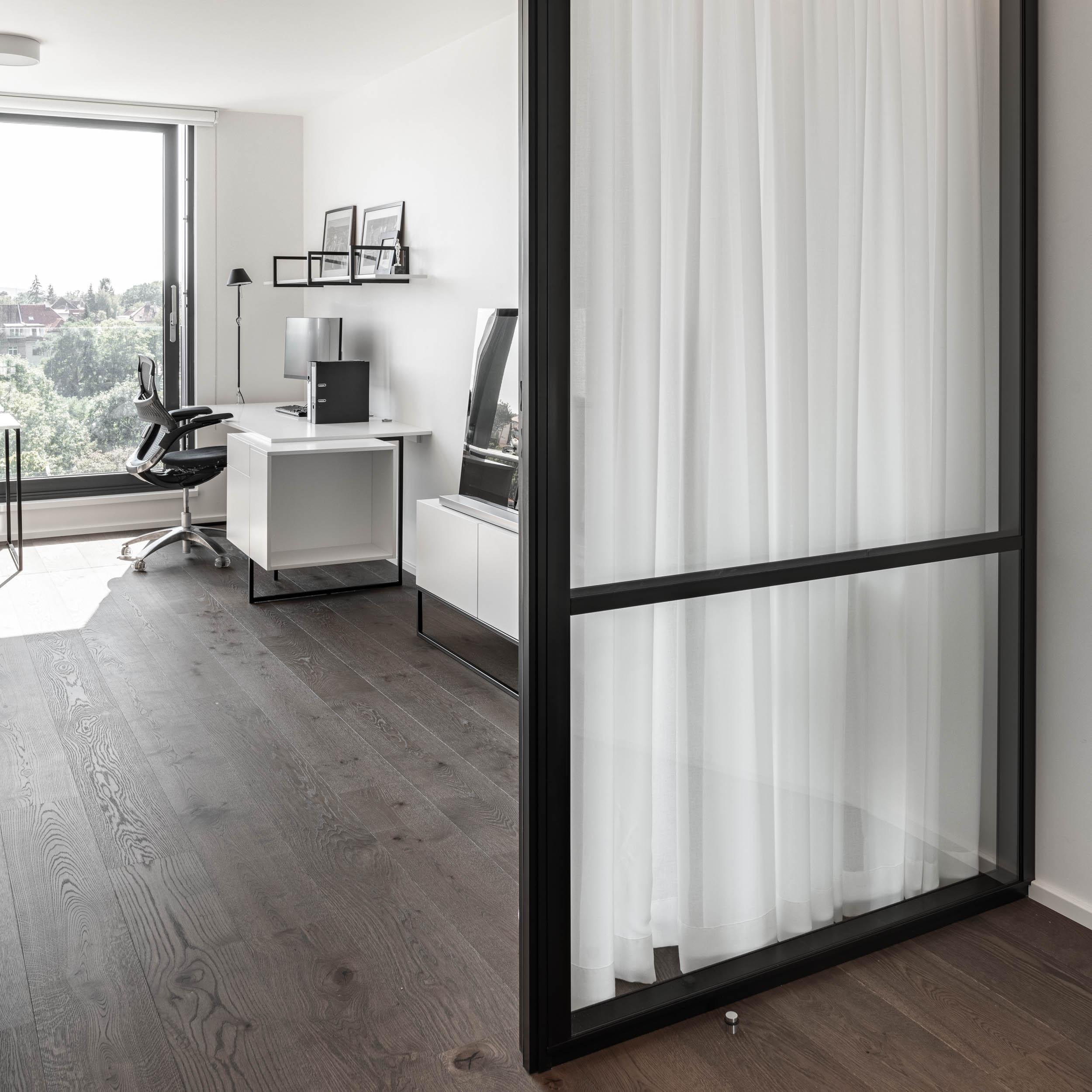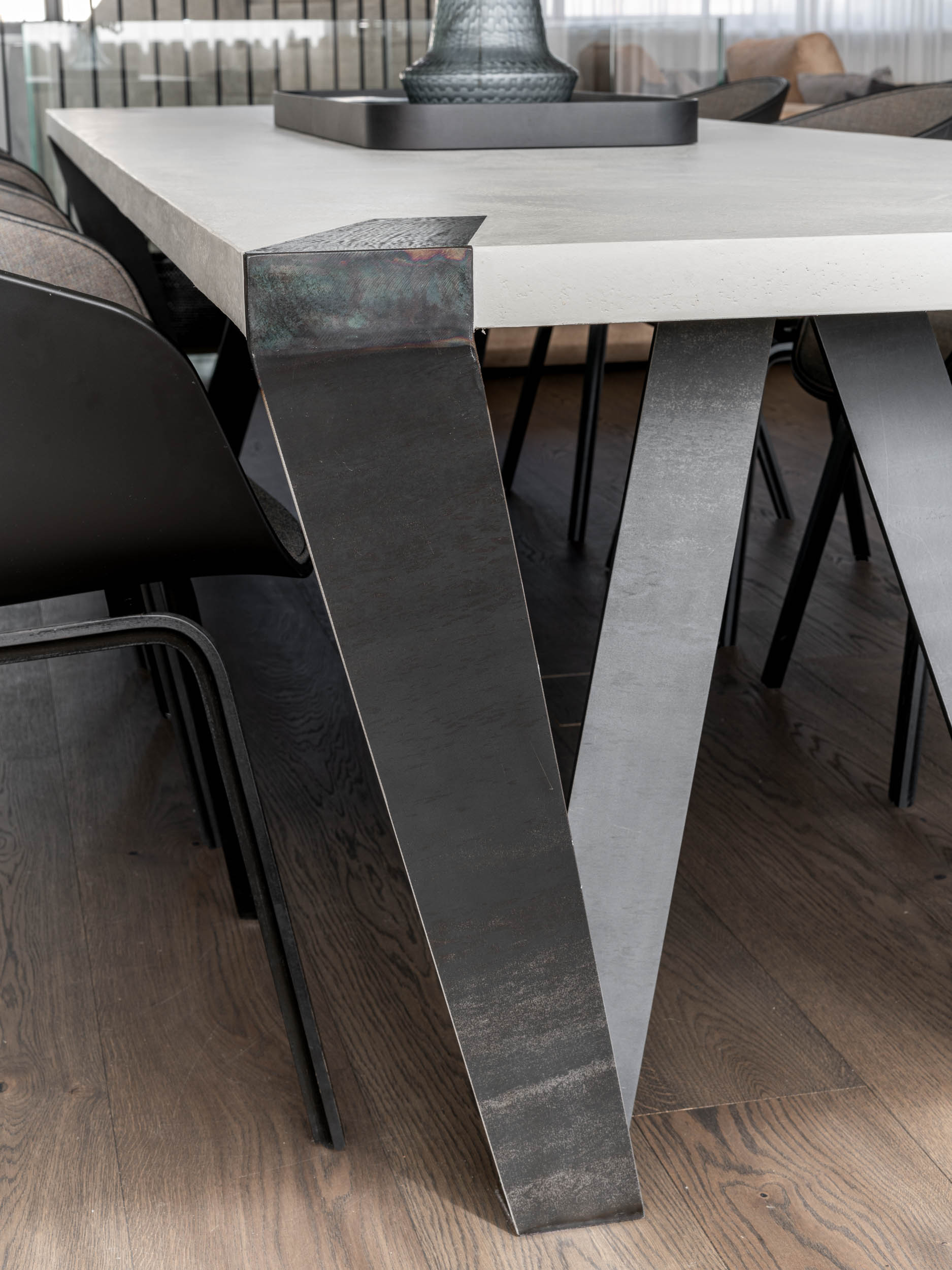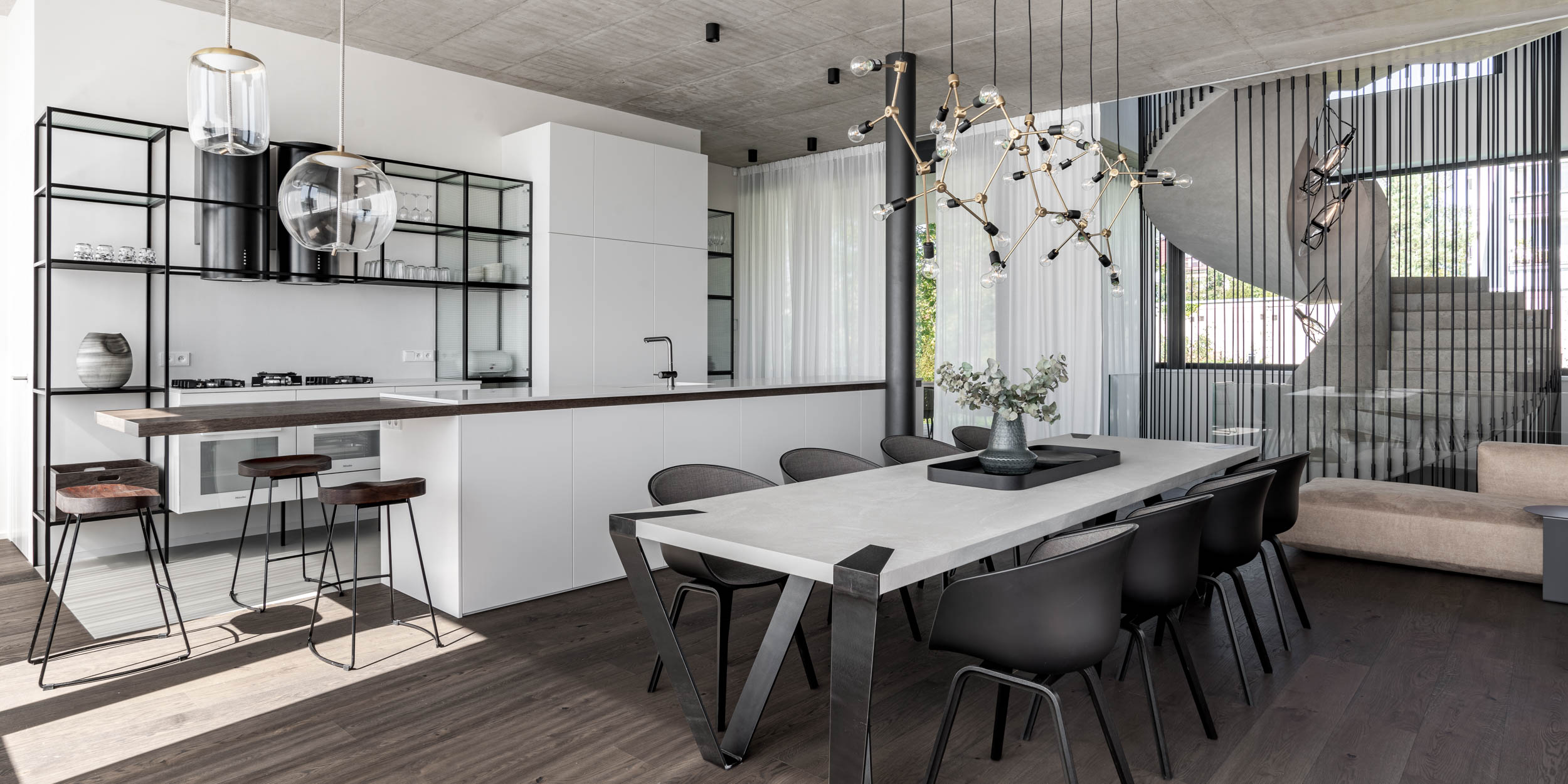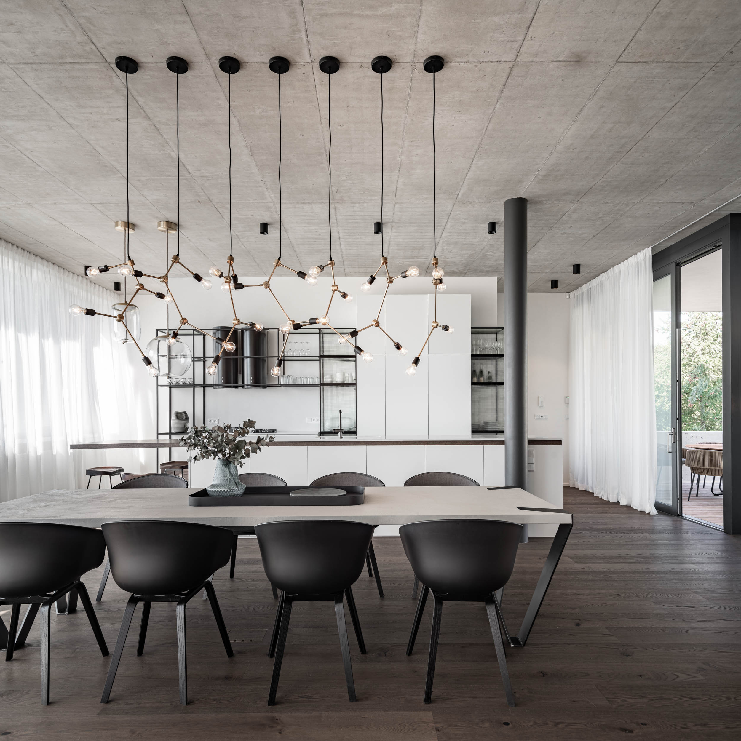 There is never enough steel. In addition to concrete, we also love raw steel, especially in furniture. For this project, we won with steel hanging shelves and a specially shaped dining table base. The subtle bluish pattern of hot-rolled steel is incredibly sexy. And in combination with concrete, it is beautiful.To avoid it being just industrial, we love combining rawness and delicacy. In this case, you’ll find small details in brass – such as on the light fixtures. The entire space is then framed by airy shading, which provides the open and glazed interior with the necessary privacy while beautifully waving in the summer breeze when the windows are open.
