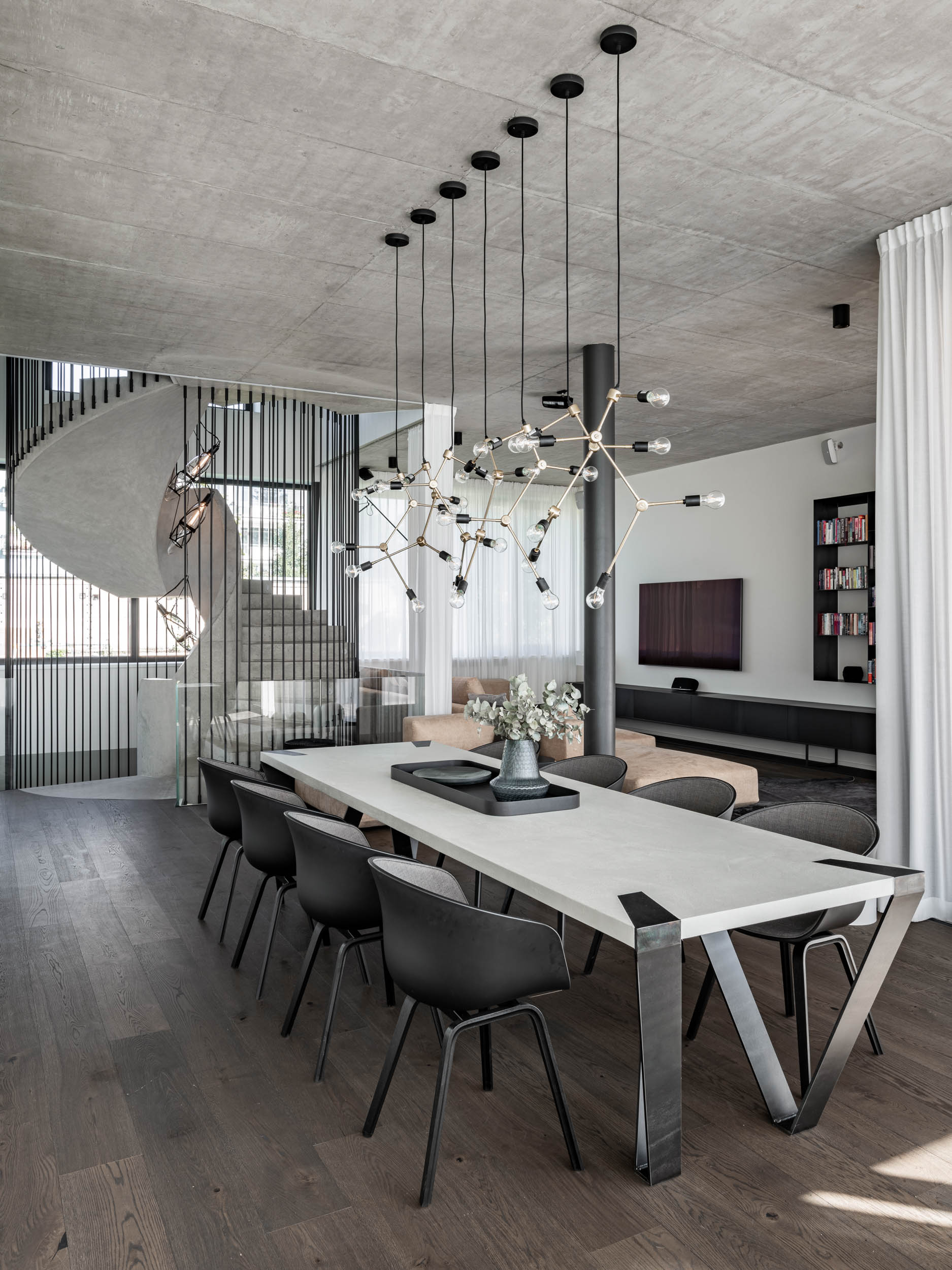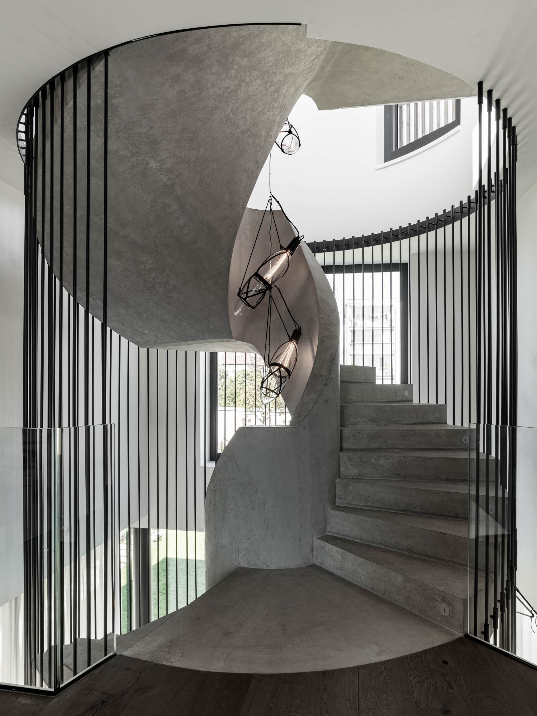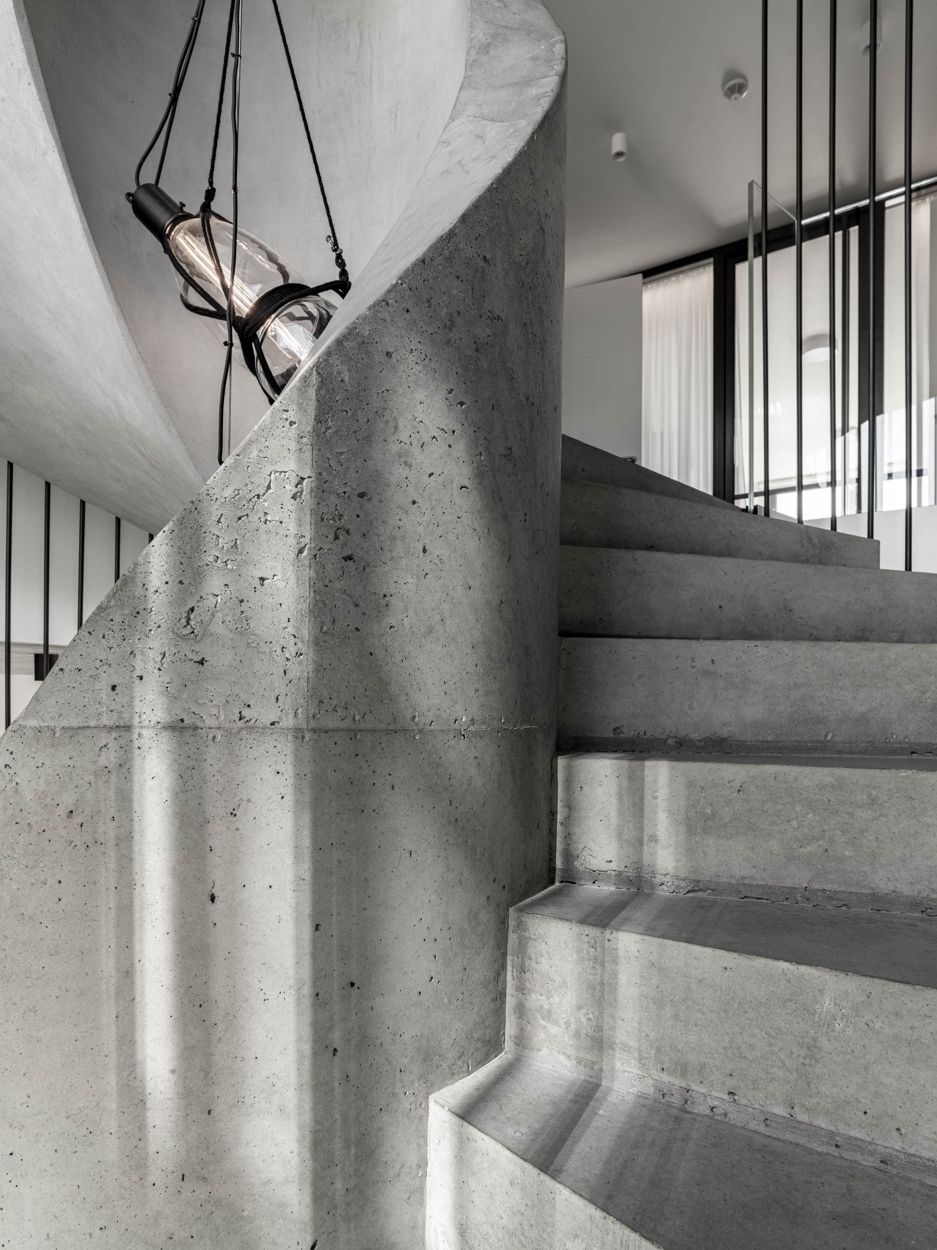Therefore, we chose the option with a tubular rod structure around the entire staircase spanning three levels, and a glass railing in the open space of the living room. The entire staircase is cast in concrete, and it was extremely challenging to prepare the anchoring for the steel rods and the built-in lighting for the steps with such precision. Does anyone still think that interiors are about furniture? To enhance the impact of the staircase, we suspended light fixtures in its center and finished it with a fine plaster coat.