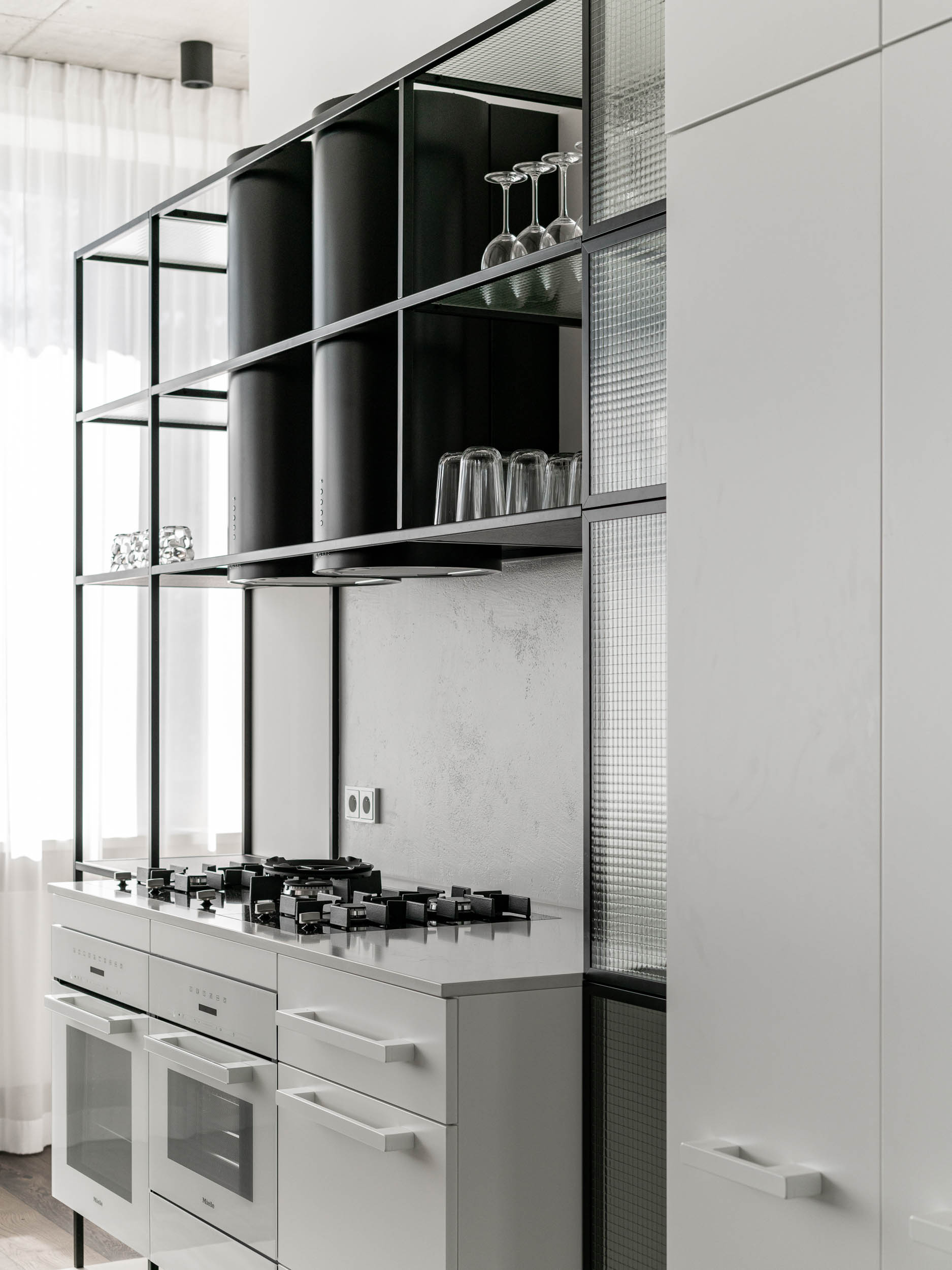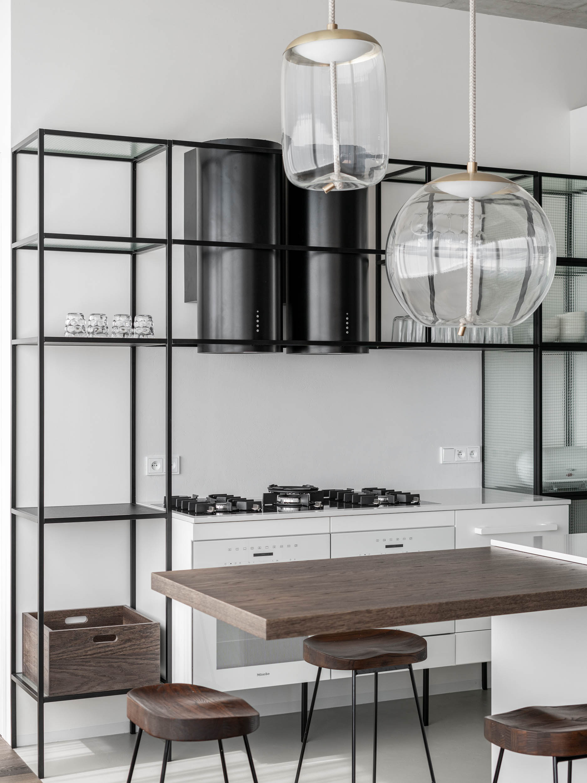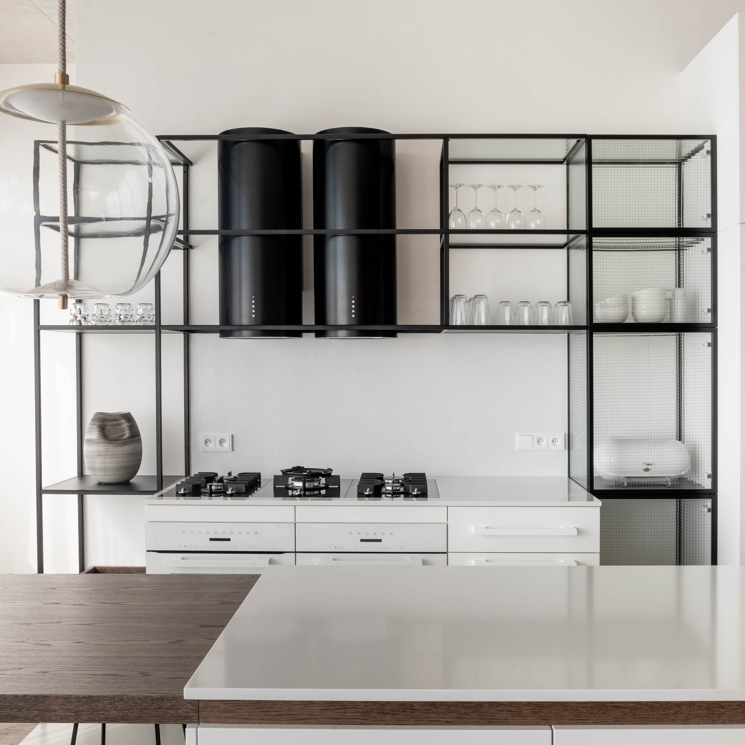 We all probably remember the most vulgar wire glass in every elevator from our childhood. That was before all the elevators had to be replaced with solid doors. We rehabilitated wire glass and used it in the kitchen furniture. Since we design and customize all our furniture, we can experiment. We left the upper part of the kitchen by the wall partially open with thin shelves and panels made of wire glass. A bit unconventionally, we placed two range hoods next to each other above the wide cooking surface, because certainty is key. On the island, we played with an inserted wooden board, which subtly extends from the countertop into the cantilevered bar.