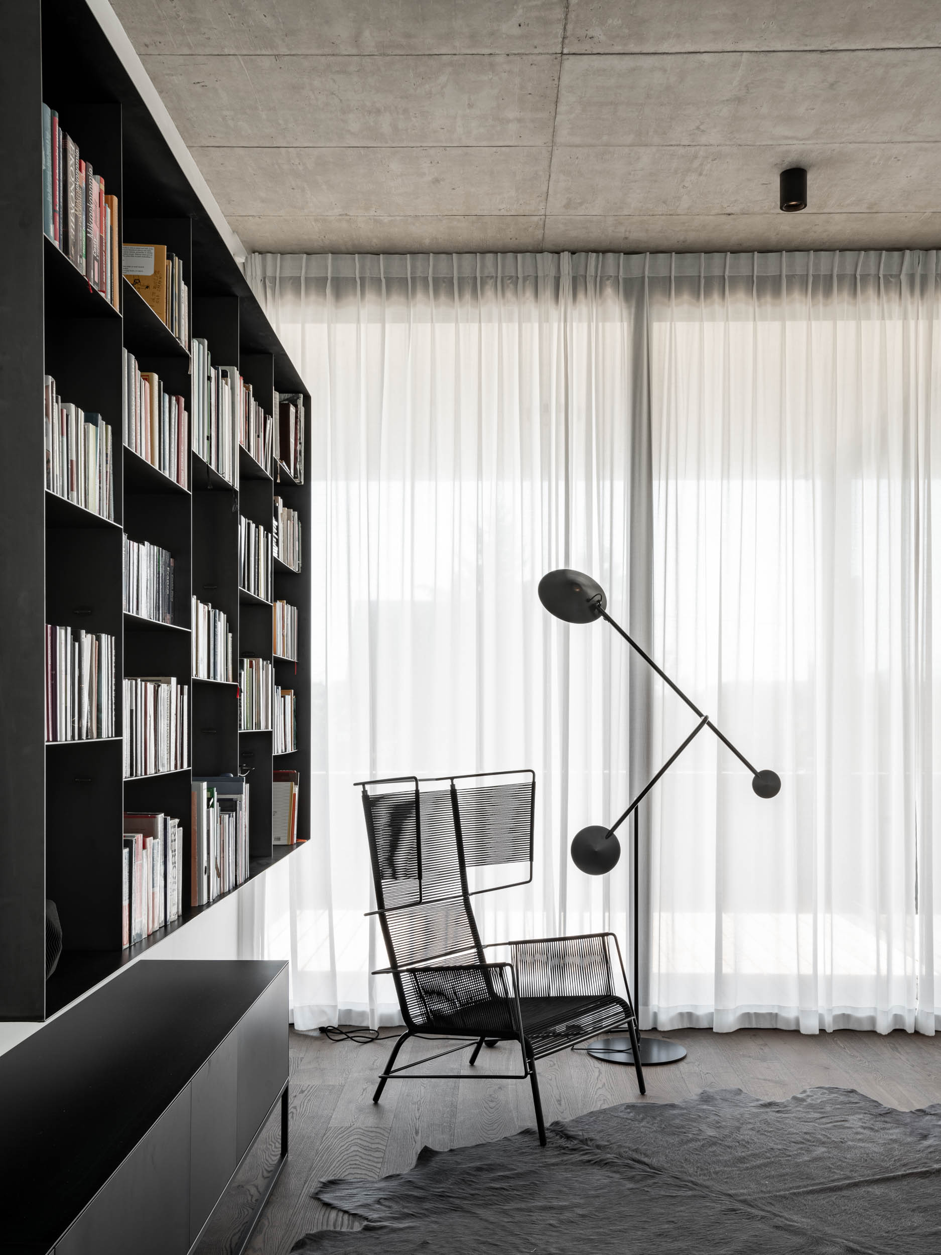 Probably the most striking part of the entire space is the living floor, which is glazed on two sides, creating a nearly functionalist space. We used monolithic constructions and left them exposed. In addition, we complemented the interior with dark oak floors and kept all the steel columns in a dark color. It might seem like there would be too much concrete in the interior, but the opposite is true. Imagine that instead of a concrete ceiling, the interior would be defined by a white drywall ceiling, and the columns would be covered with a drywall shell. Quite bland and cold, right? On the contrary, concrete adds flair to the space and, in open and minimalist interiors, it “makes the space homey,” giving it structure.